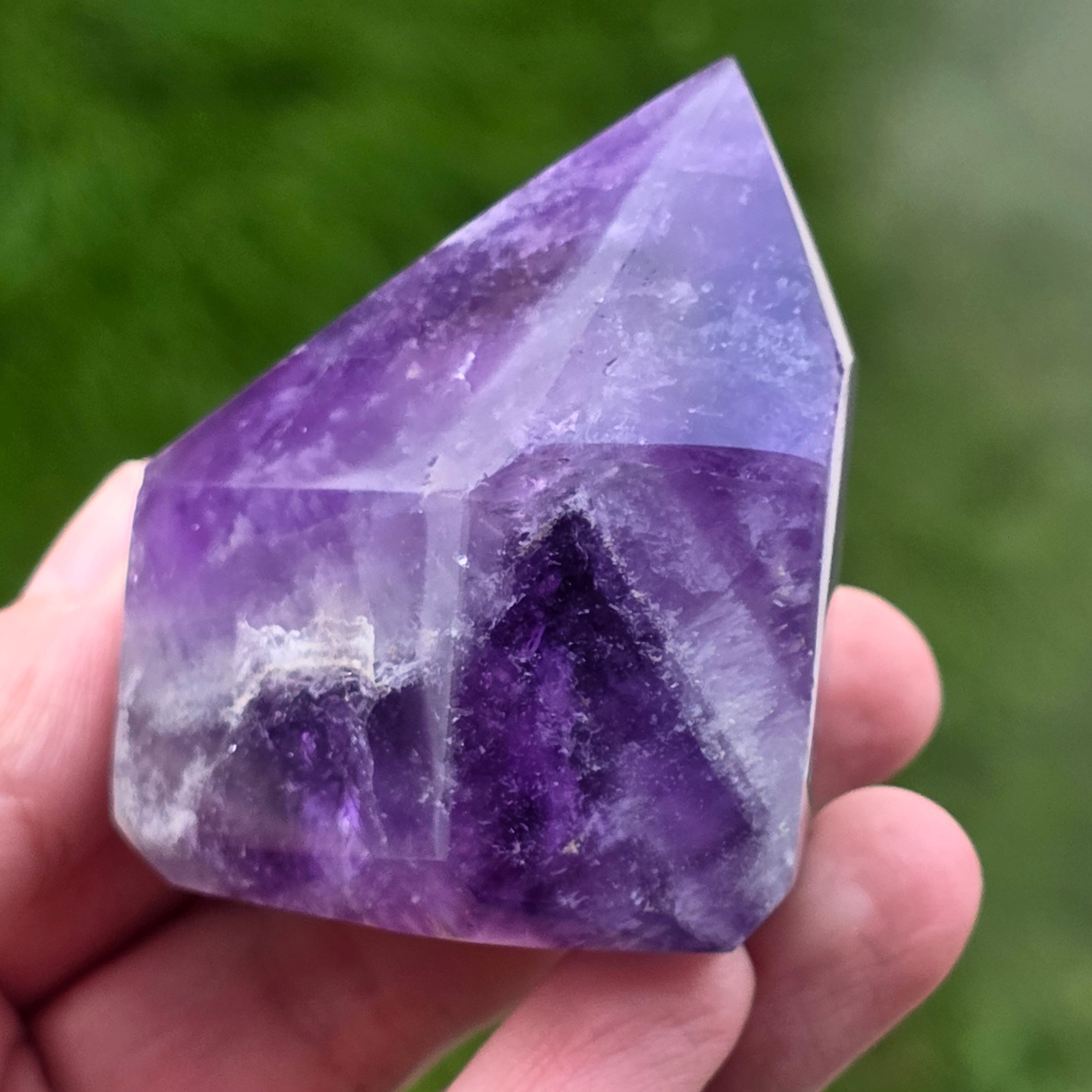 Ametistul chevron este recunoscut pentru asocierile cu chakrele coroana si al treilea ochi, crescand intuitia si capacitatea de a lua decizii.