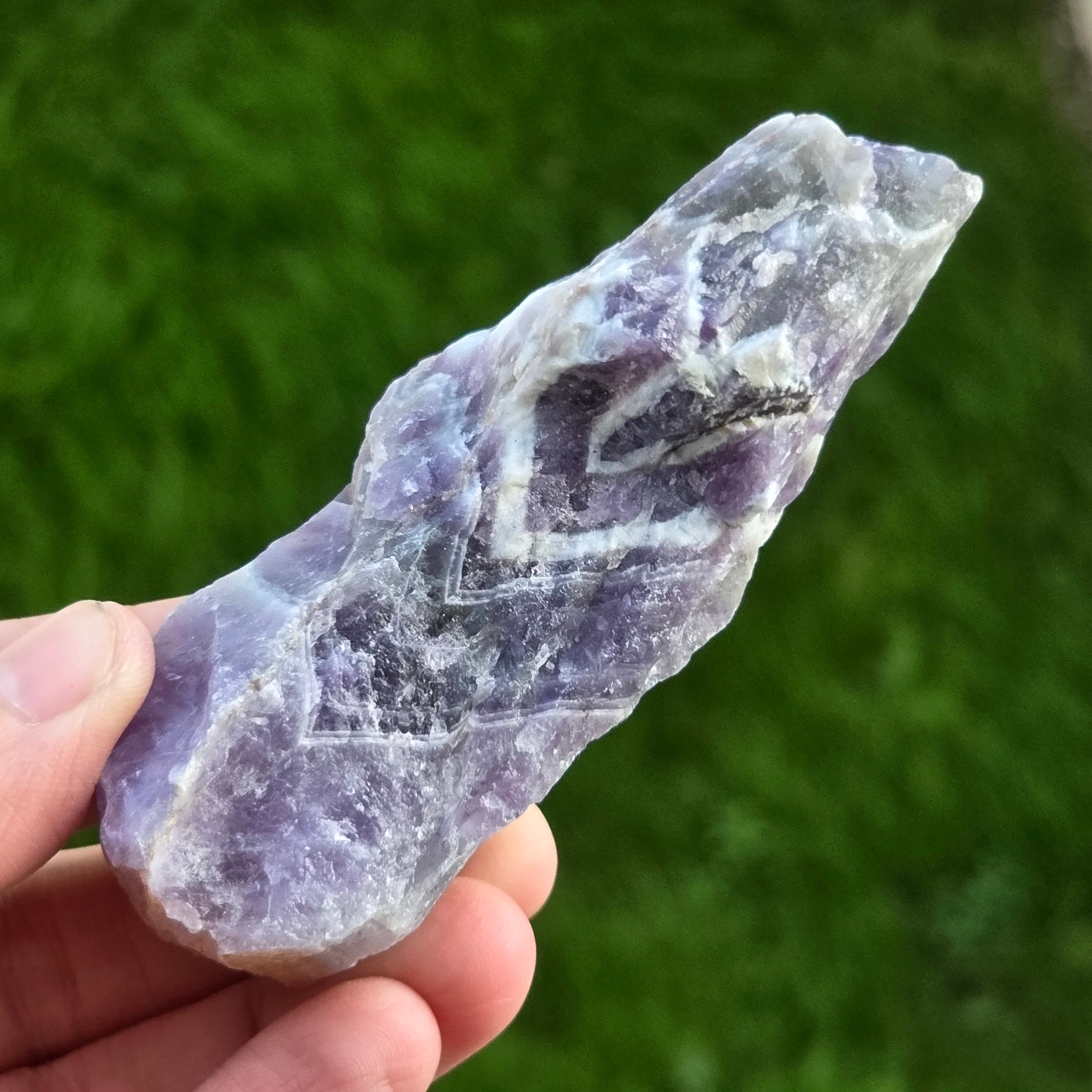 Ametistul chevron este recunoscut pentru asocierile cu chakrele coroana si al treilea ochi, crescand intuitia si capacitatea de a lua decizii.