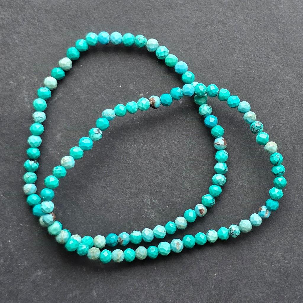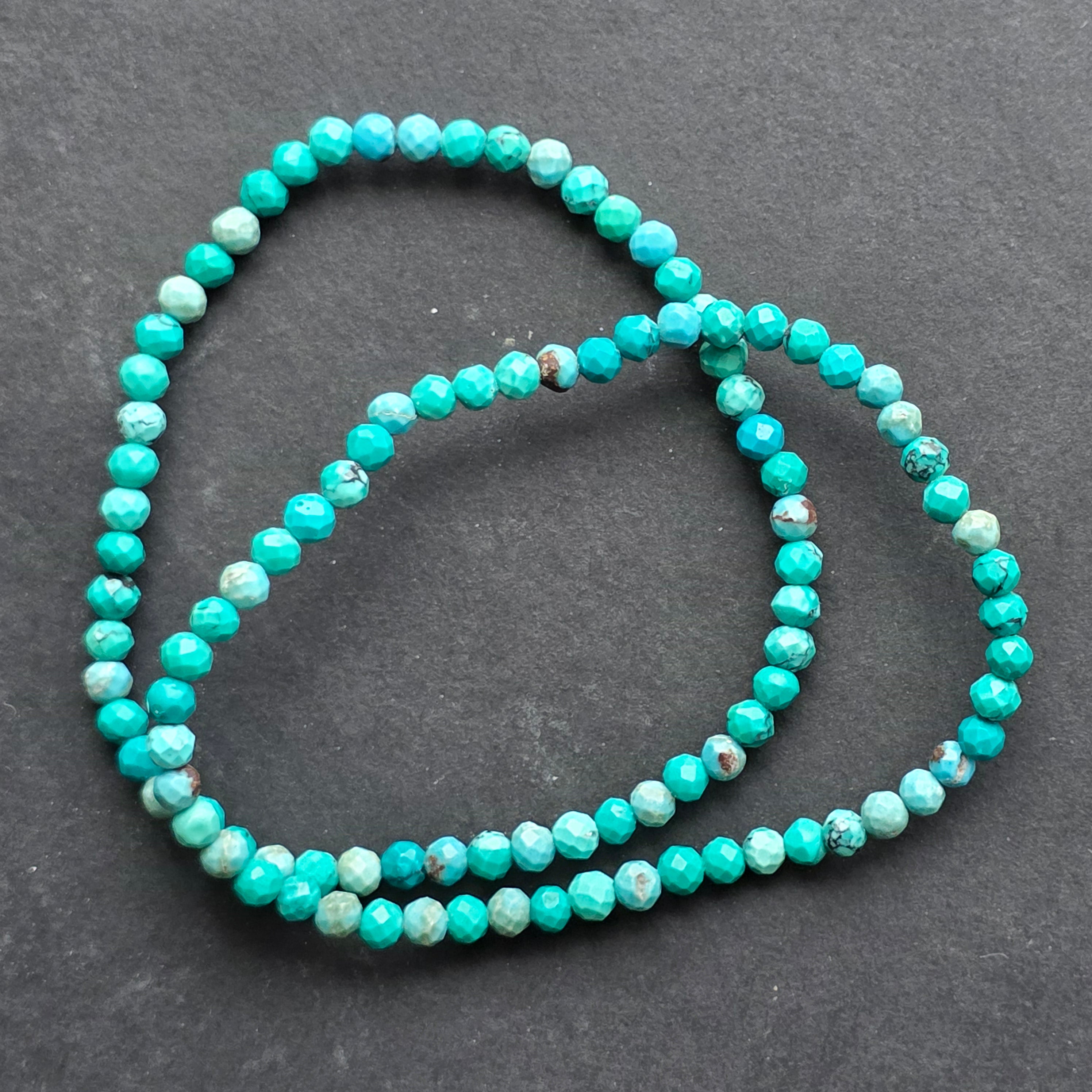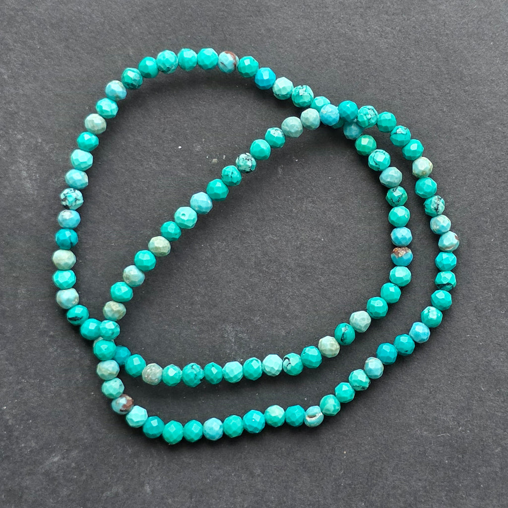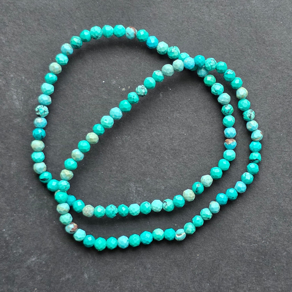 O brățară care poartă culorile cerului și ale deșertului, îmbinate într-o strălucire atemporală. Mărgelele fațetate de turcoaz natural, cu diametrul de 4 mm, reflectă o gamă fermecătoare de tonuri albastre și verzi, cu vene fine de cupru și maro care le oferă un caracter unic și pământiu. Strălucirea lor delicată aduce un aer de pace, protecție și noblețe discretă.