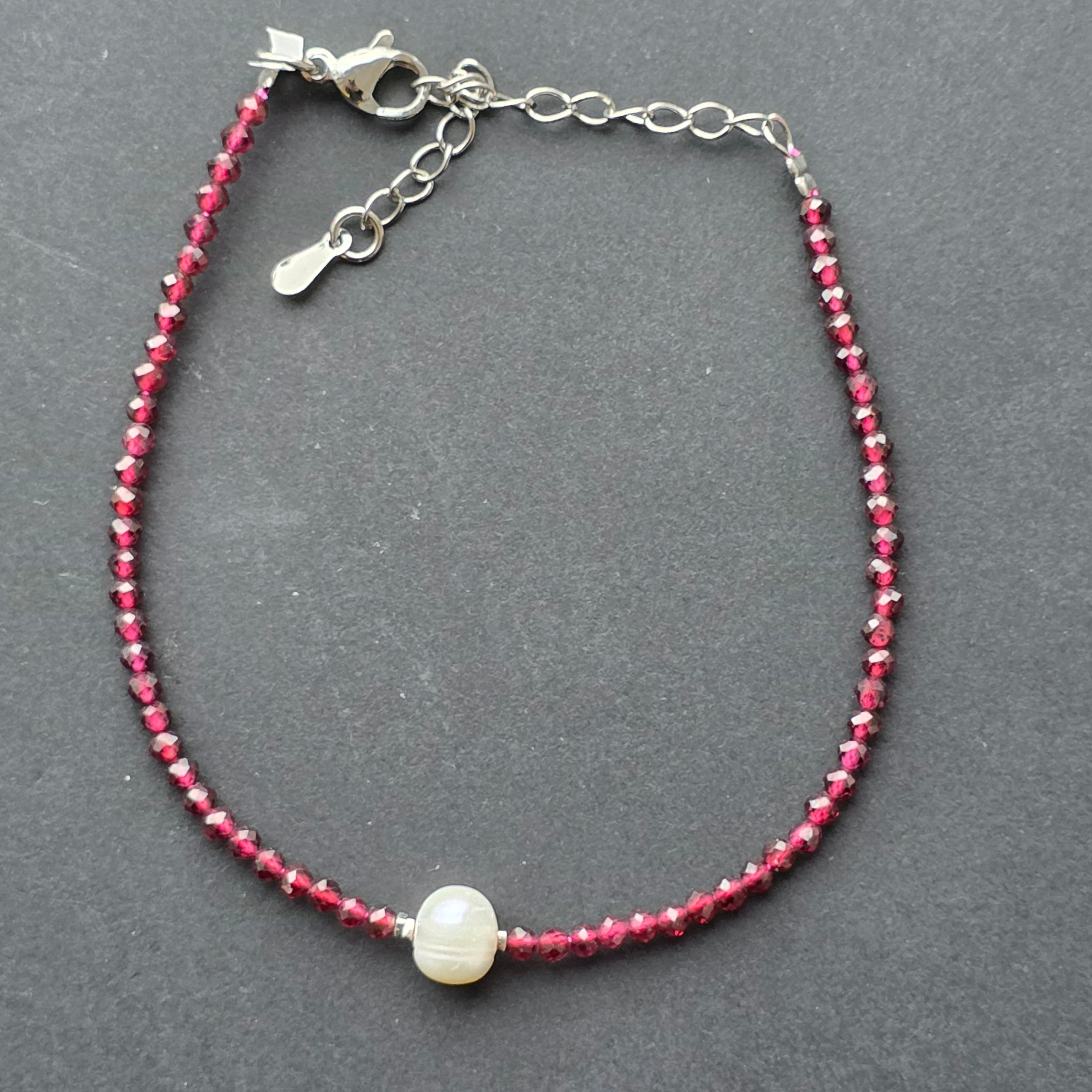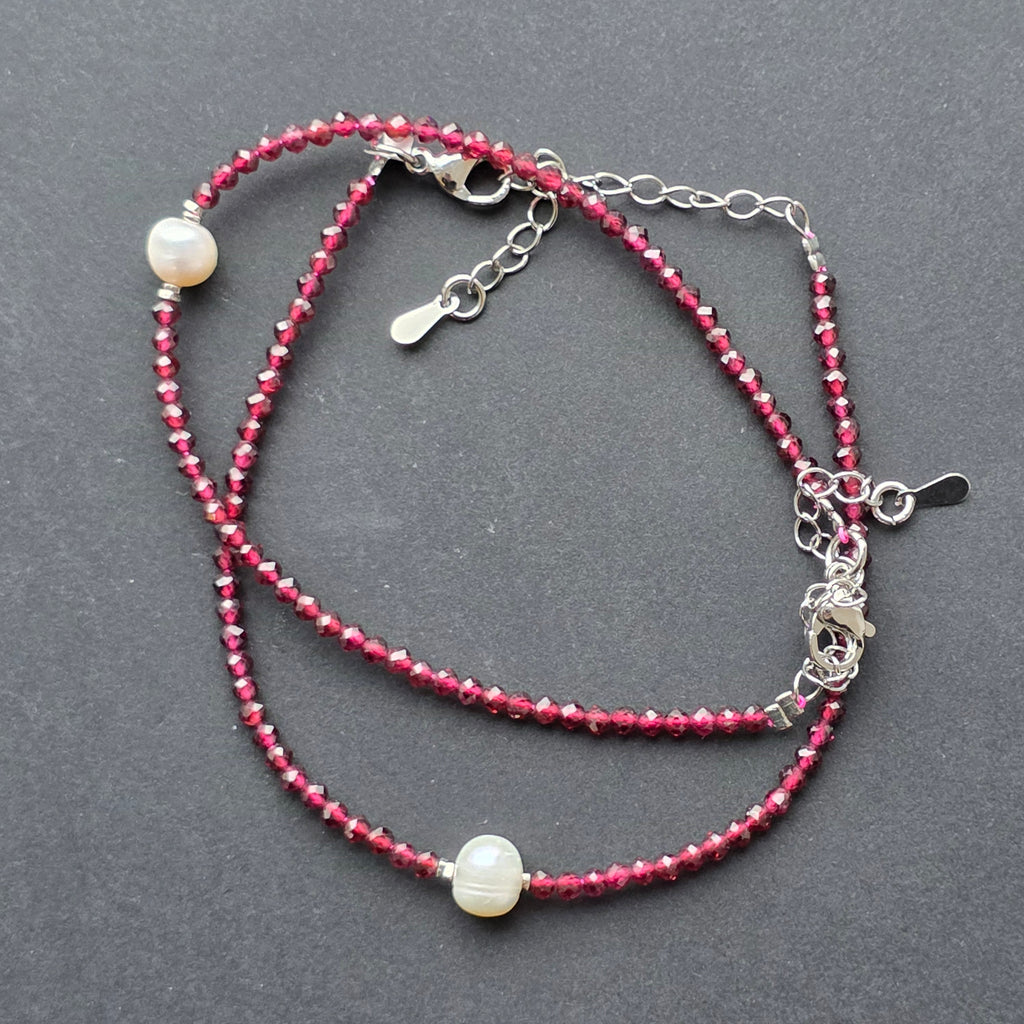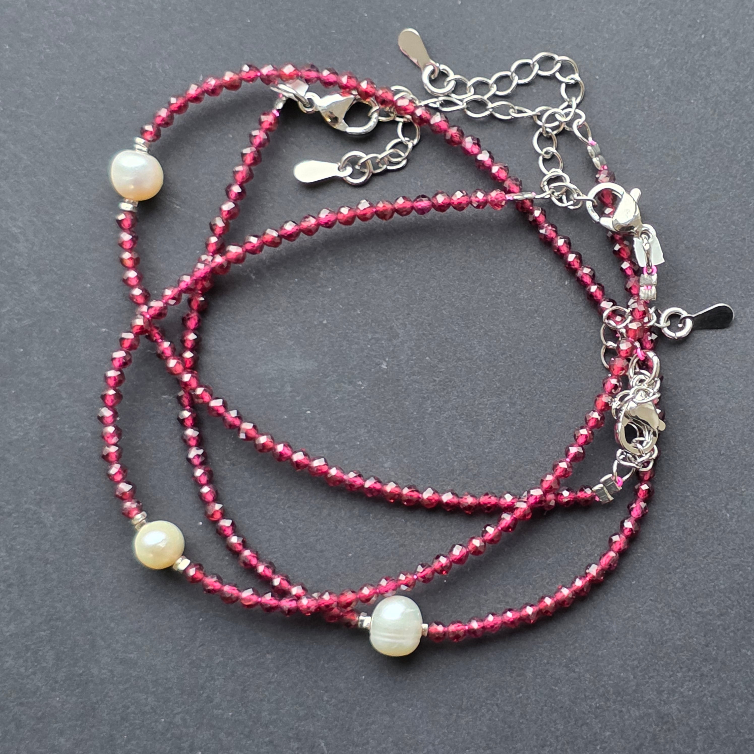 Pietre: granat natural fațetat 2–2,5 mm + perlă