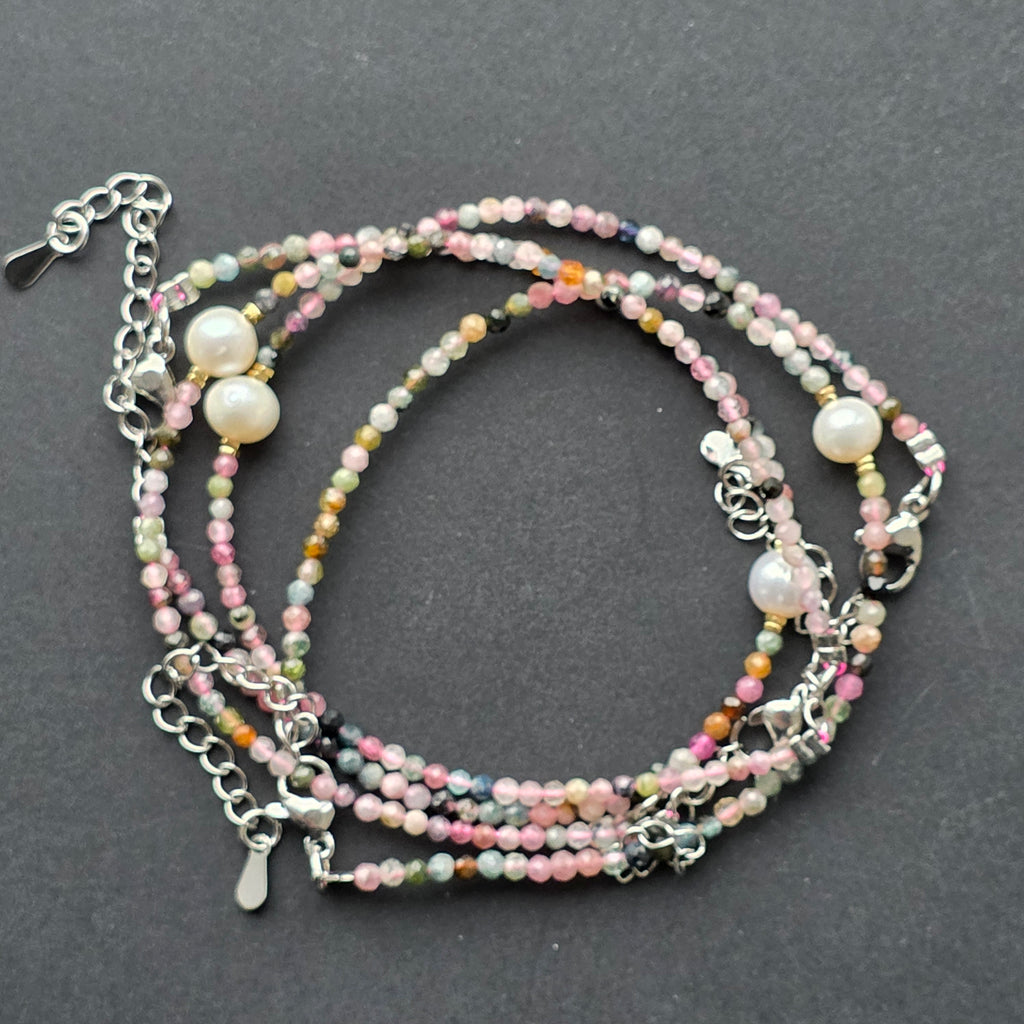 Brățara din turmalină mix este un mic univers de culoare purtat la încheietură. Pietricelele rotunjite natural, fiecare cu forma ei organică, păstrează farmecul autentic al turmalinei în toate nuanțele sale: roz delicat, verde luminos, galben cald, albastru profund, negru misterios. Fiecare mărgea are propriul său ton, propria transparență și propria poveste minerală, astfel încât nicio brățară nu este identică cu alta.