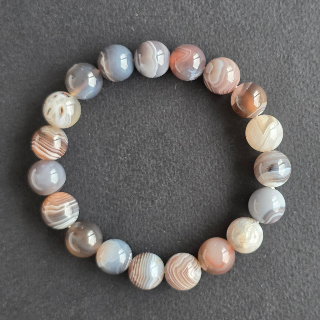 Agatul de Botswana este considerat o piatră a echilibrului și a liniștii interioare. Se spune că ajută la reducerea stresului, claritatea gândurilor și consolidarea stabilității emoționale. Este un cristal care invită la calm, răbdare și reconectare cu ritmul natural al vieții.