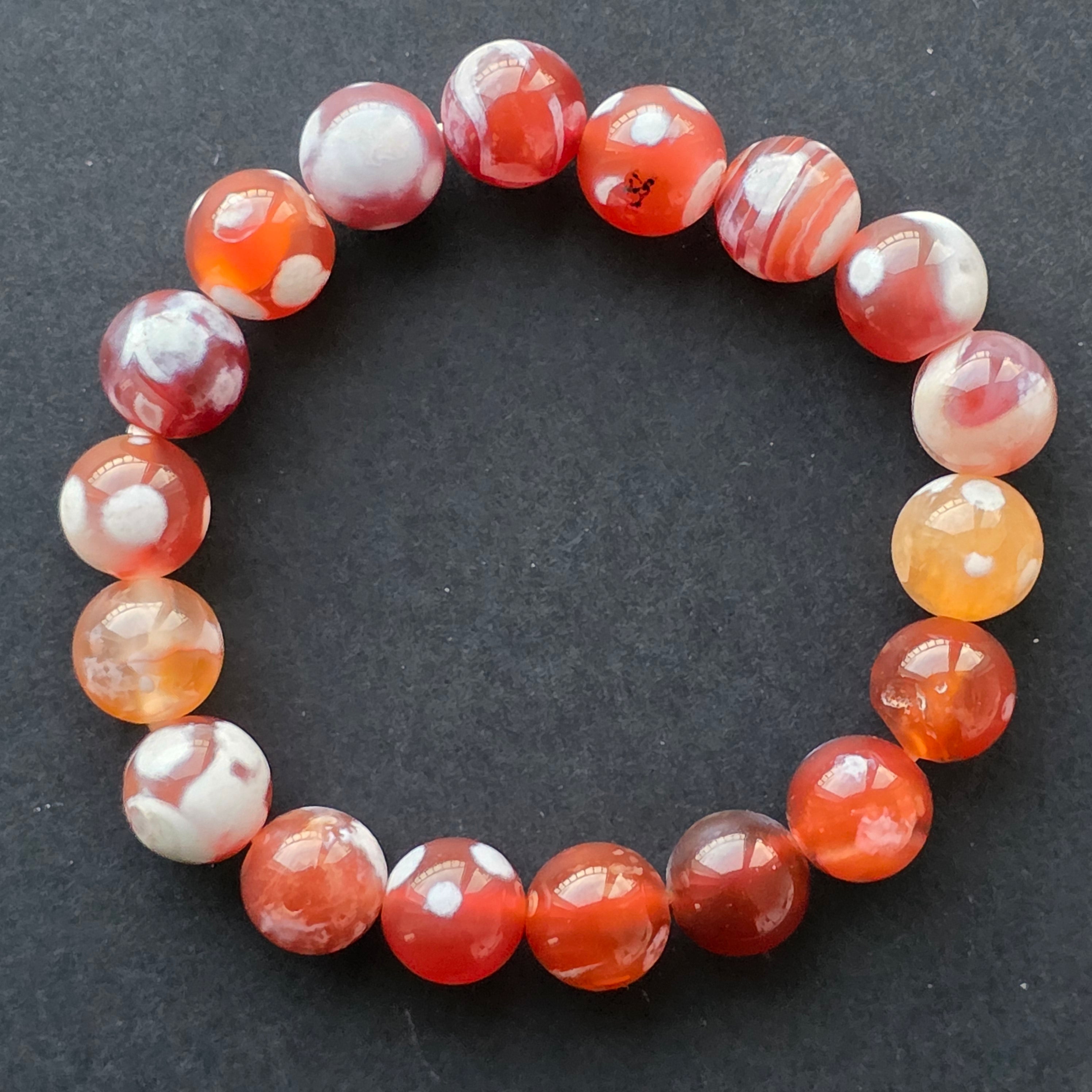 • Piatra: agat portocaliu (agate fire) – mărgele sferice 10–11 mm