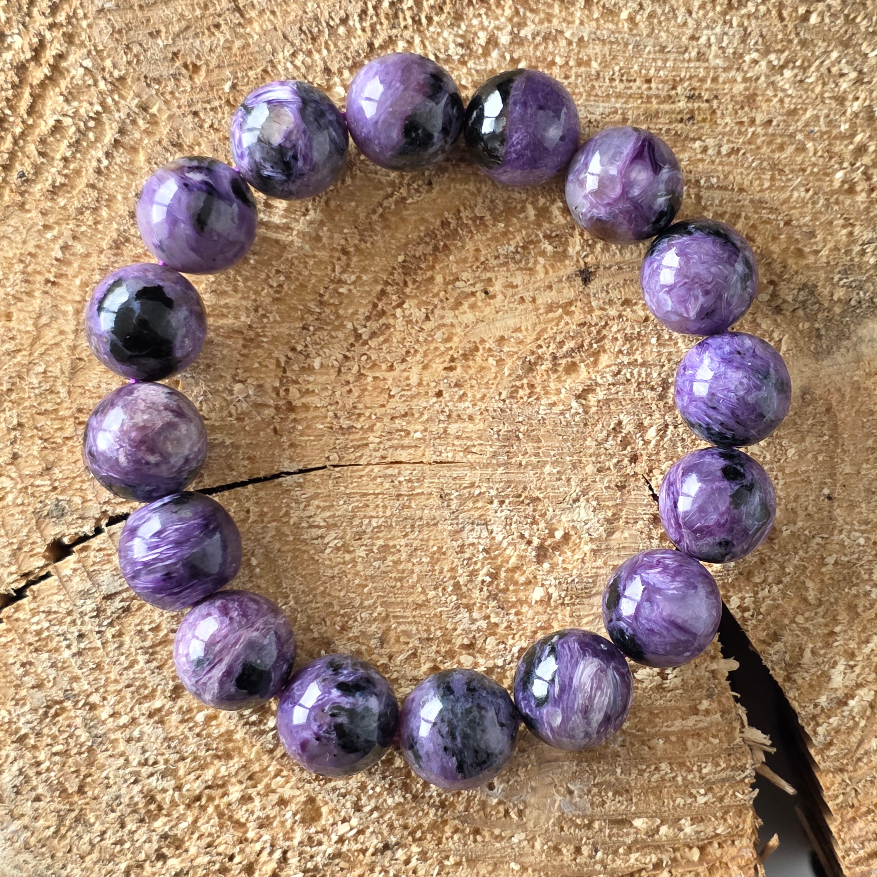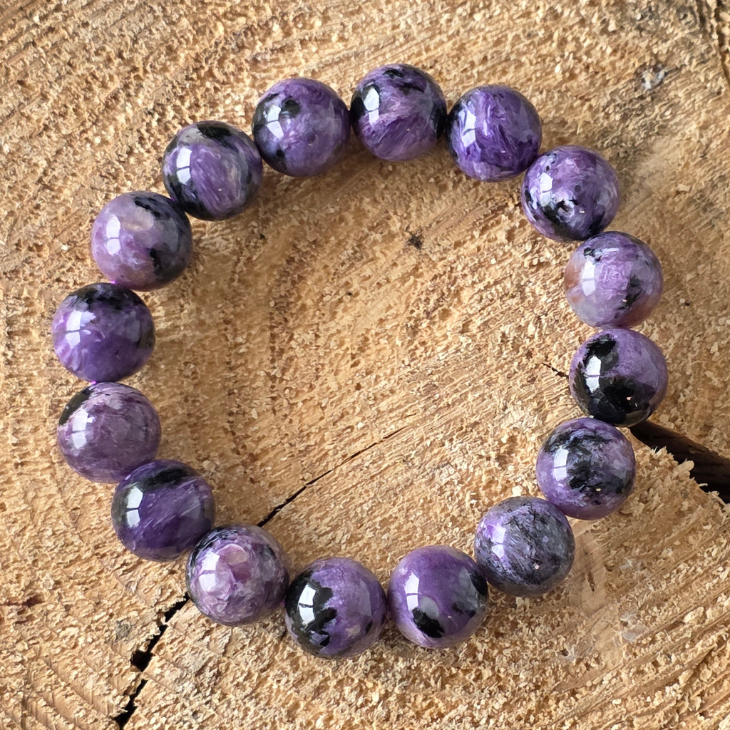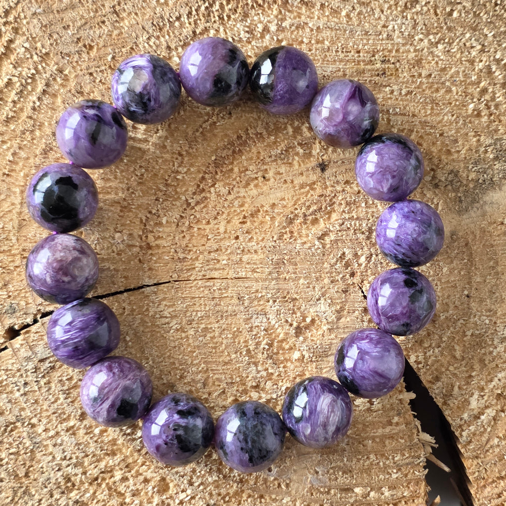 O brățară spectaculoasă, ce poartă în ea misterul amurgurilor nordice. Mărgelele rotunde de 12 mm din charoit natural, șlefuite manual până la un luciu mătăsos, dezvăluie vortexuri fascinante de violet, lavandă, gri sidefat și negru profund. Fiecare piatră este o lume în sine, cu texturi fluide și irizații care par să danseze în lumină – o adevărată operă a naturii, unică în felul ei.