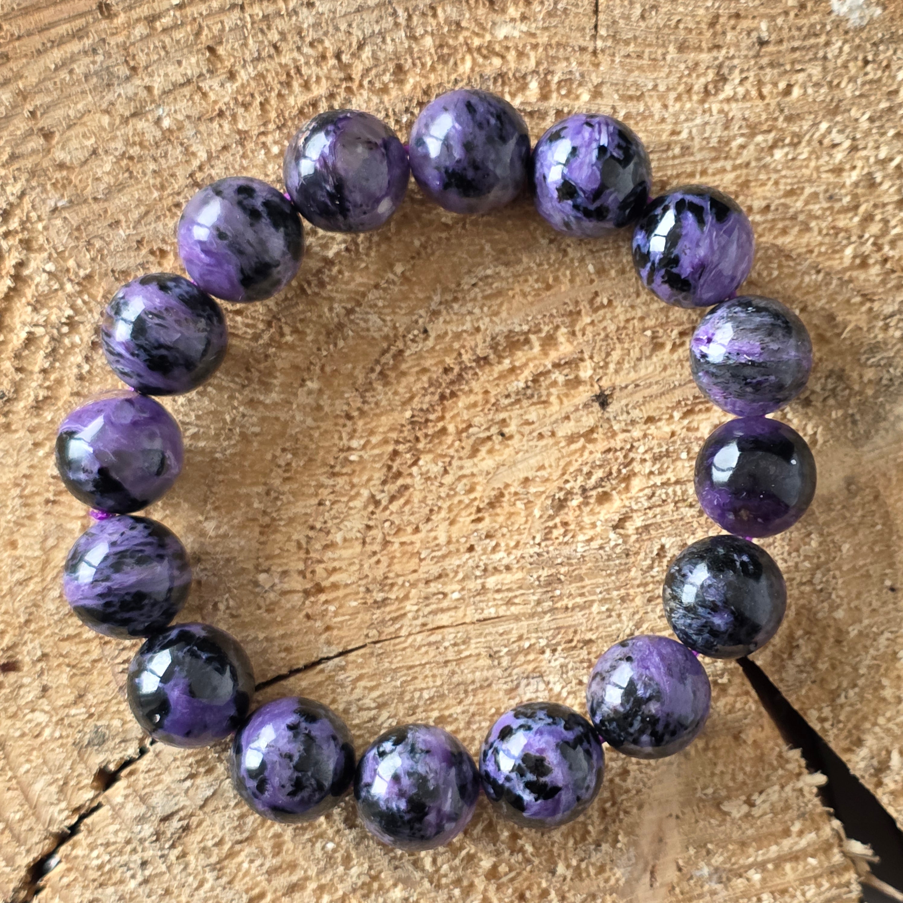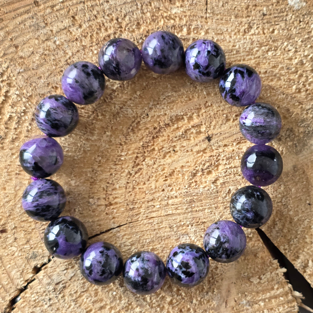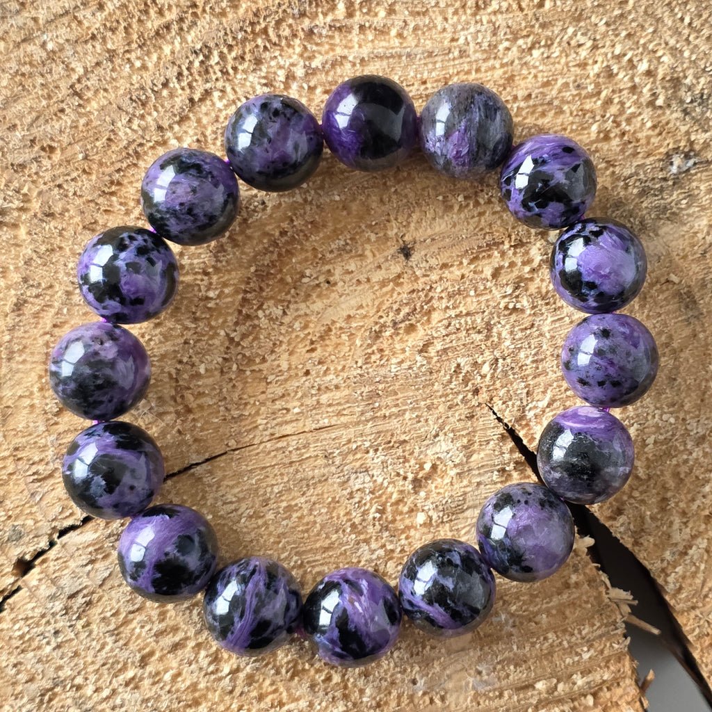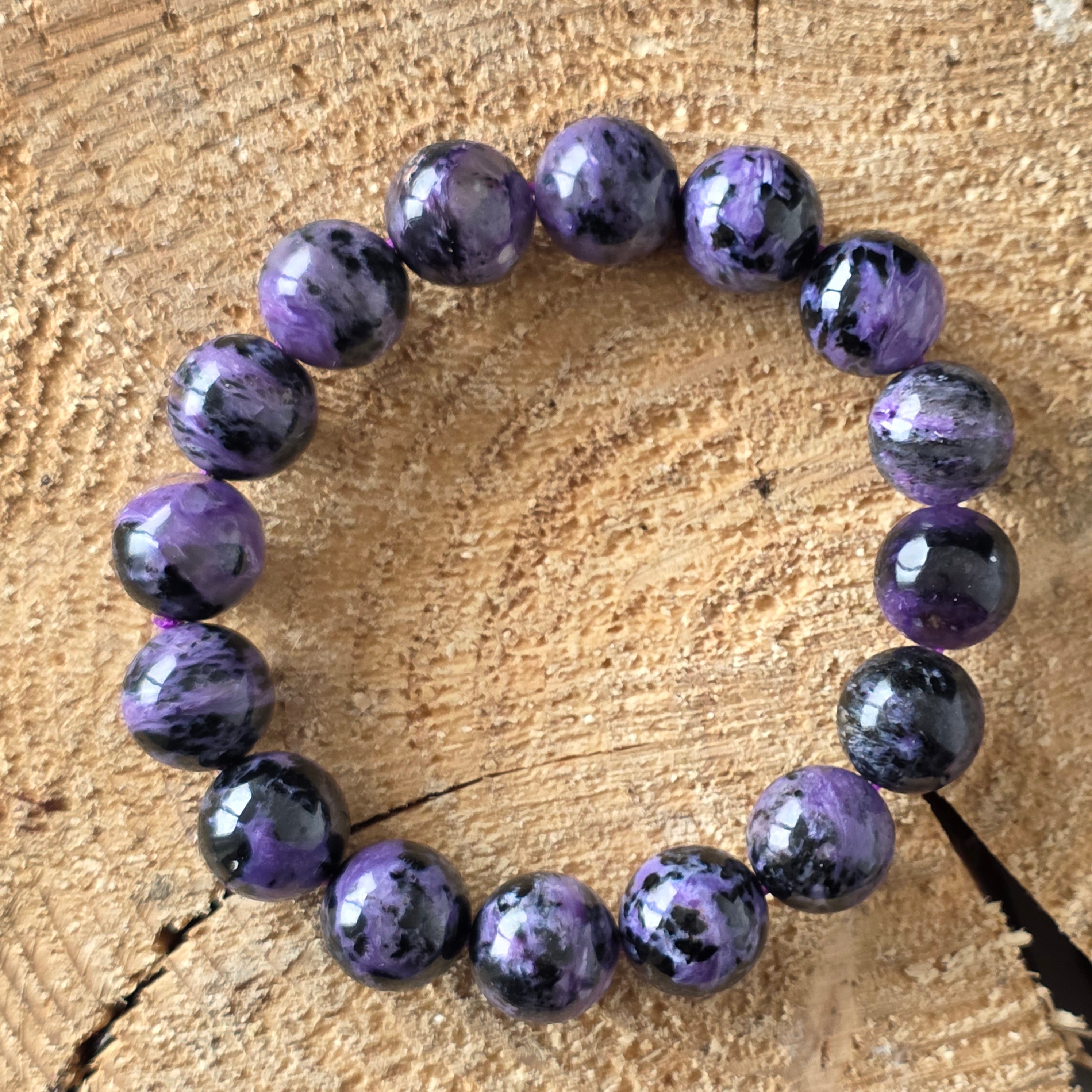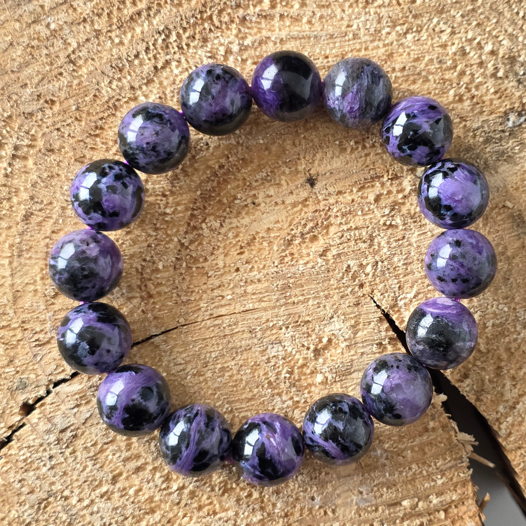 O brățară spectaculoasă, ce poartă în ea misterul amurgurilor nordice. Mărgelele rotunde de 12 mm din charoit natural, șlefuite manual până la un luciu mătăsos, dezvăluie vortexuri fascinante de violet, lavandă, gri sidefat și negru profund. Fiecare piatră este o lume în sine, cu texturi fluide și irizații care par să danseze în lumină – o adevărată operă a naturii, unică în felul ei.