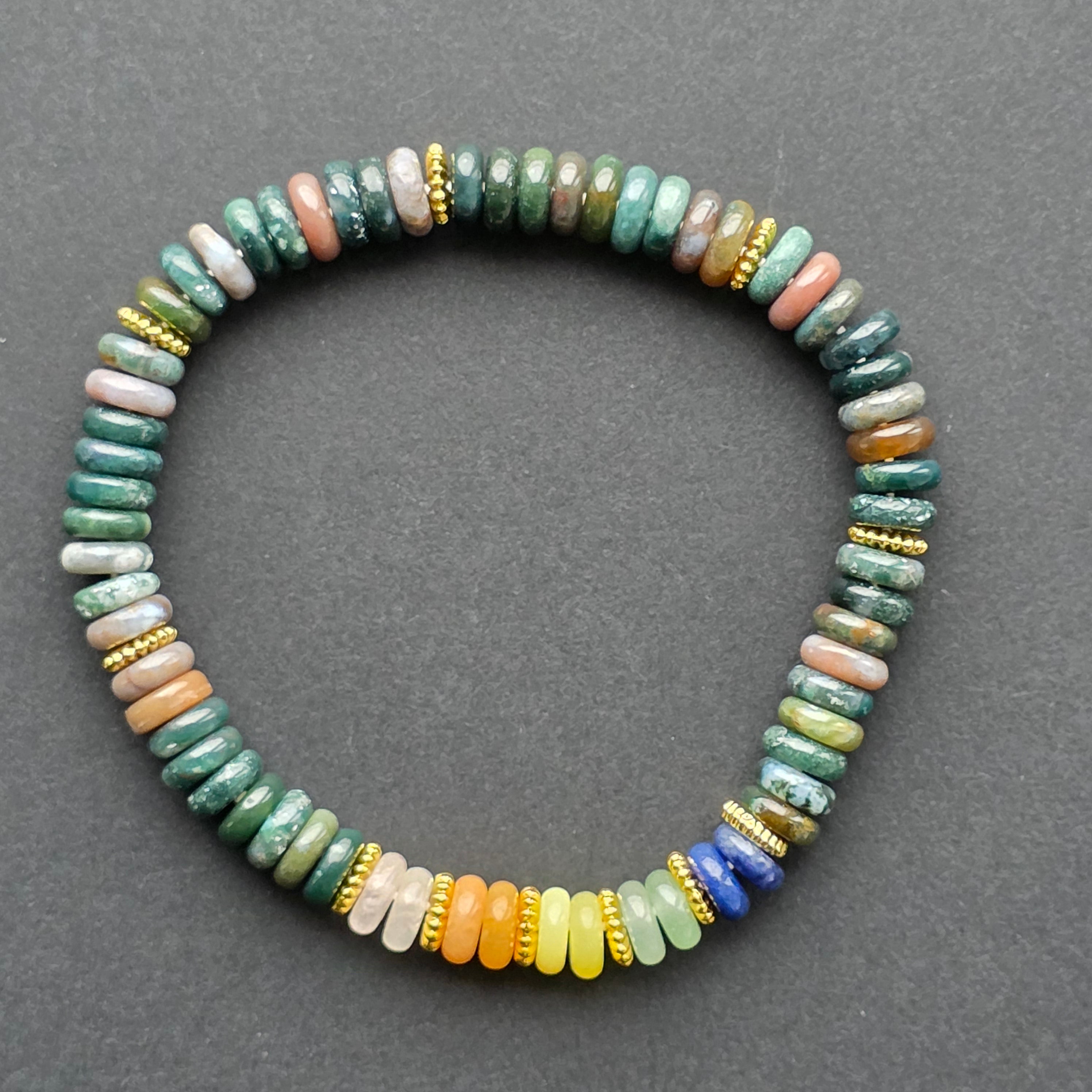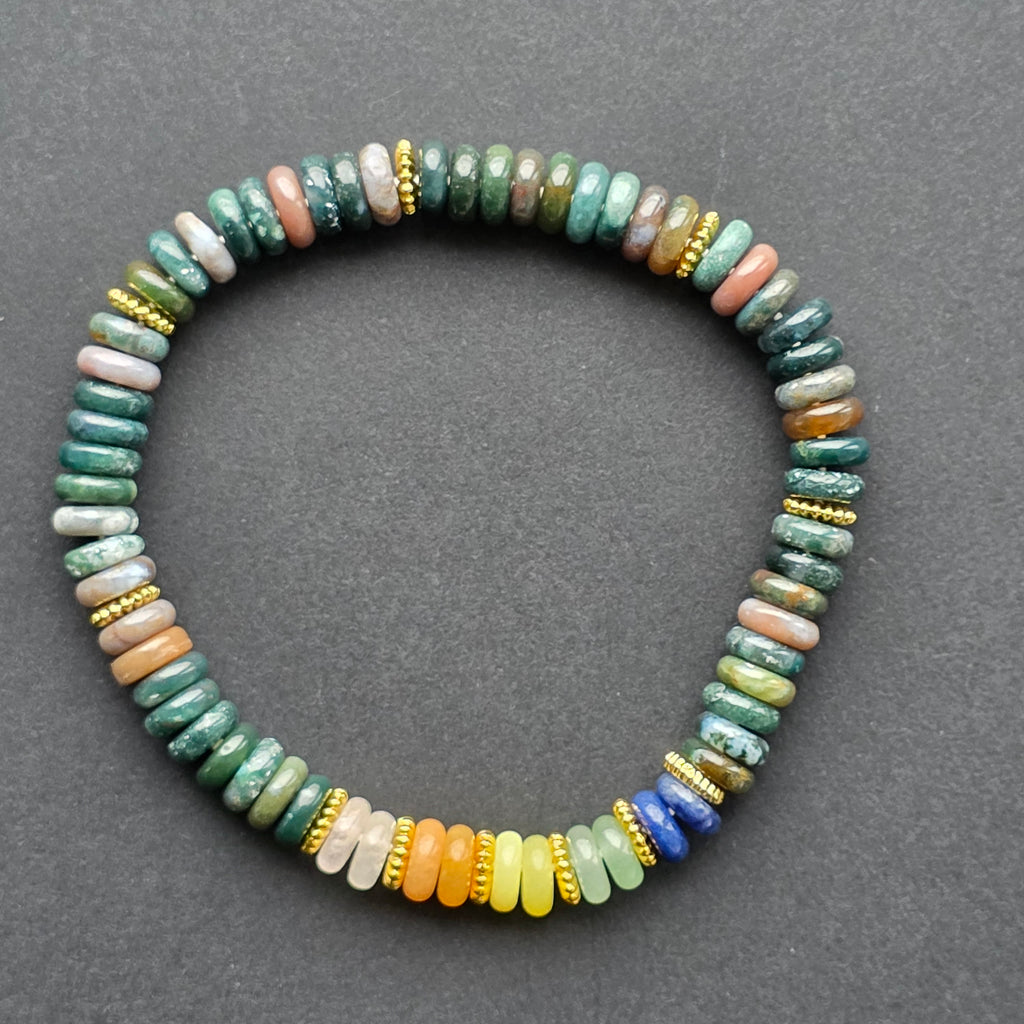 Agatul indian este recunoscut pentru diversitatea lui cromatică — o împletire organică de verde adânc, maro pământiu și tonuri discrete de gri, toate așezate în straturi naturale, exact ca în interiorul unei pietre formate în milioane de ani. Fiecare disc păstrează amprenta unică a mineralului, iar această variabilitate subtilă transformă brățara într-o piesă cu personalitate proprie.