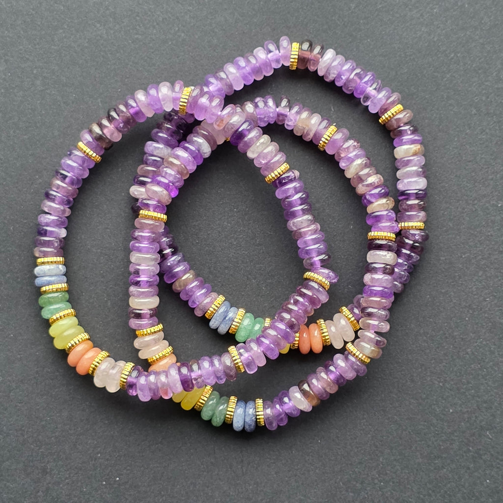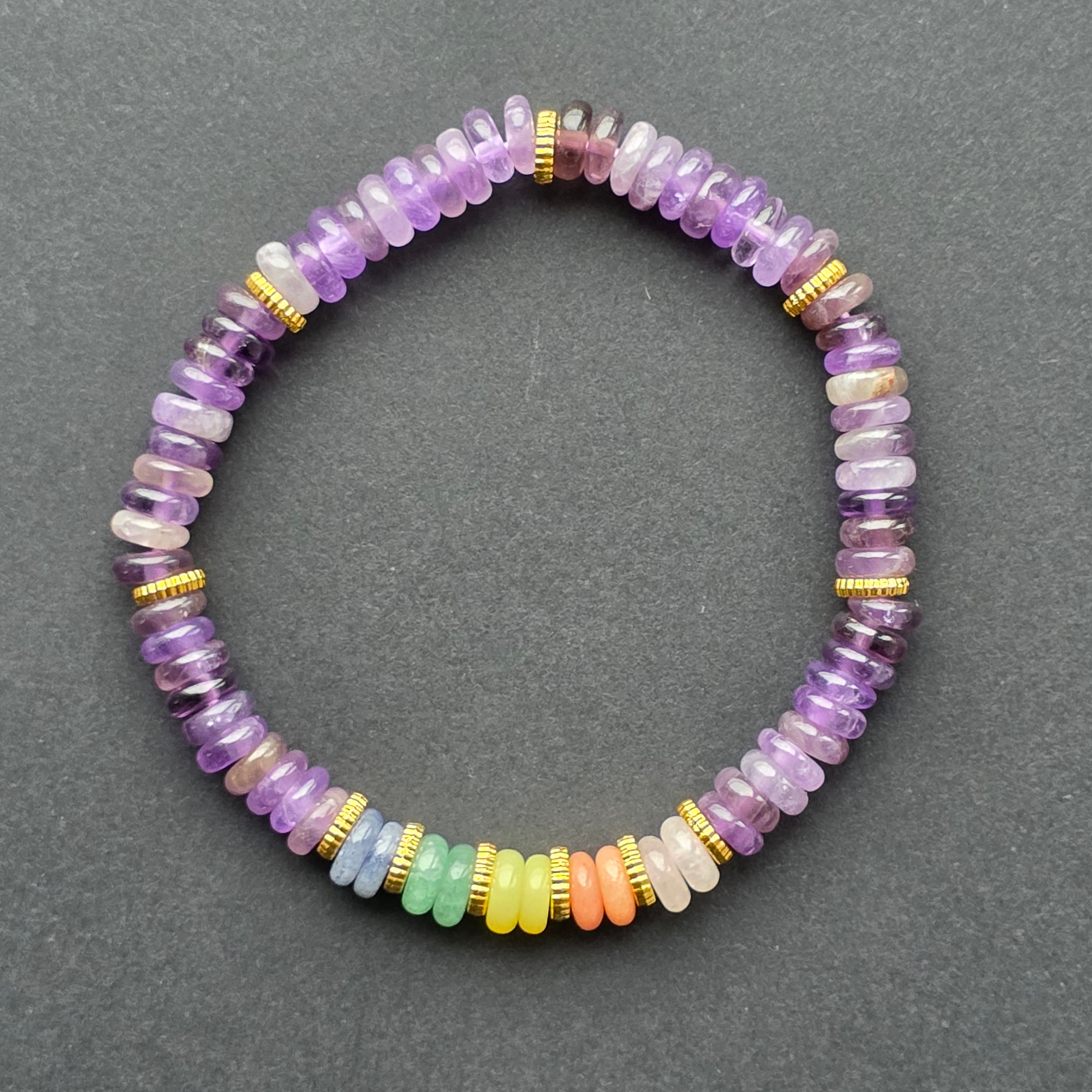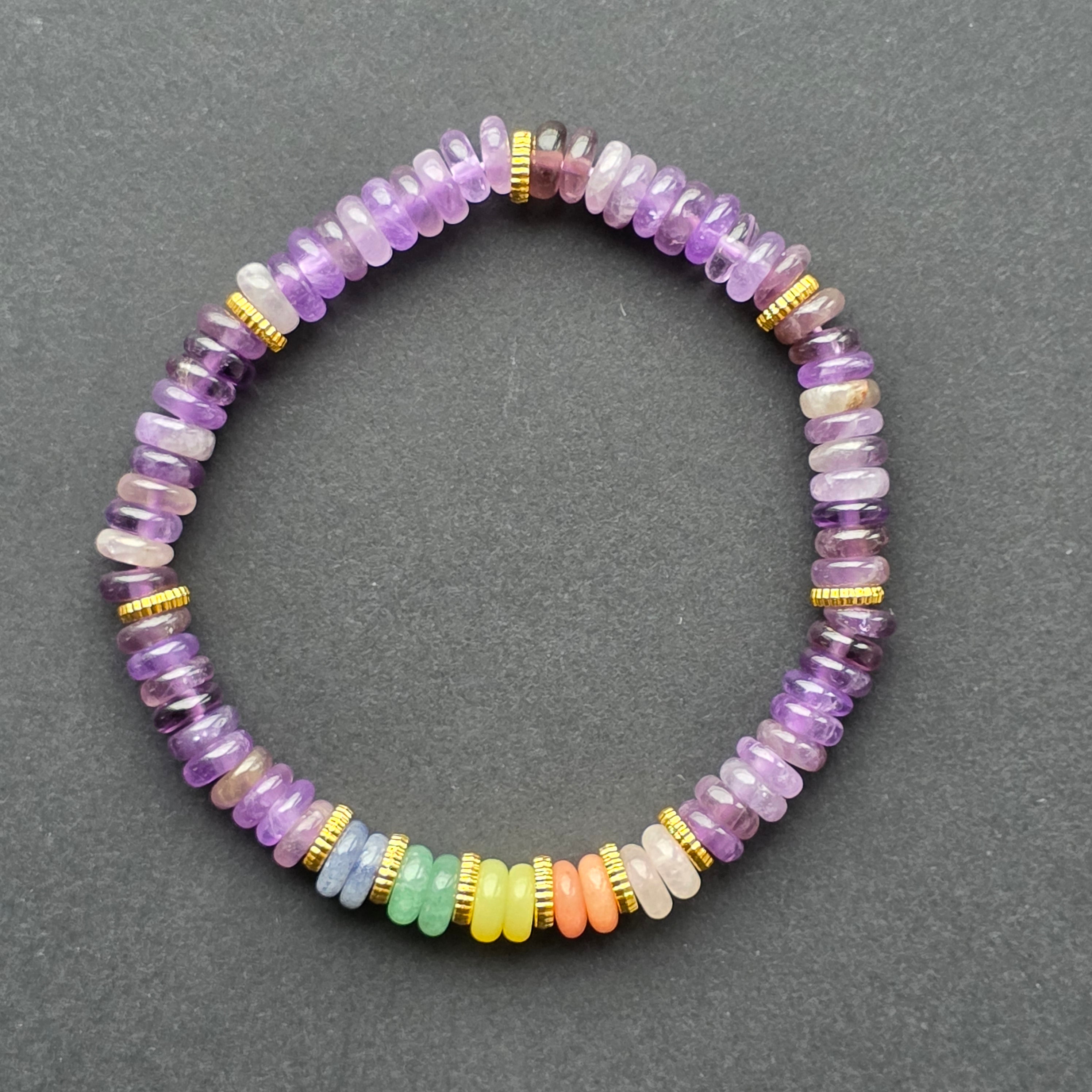 Segmentul 7 chakre introduce o explozie de culoare ce contrastează superb cu movul delicat al ametistului. Aceste nuanțe calde și vibrante creează un accent subtil, dar plin de personalitate, simbolizând armonia dintre minte, corp și spirit. Brățara devine astfel nu doar un accesoriu estetic, ci și o piesă simbolică — o reamintire a echilibrului interior și a alinierii energetice.