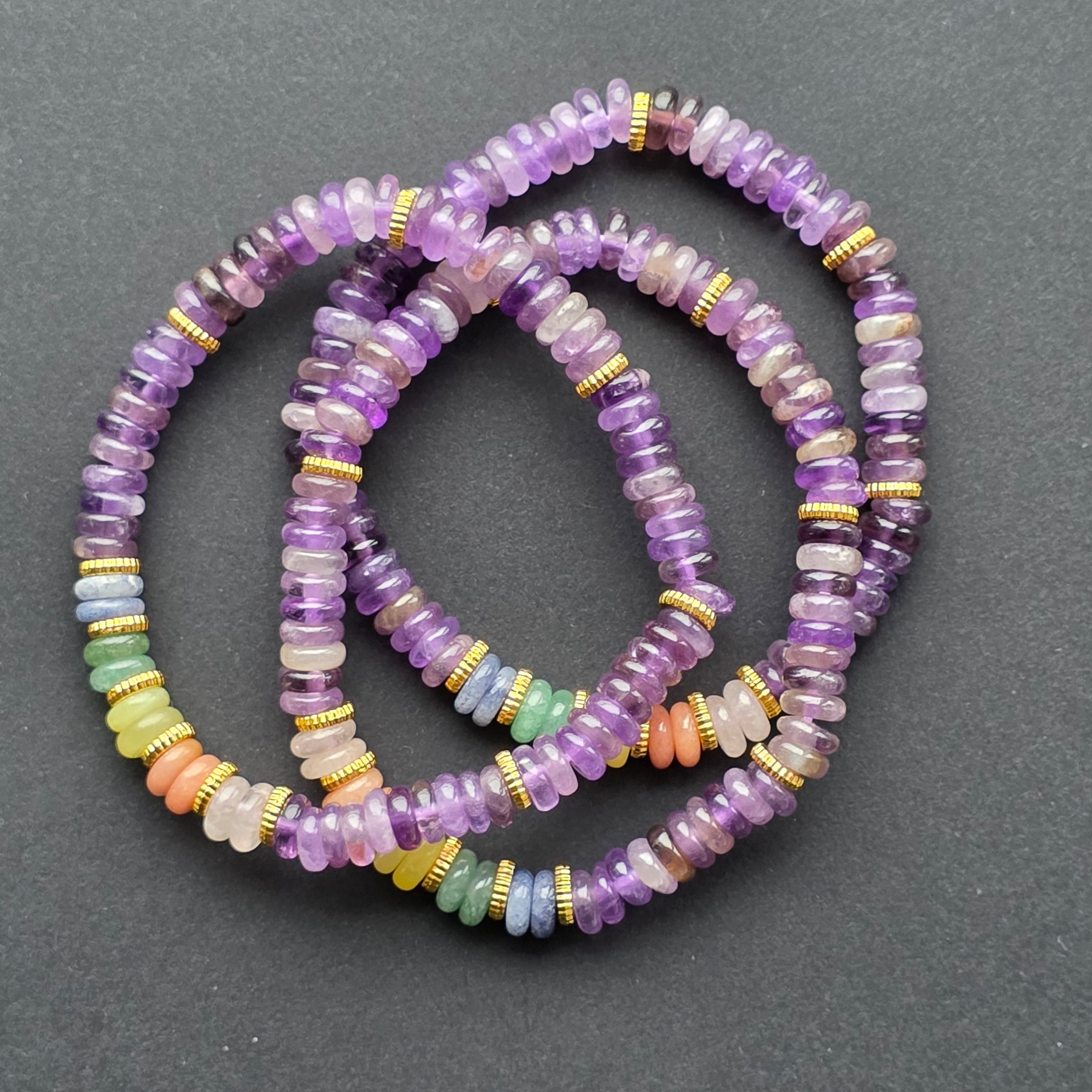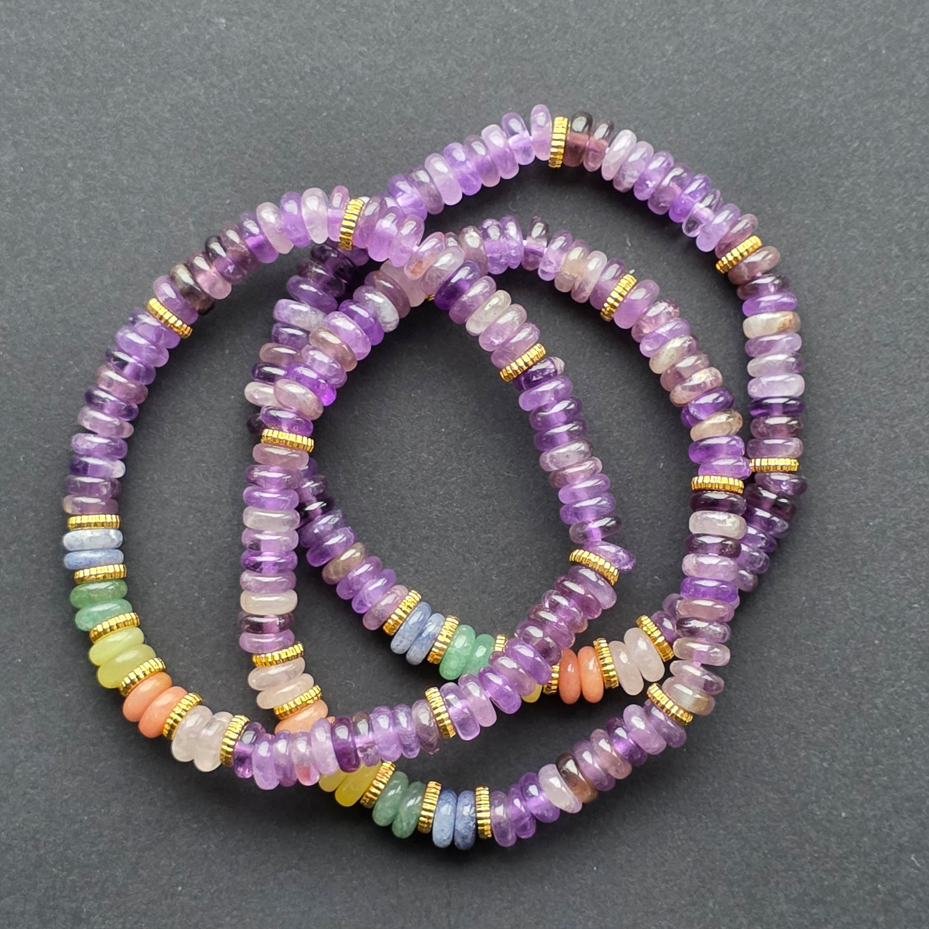 Brățara din ametist dezvăluie acel mov rafinat, translucid și profund, pentru care piatra este atât de iubită. Fiecare disc este slefuit pentru a păstra textura și luminozitatea naturale ale cristalui, rezultând un accesoriu elegant, seren și plin de armonie vizuală. Ametistul are o prezență calmă și pură, care aduce o notă de echilibru și rafinament oricărei ținute.