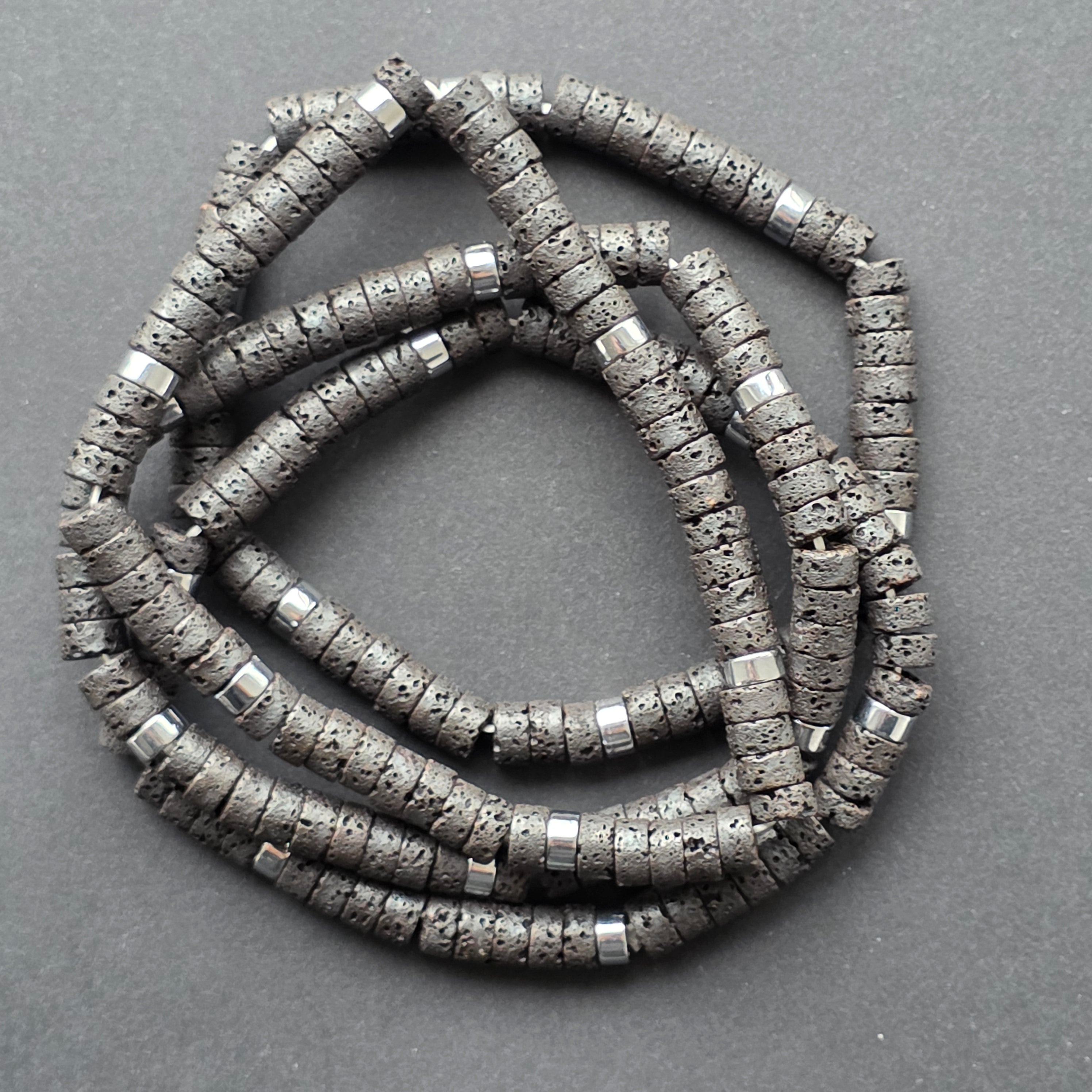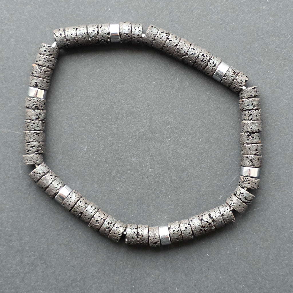 Accesoriile metalice argintii adaugă un ritm vizual modern și discret, păstrând însă personalitatea naturală a bazaltului. Este o brățară robustă, stabilă și foarte comodă la purtare, ideală pentru cei care preferă accesoriile cu un aer urban, simplu și autentic.