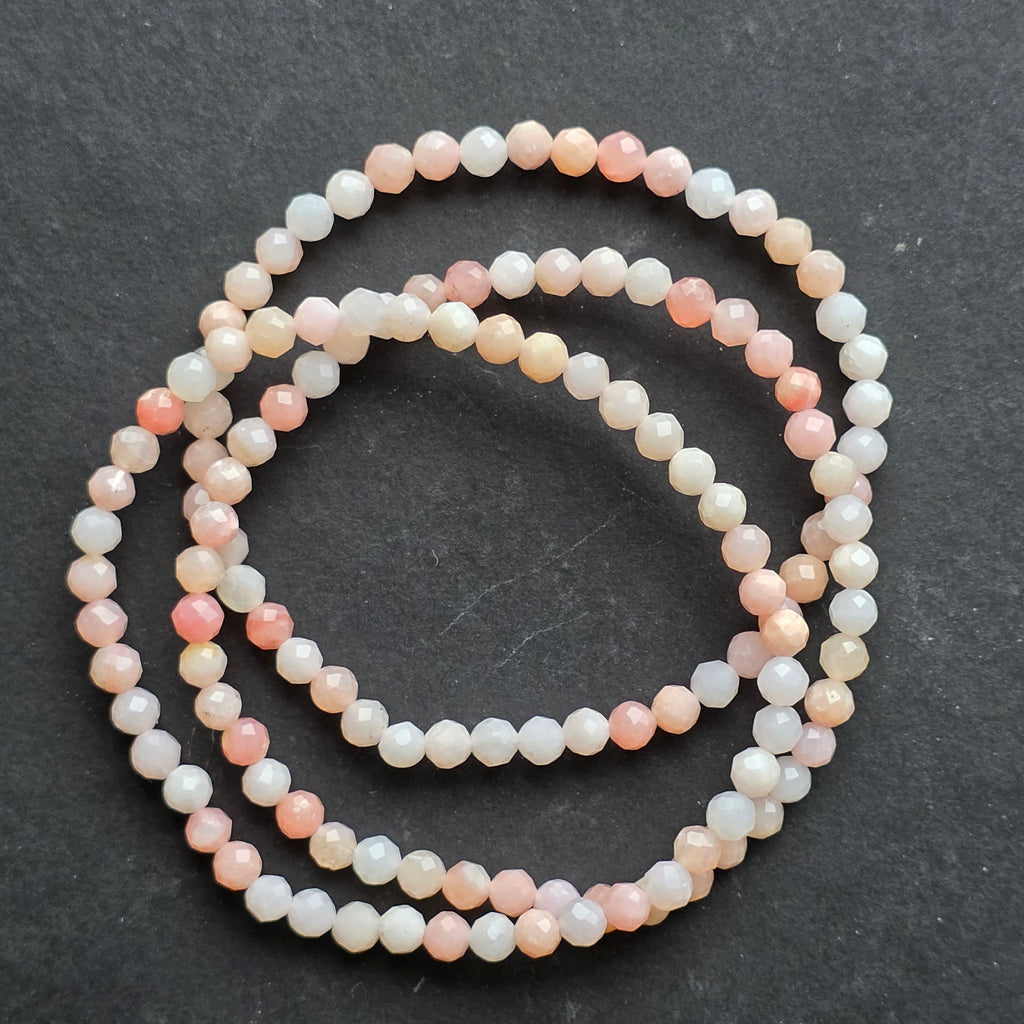 O brățară delicată ca o promisiune de lumină. Mărgelele fațetate de opal roz natural, cu diametrul de 4 mm, strălucesc în nuanțe diafane de roz pal, crem și bej cald, formând un joc subtil de culori ce emană feminitate și armonie. Este o bijuterie fină, cu o energie calmă și protectoare, menită să aducă liniște inimii și încredere în propriul drum.