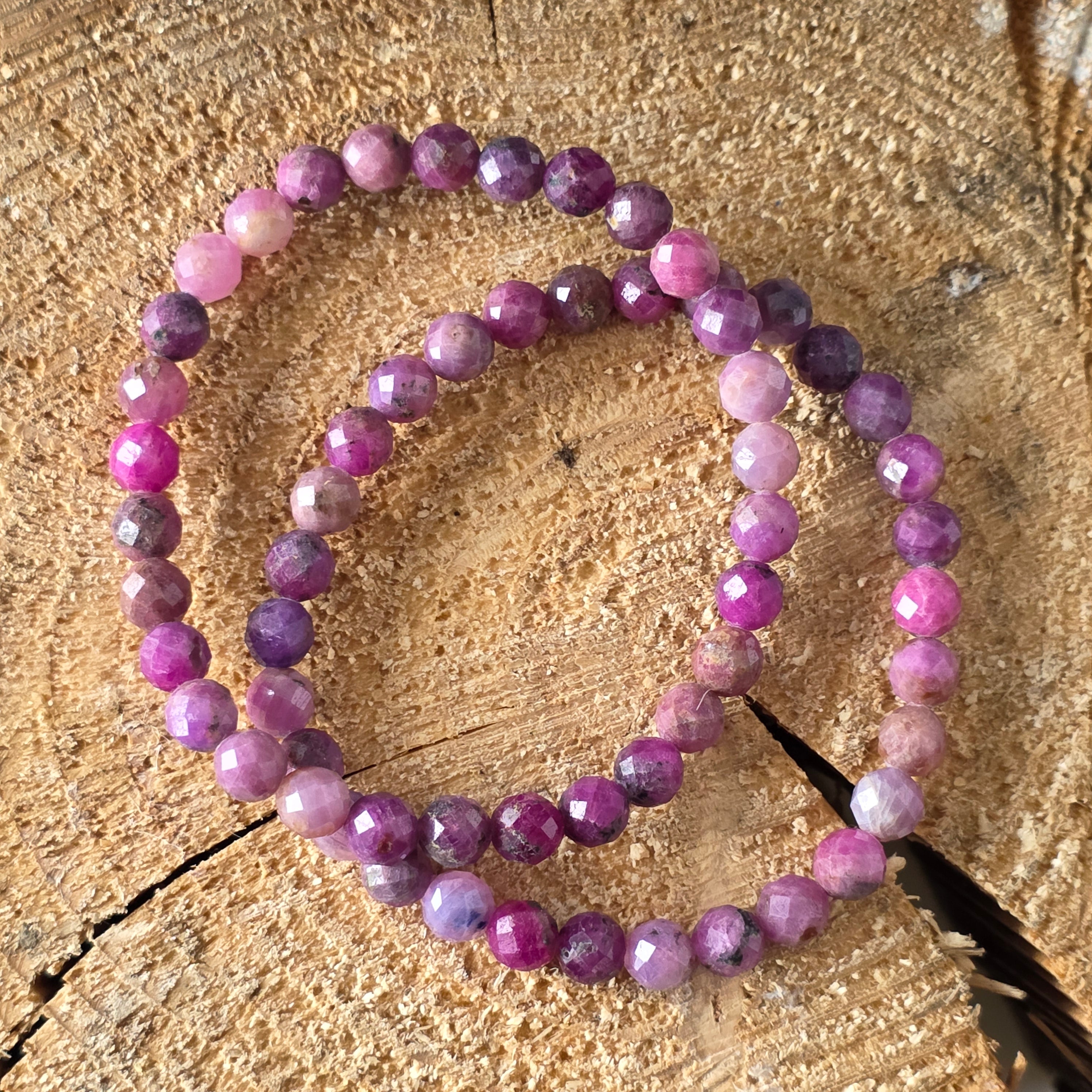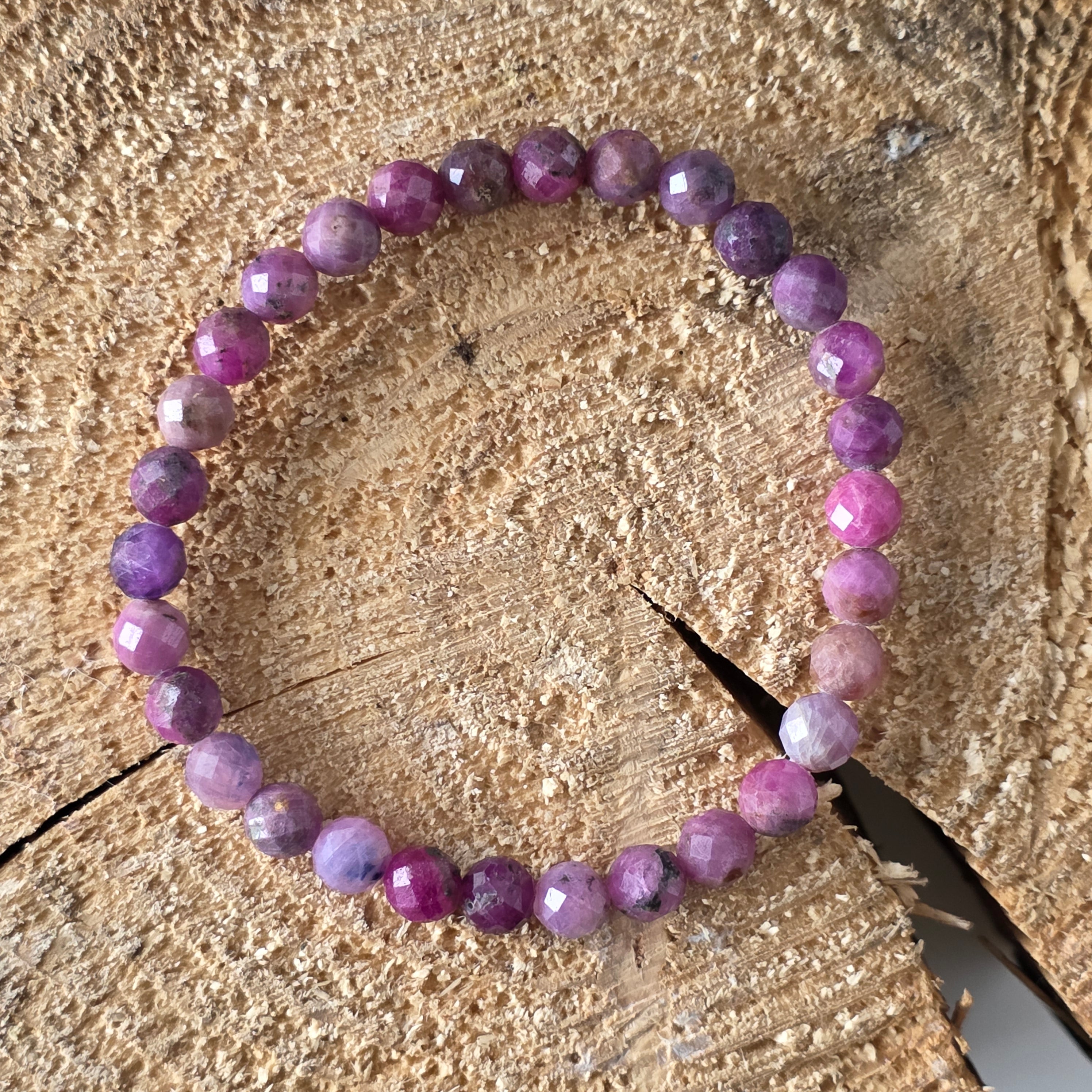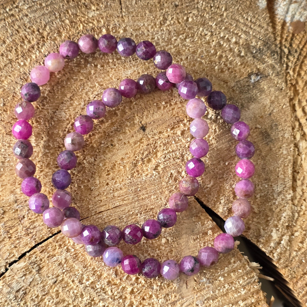 O brățară care poartă în ea flacăra vie a vieții. Mărgelele fațetate de rubin natural, cu diametrul de 6 mm, strălucesc în tonuri bogate de roșu intens, uneori cu accente purpurii sau reflexe profunde de vișiniu. Fiecare piatră pare să pulseze cu o energie caldă, vitală, asemenea unei inimi care bate în ritmul propriei chemări.