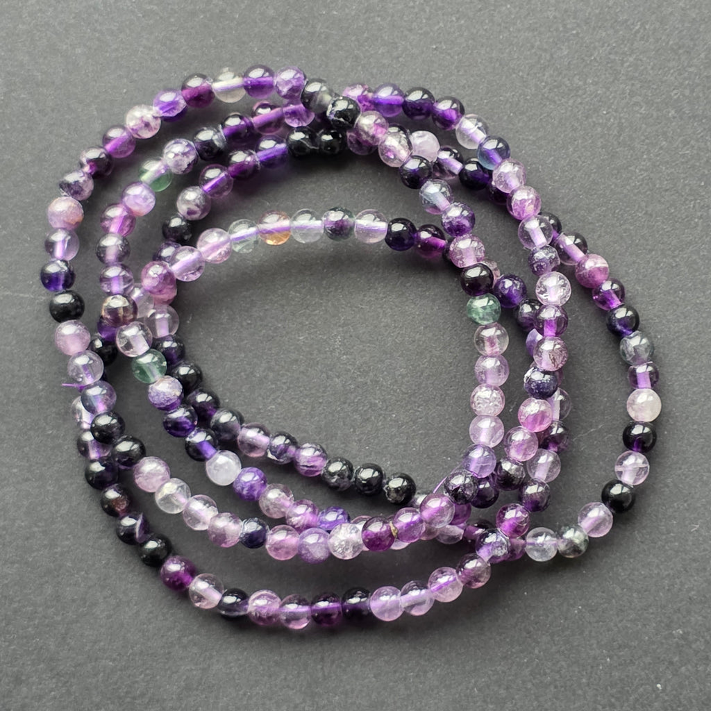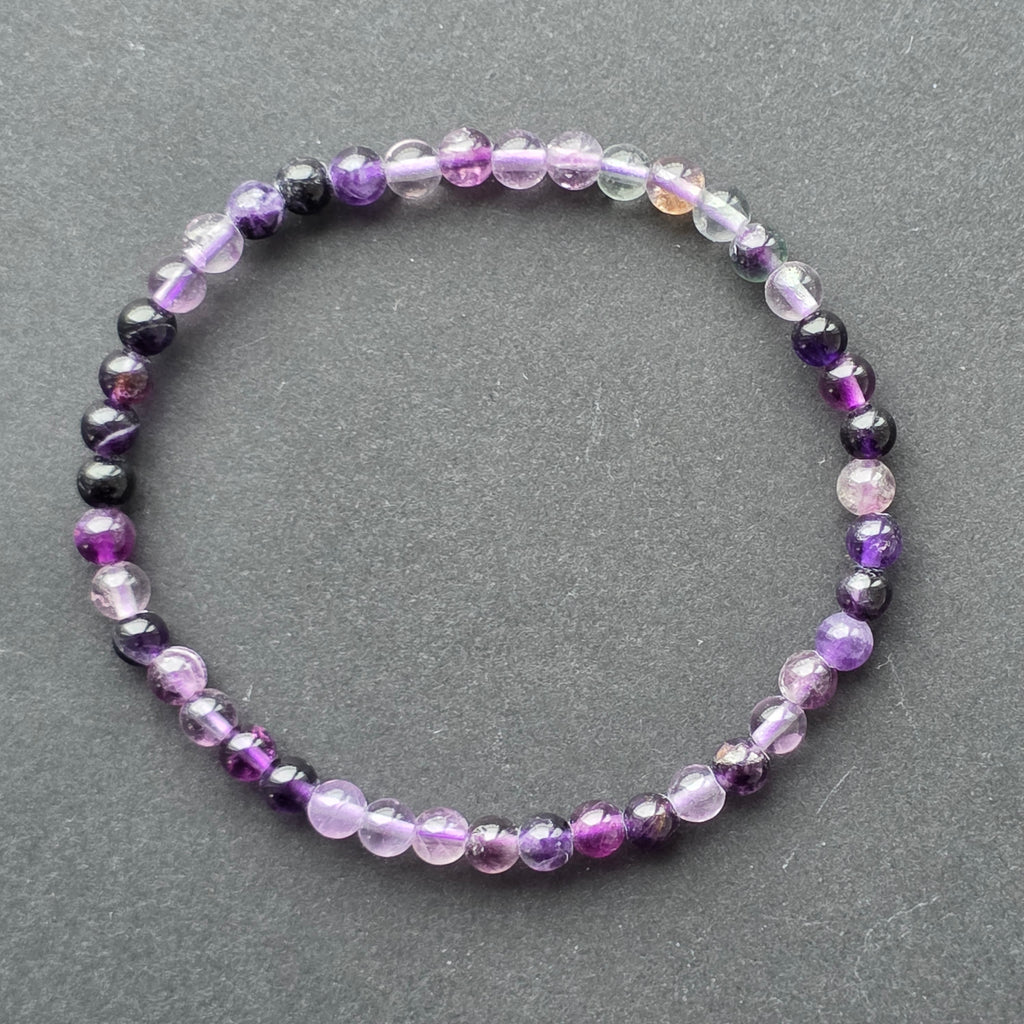 Brățara din fluorină mov este o bijuterie delicată, în care lumina pare să circule liber printre nuanțe de violet pal, mov intens și mici accente mai închise. Pietrele sunt naturale, fiecare cu propria transparență, propriul joc de reflexii și propria amprentă subtilă lăsată de natură.