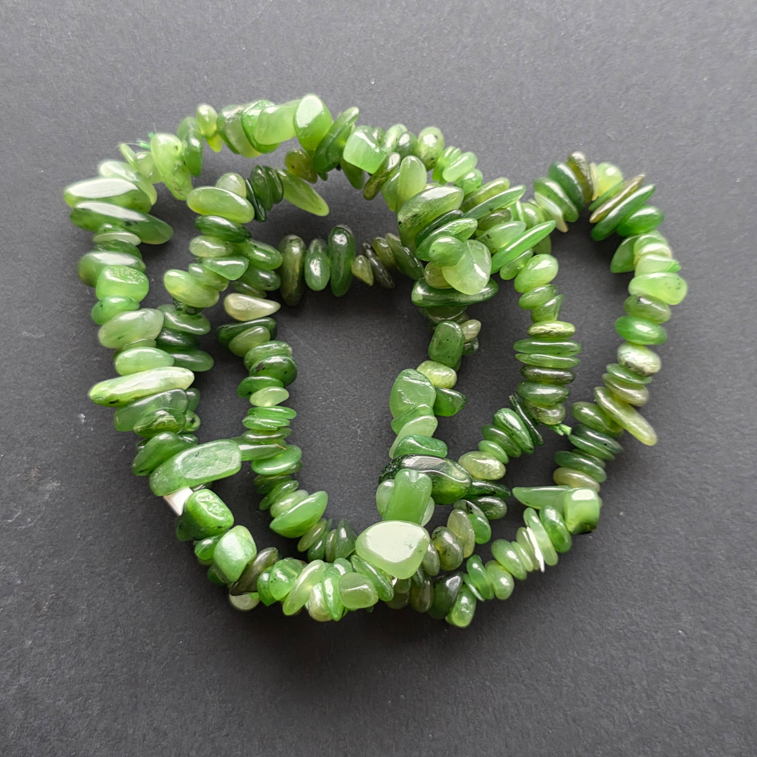 • Piatra: jad verde nefrit – chipsuri neregulate, șlefuite manual