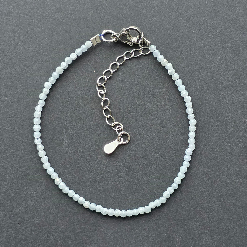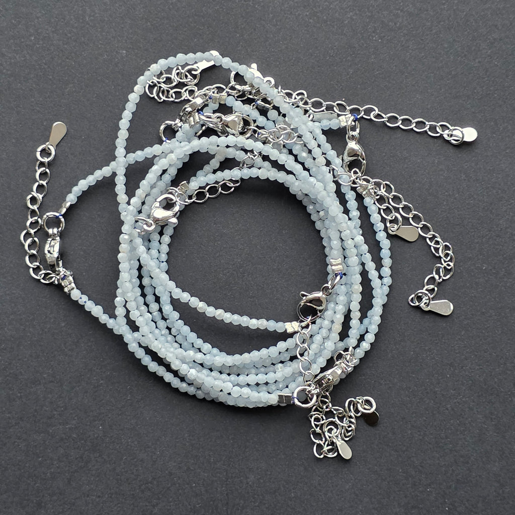 Angelitul este o piatră cu o vibrație suavă, ca o lumină filtrată prin norii dimineții. În această brățară delicată, mărgelele fațetate de 2 mm surprind nuanțe blânde de albastru, împrumutând bijuteriei o senzatie de calm, puritate și liniște interioară.
