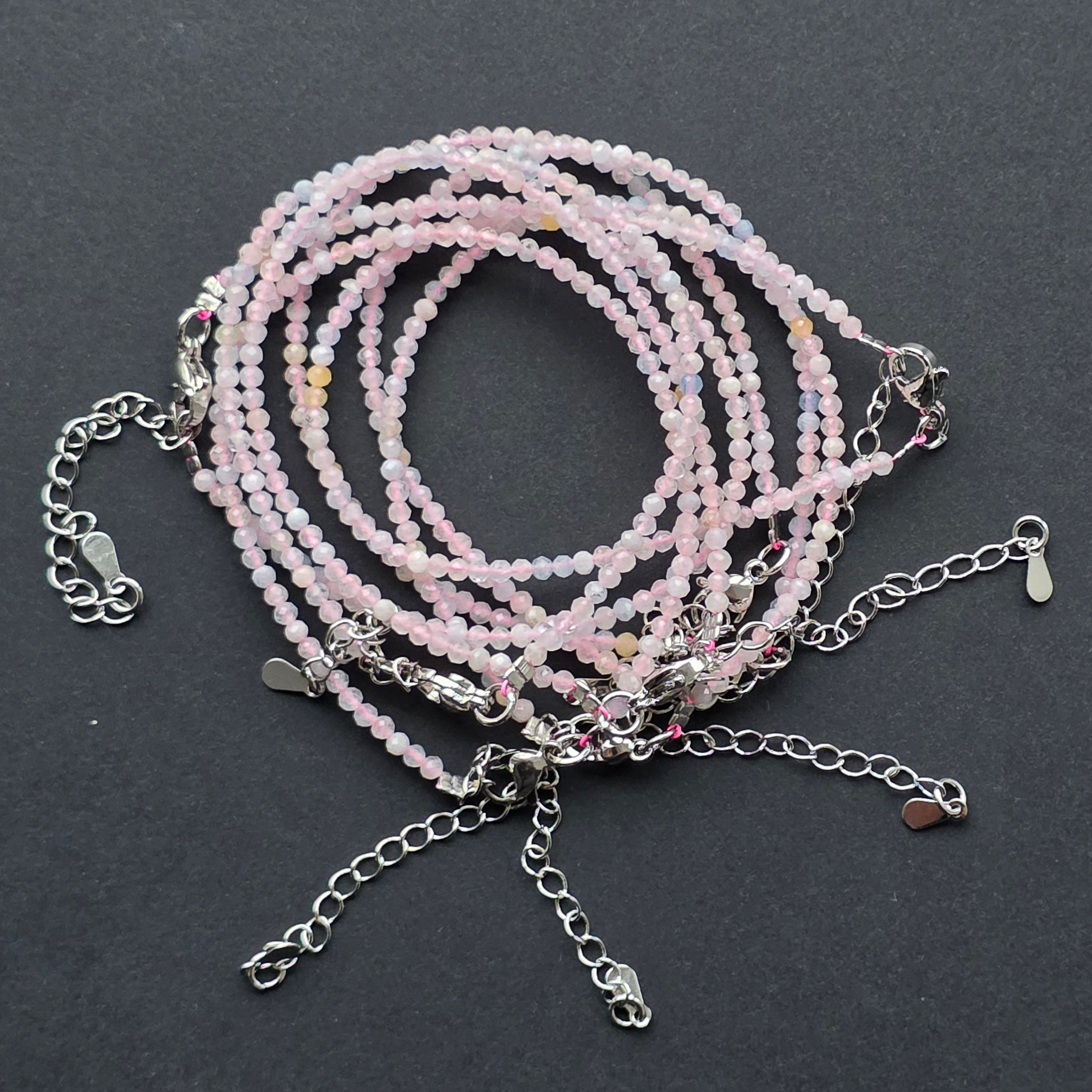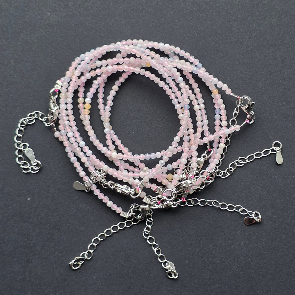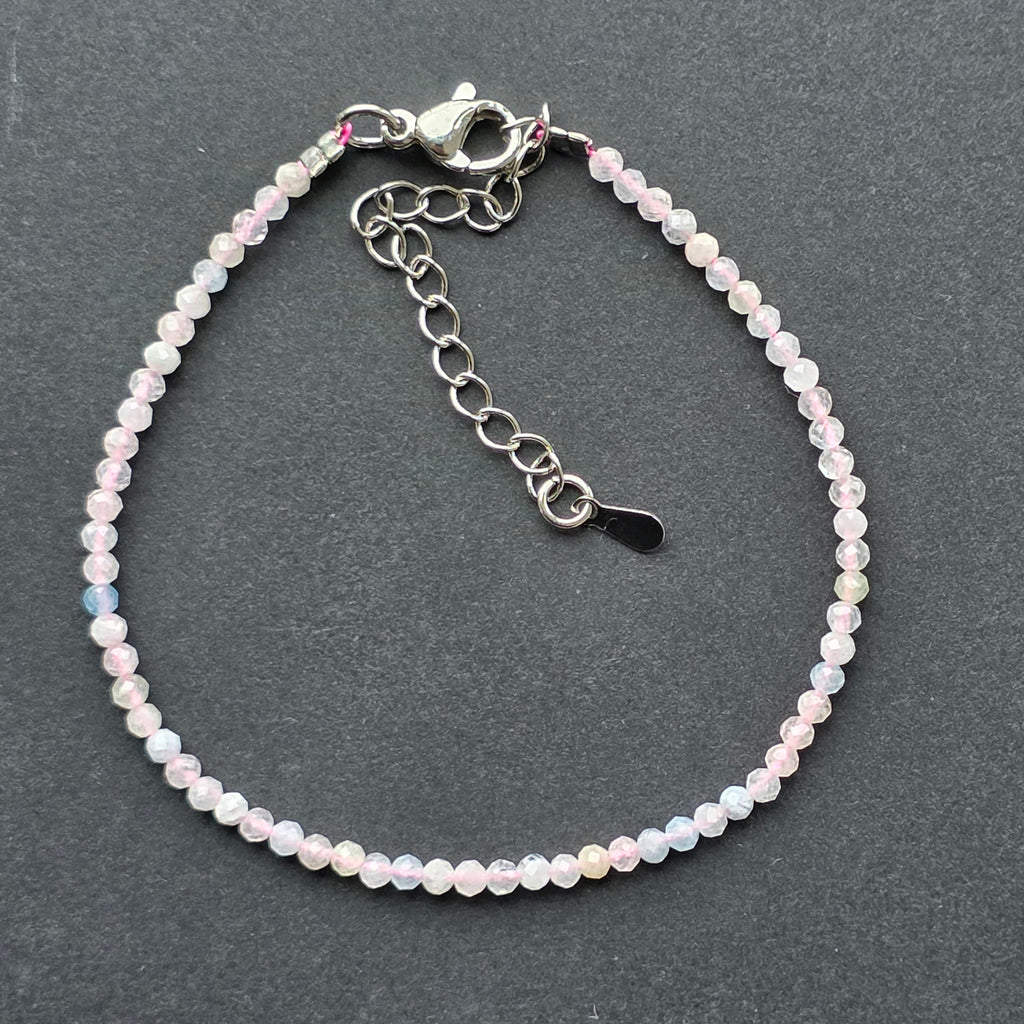 Într-o brățară delicată, aproape eterică, berilul își dezvăluie culorile cele mai fine: rozurile calde ale morganitului și tonurile diafane de albastru ale acvamarinului. Mărgelele fațetate, extrem de fine, dansează cu lumina și creează o strălucire subtilă, cristal cu cristal, într-un ritm calm și elegant.