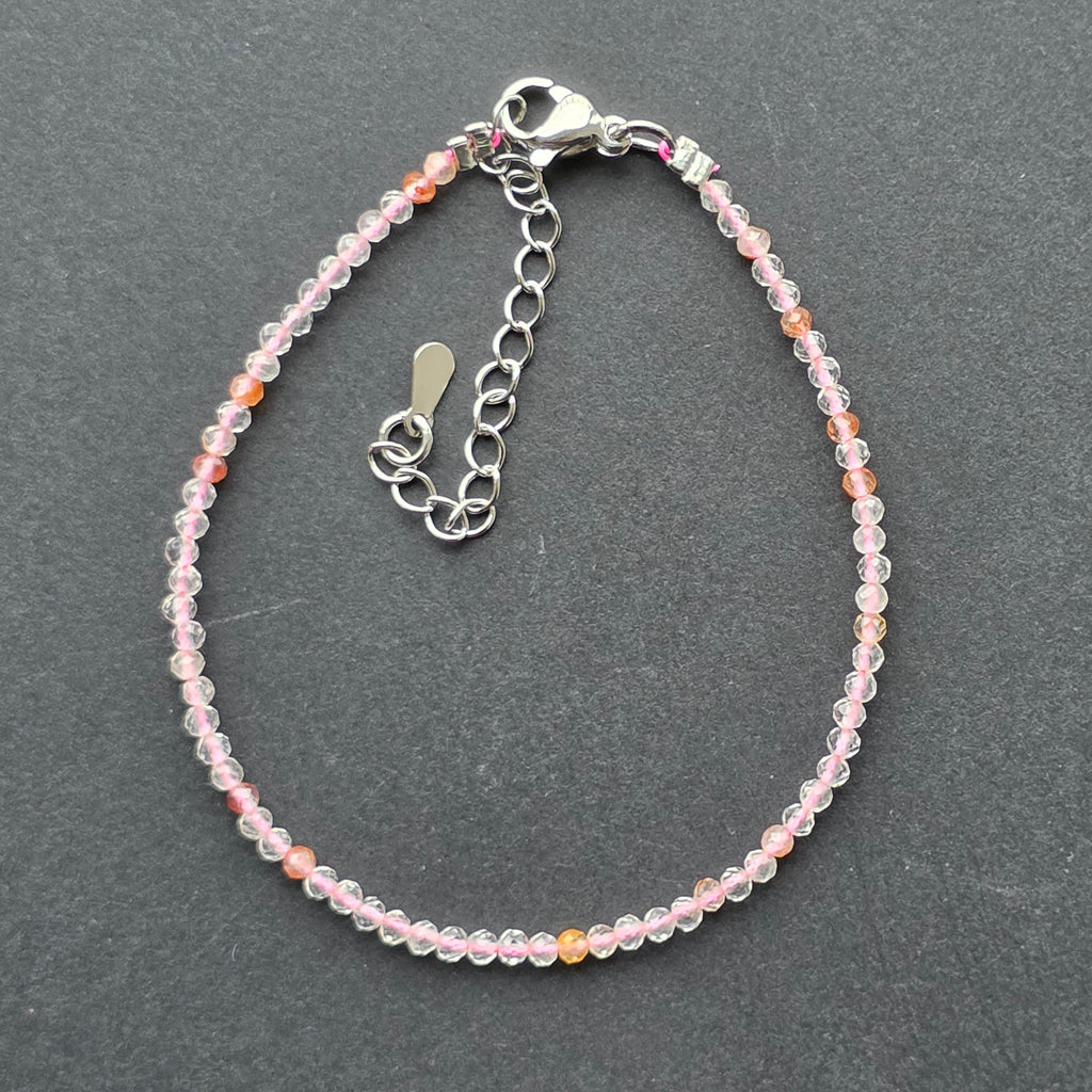 Cuartul roz este una dintre cele mai îndrăgite pietre ale lumii minerale, cunoscut pentru delicatețea și lumina sa caldă. În această variantă „mix”, fiecare mărgea păstrează o nuanță ușor diferită — de la roz lapte foarte deschis până la rose pudrat sau transparent, ca reflexele unei dimineți liniștite. Cu dimensiuni fine de doar 2 mm, mărgelele fațetate surprind lumina într-un mod discret, asemenea unor picături ce pulsează cu blândețe.