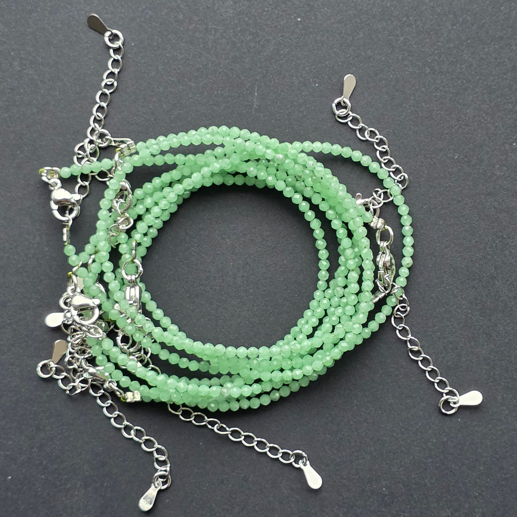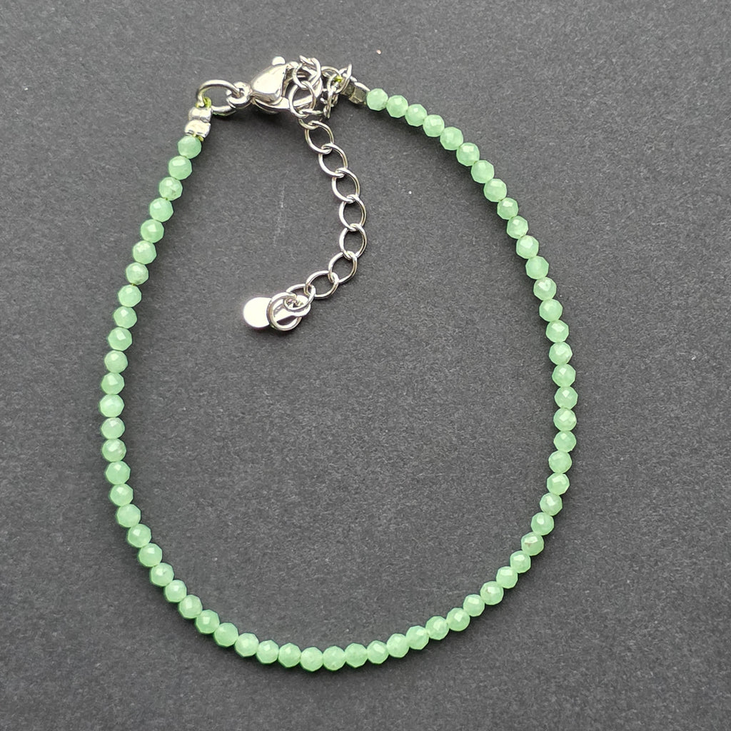 O brățară delicată, senină, construită din mărgele fine de jad new — o piatră atât de luminoasă încât pare să păstreze în ea o respirație de primăvară. Fațetele minuscule ale mărgelelor de 2 mm surprind lumina într-un joc subtil, aproape imperceptibil, ca o strălucire interioară care nu caută să impresioneze, ci să liniștească.