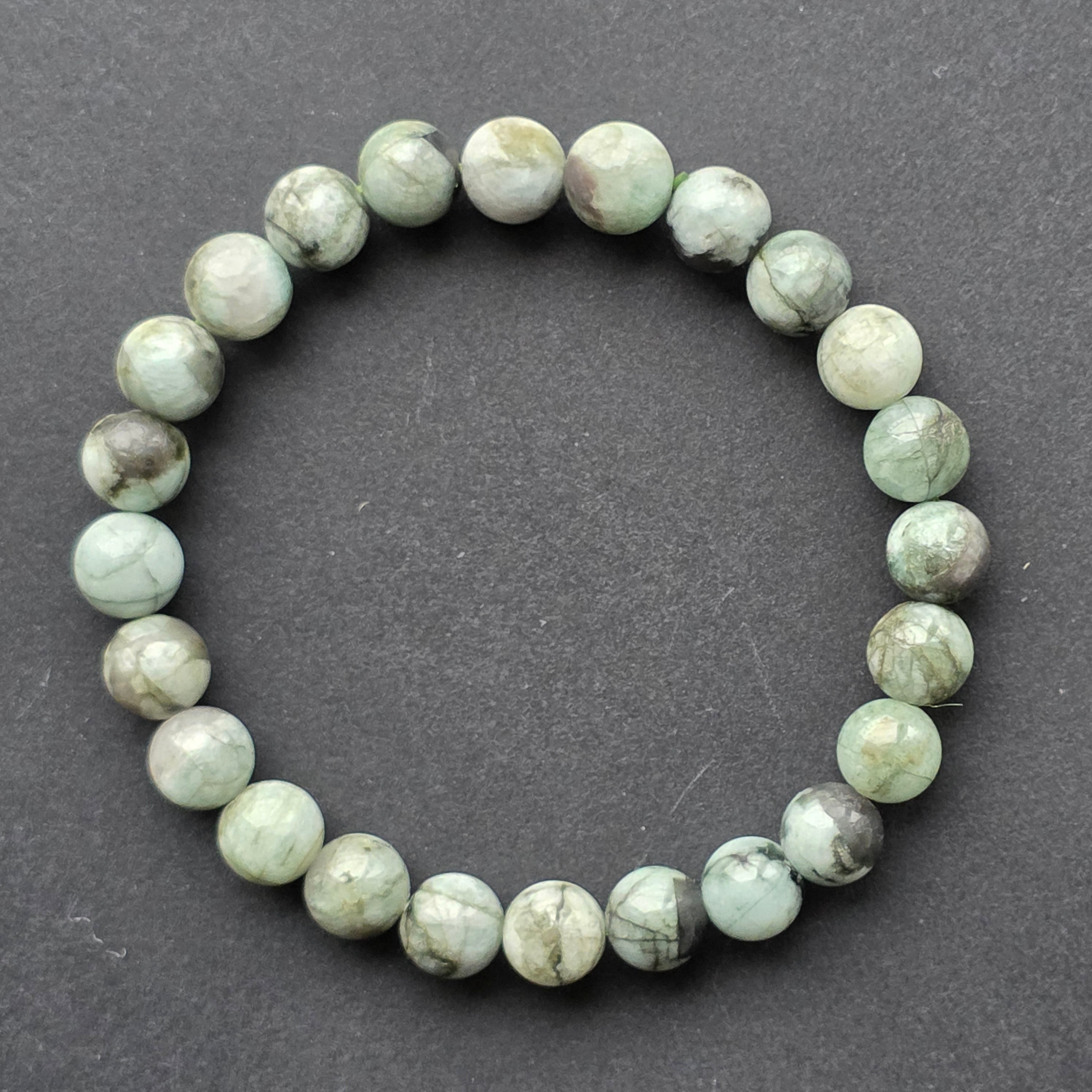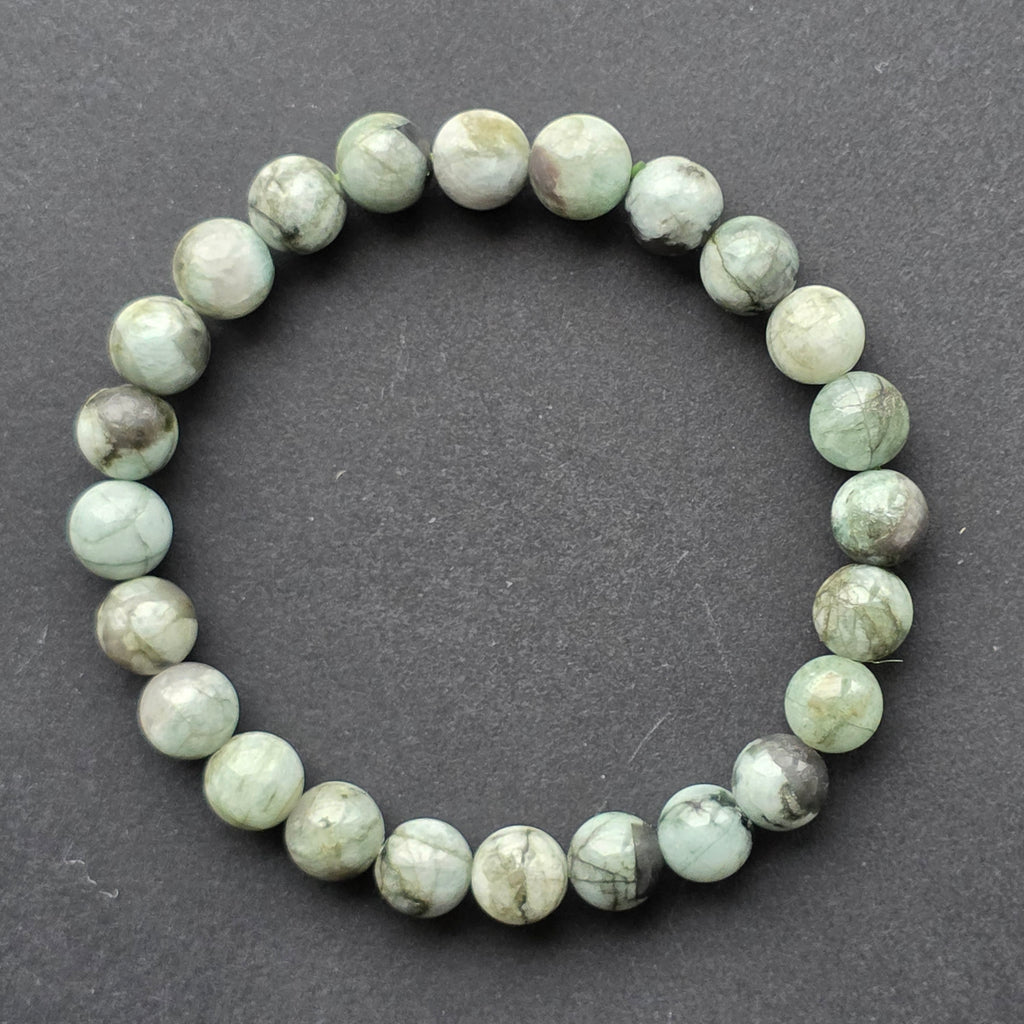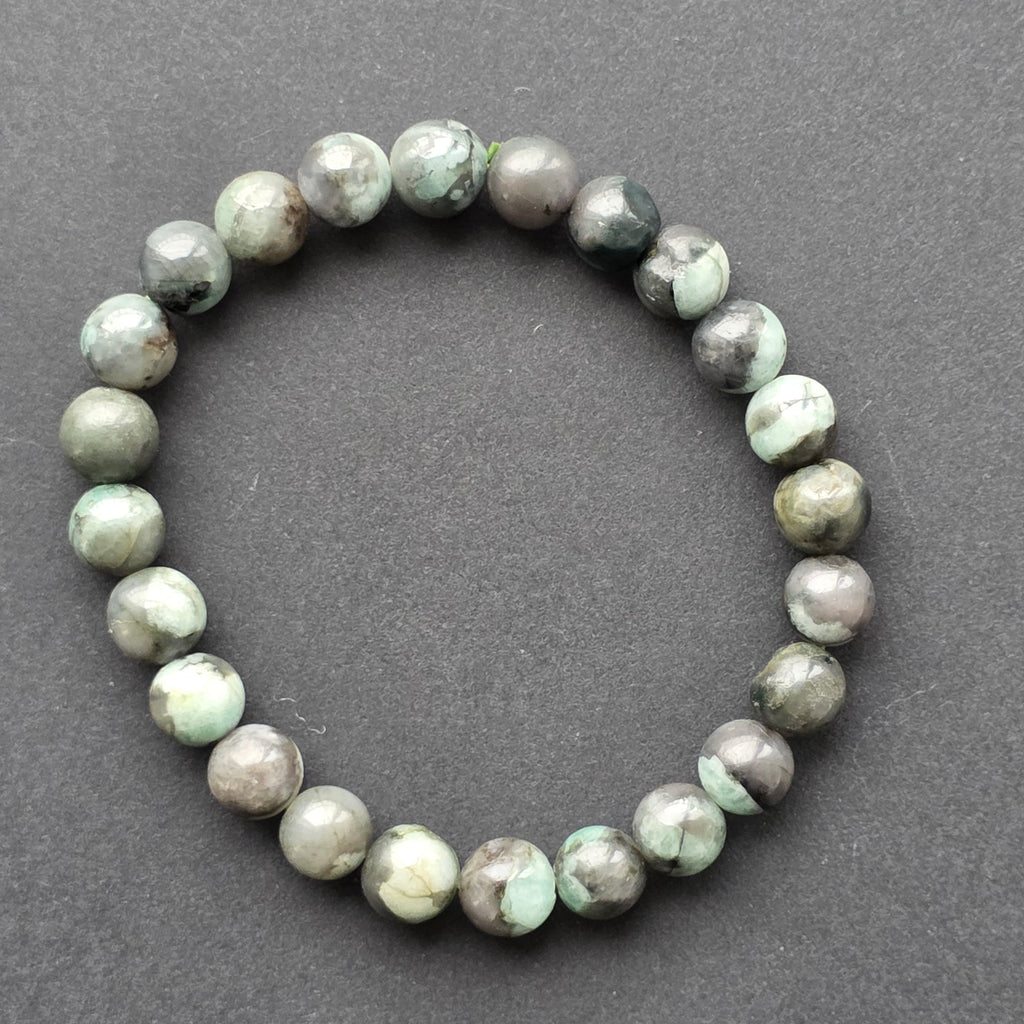 Brățara realizată din mărgele generoase, de 7–8 mm, păstrează frumusețea autentică a smaraldului natural. Texturile și includerile caracteristice creează senzația unui peisaj mineral viu, asemenea unei păduri dense privite de aproape: contraste între zone luminoase și umbre profunde, forme organice, imperfecțiuni care fac fiecare mărgea unică.