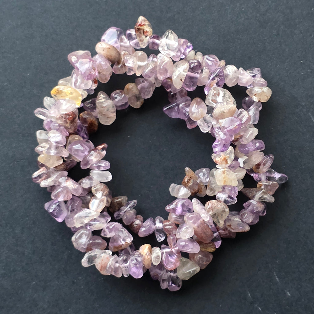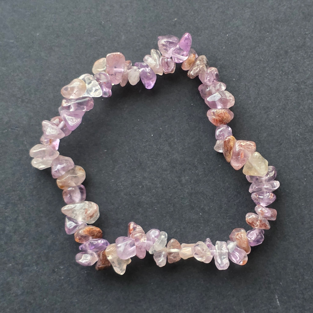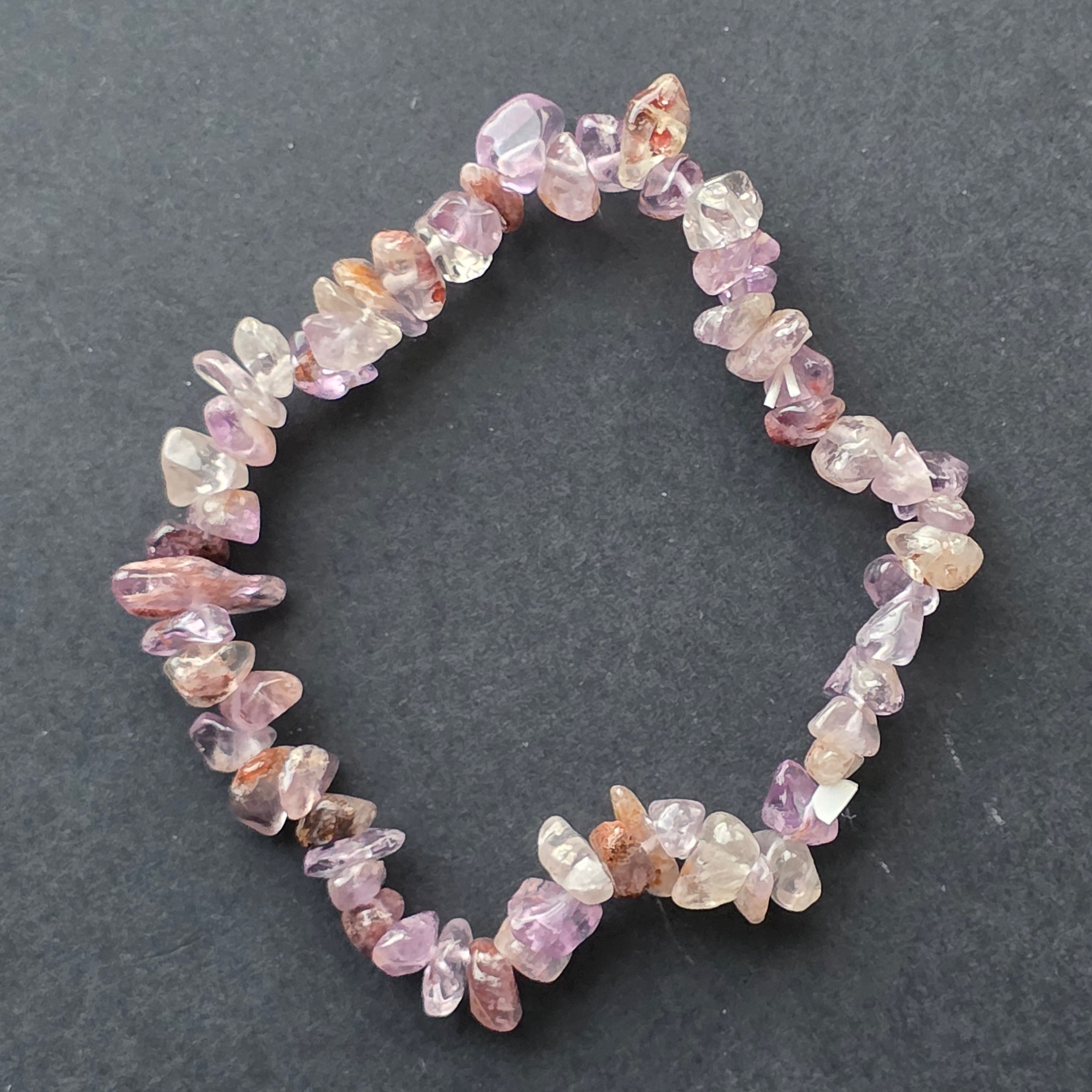 • Piatra: Super 7 (Melody Stone) – chipsuri naturale cu variații de ametist, cuarț fumuriu, cuarț rutilat, lepidocrocit, goethit, cacoxenit