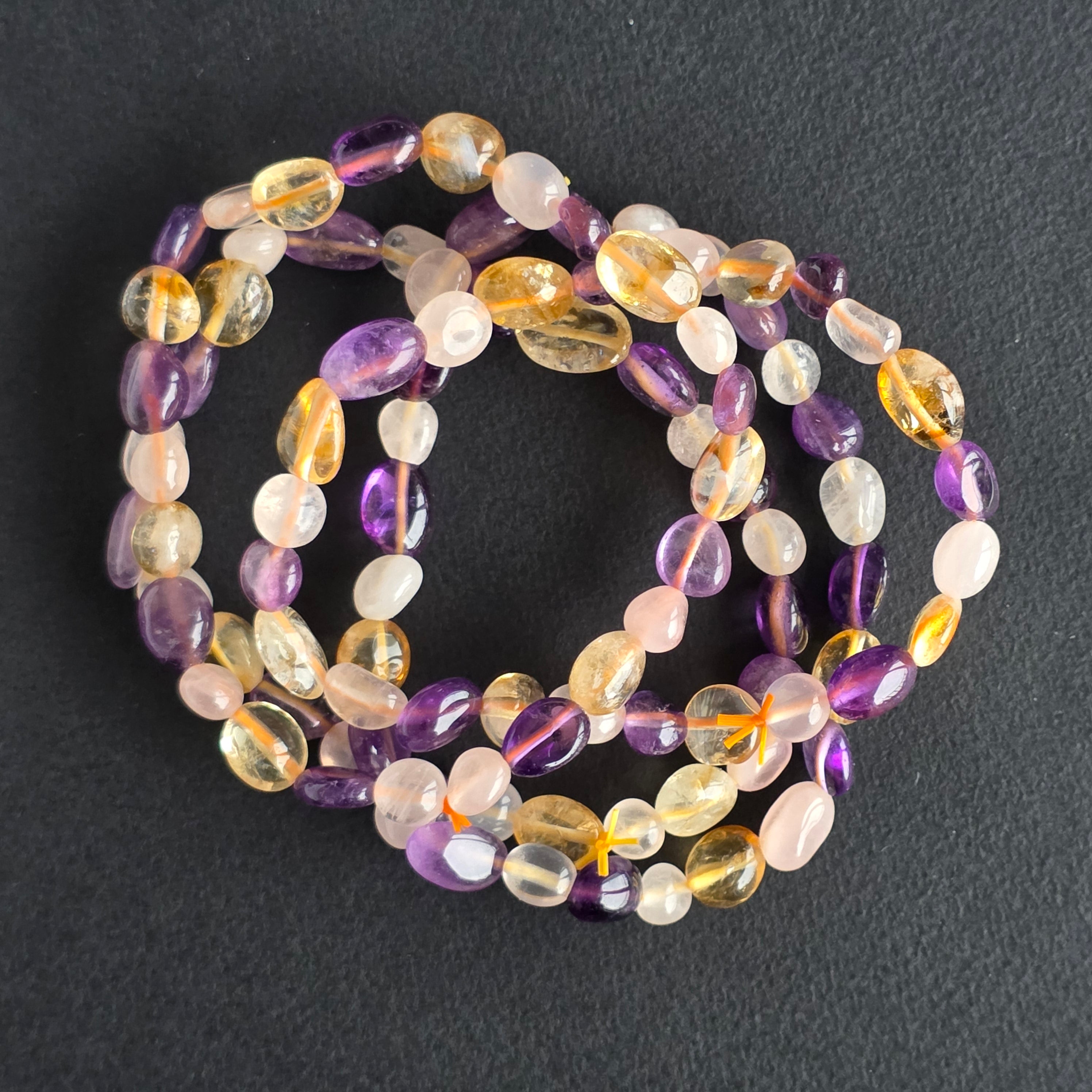 Poartă sau daruieste această brățară Triplă Armonie din Cuart Roz, Ametist și Citrin ca pe un talisman al echilibrului și frumuseții lăuntrice – o bijuterie care vorbește despre liniște, iubire și forța luminii interioare.