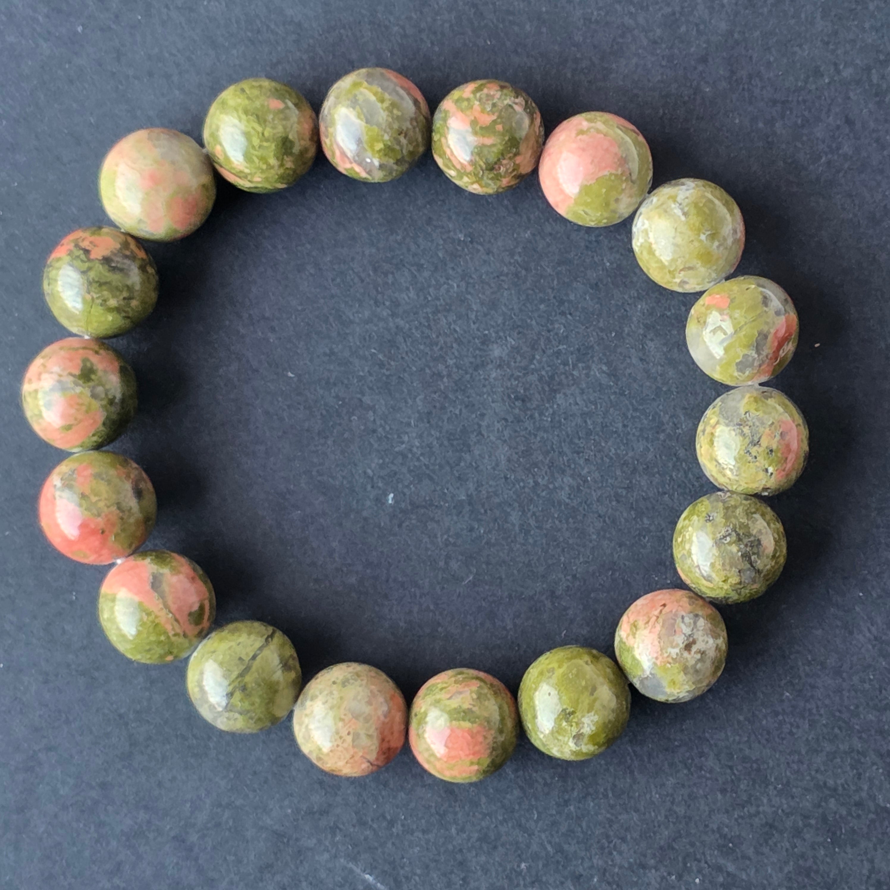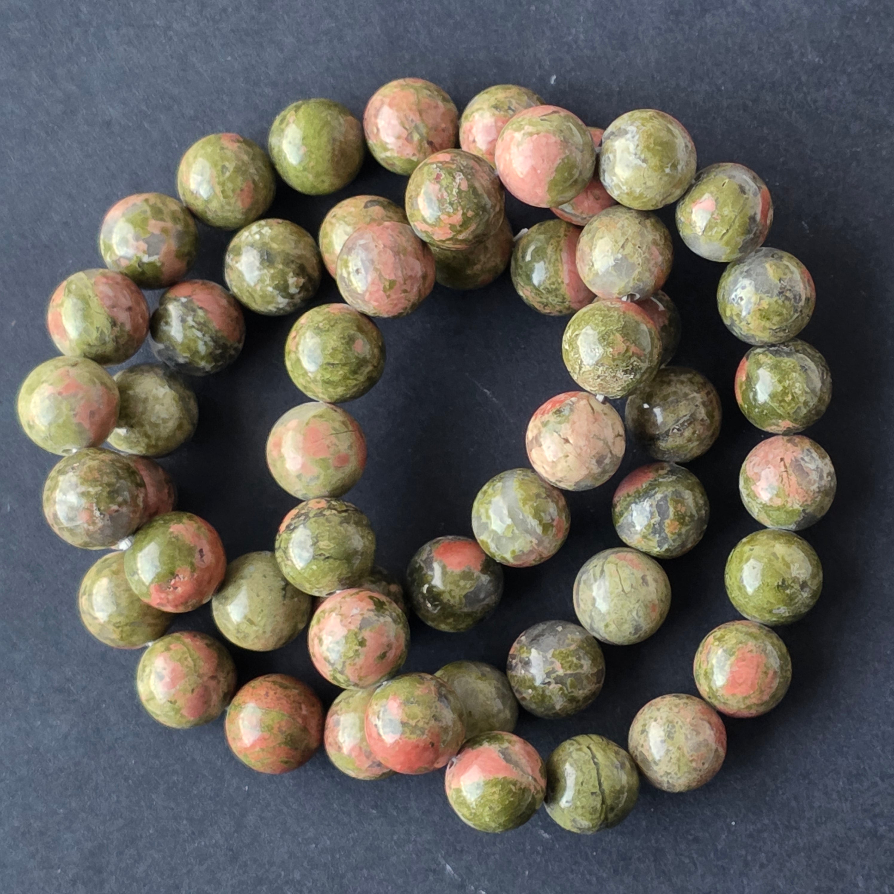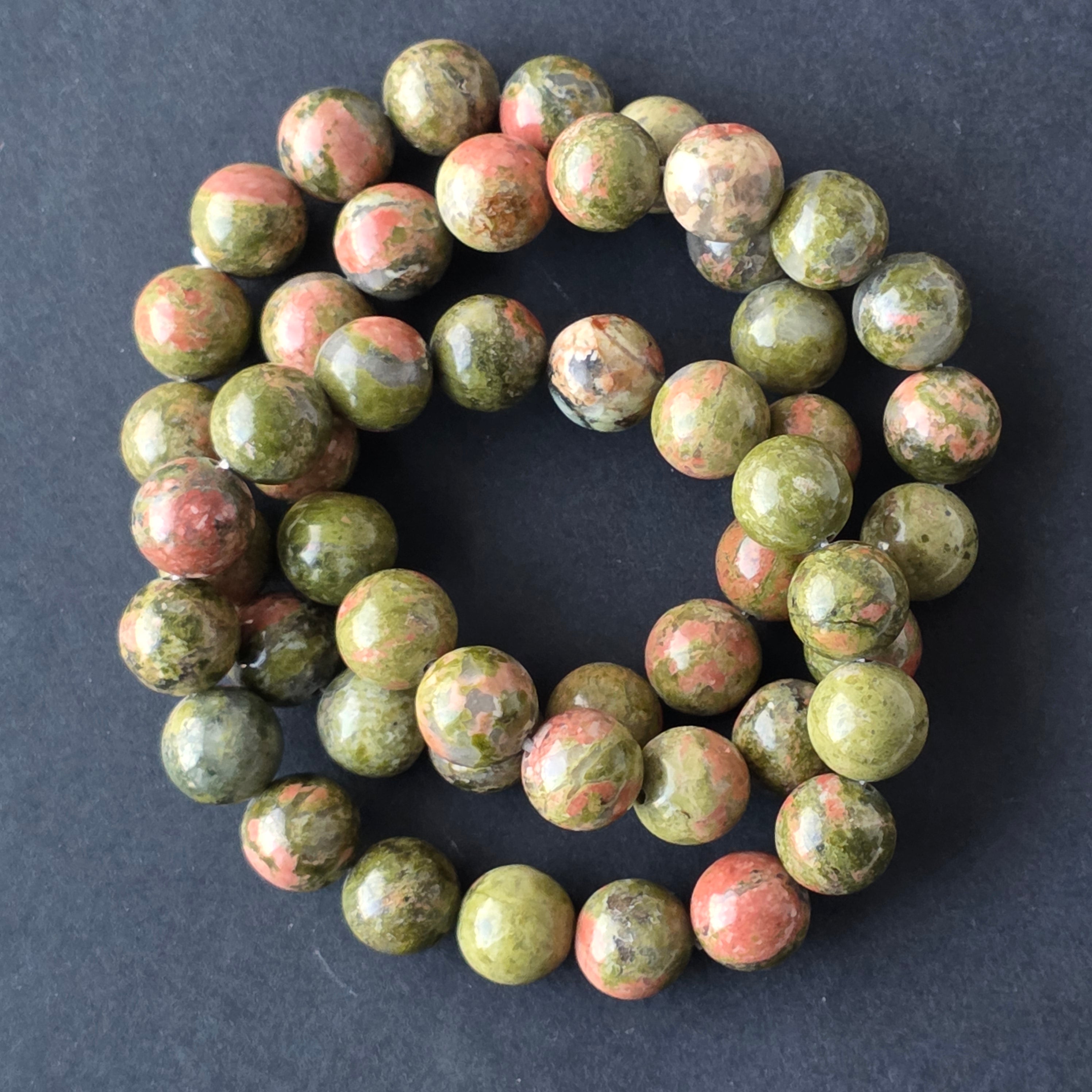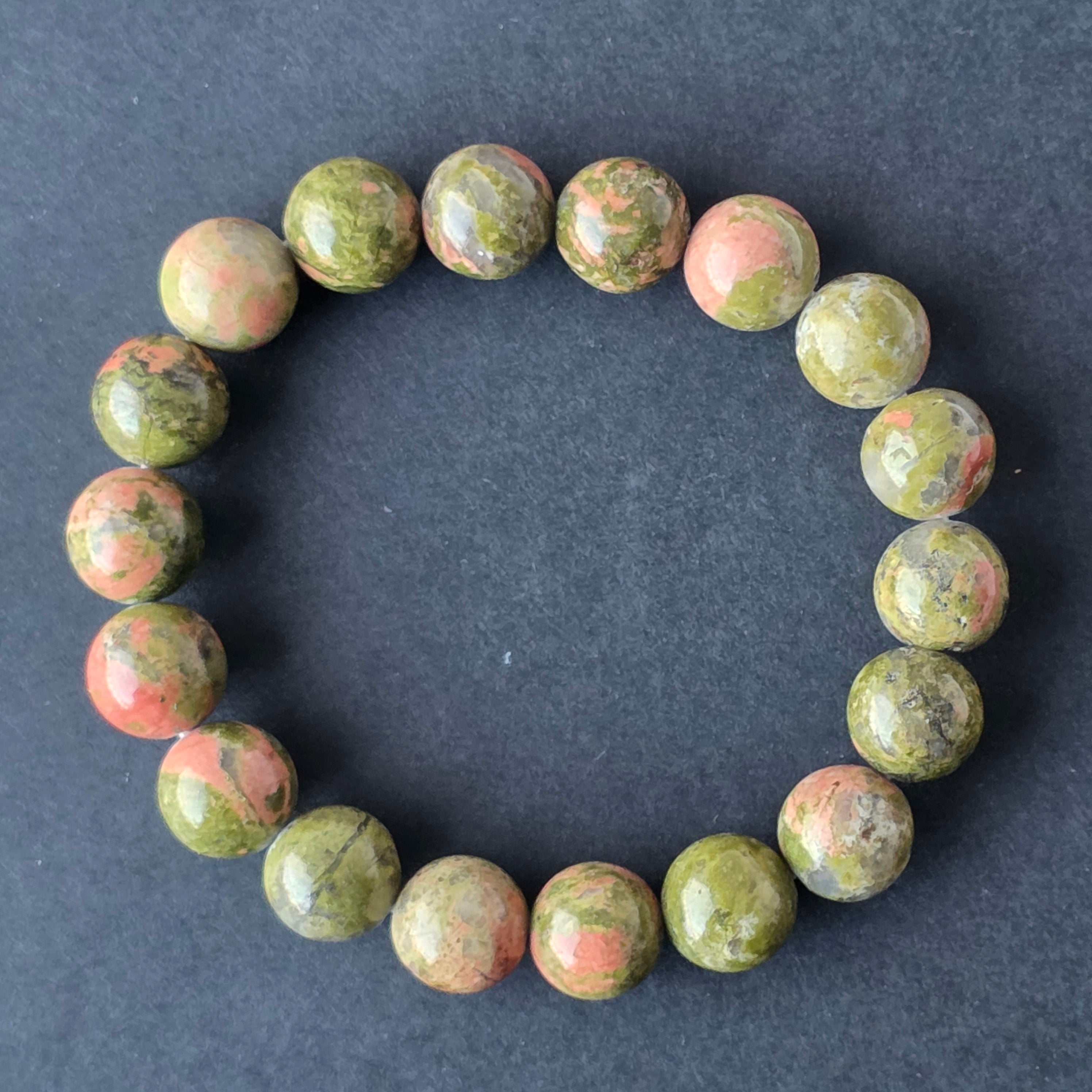 • Piatra: unakit natural – mărgele sferice 10–11 mm