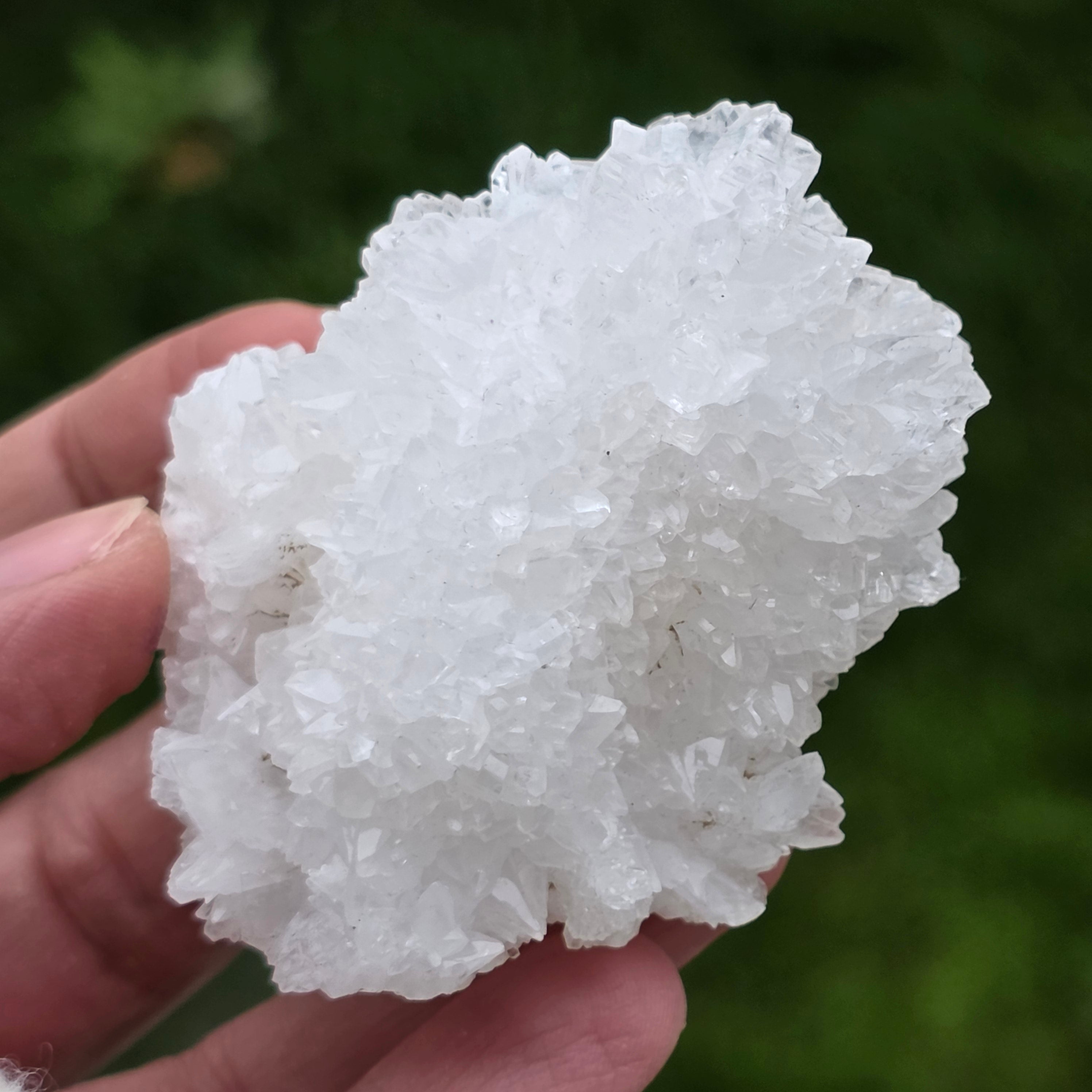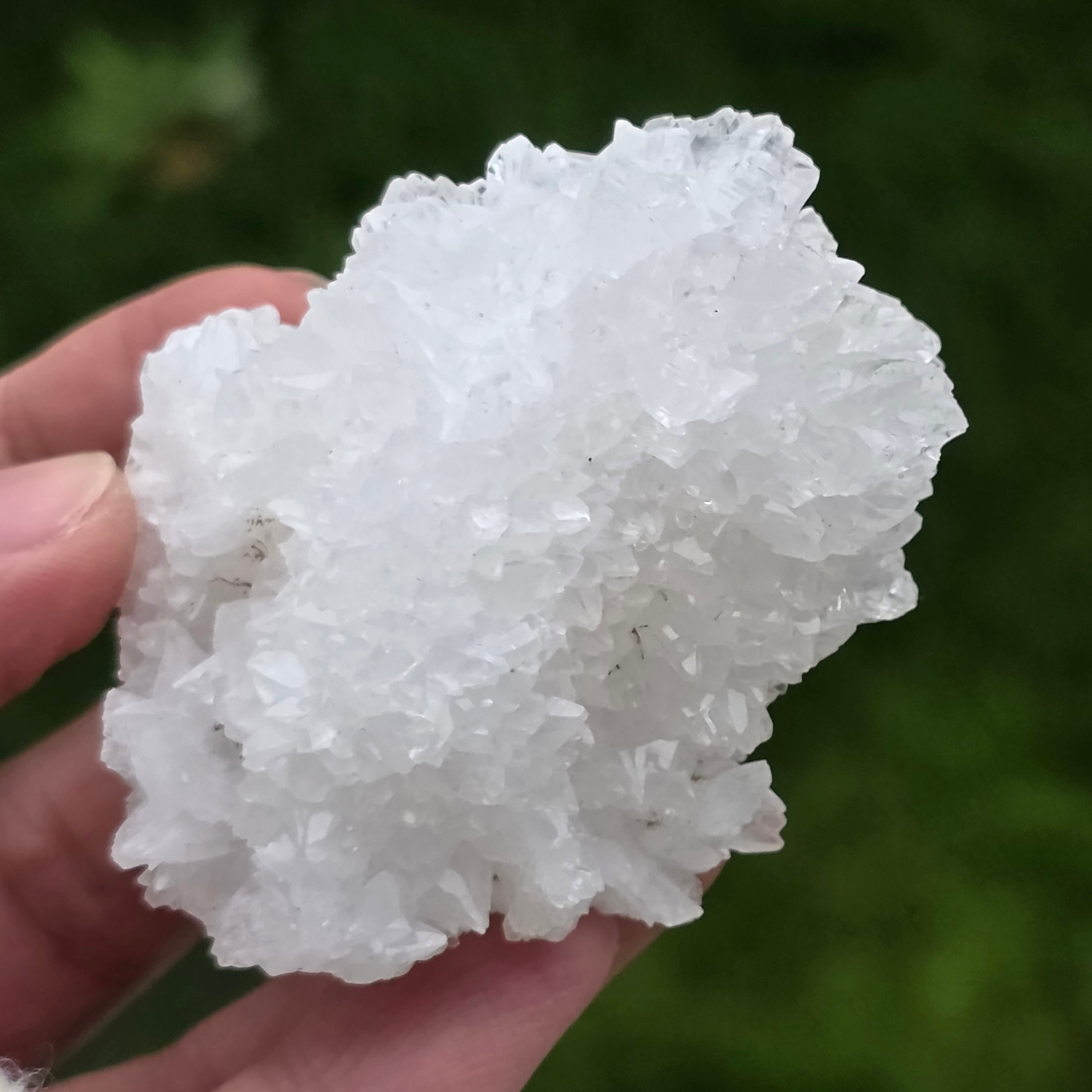 Cristalele sunt dispuse în structuri neregulate, rotunjite, cu suprafețe ușor sclipitoare, amintind de formațiuni întâlnite în interiorul peșterilor. Textura bogată și volumul bine definit conferă fiecărui exemplar un caracter autentic și expresiv, foarte apreciat în colecțiile de minerale și ca piesă decorativă naturală.