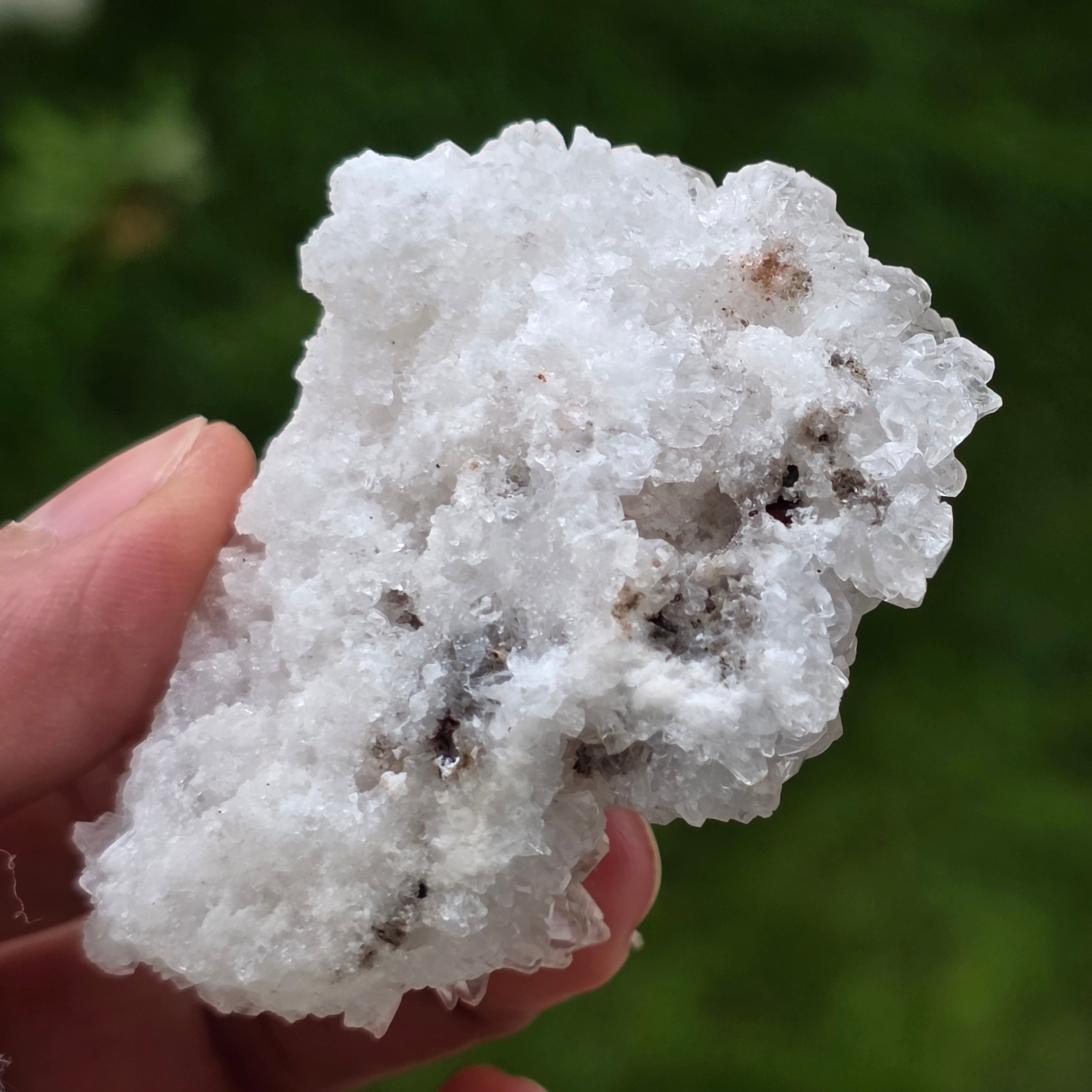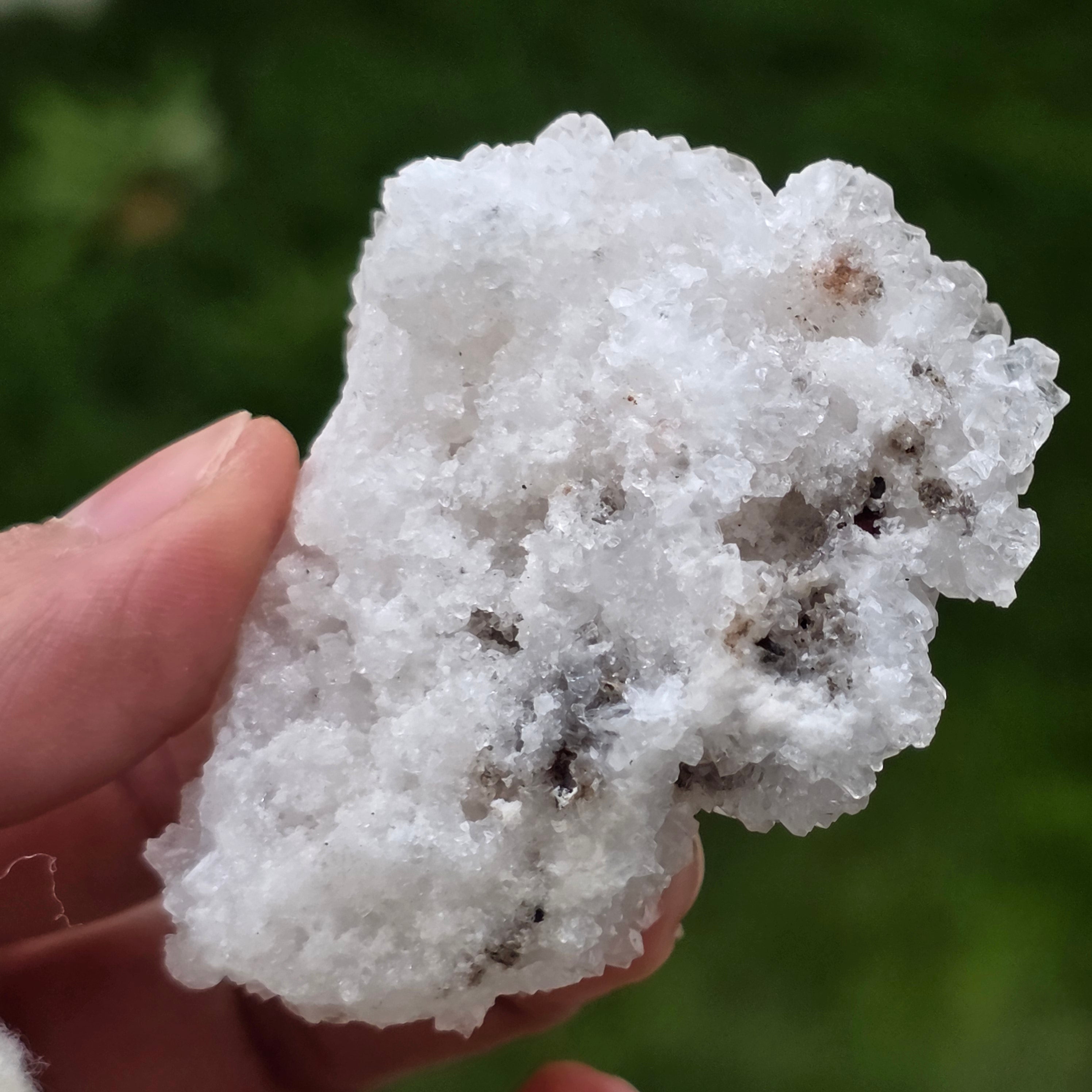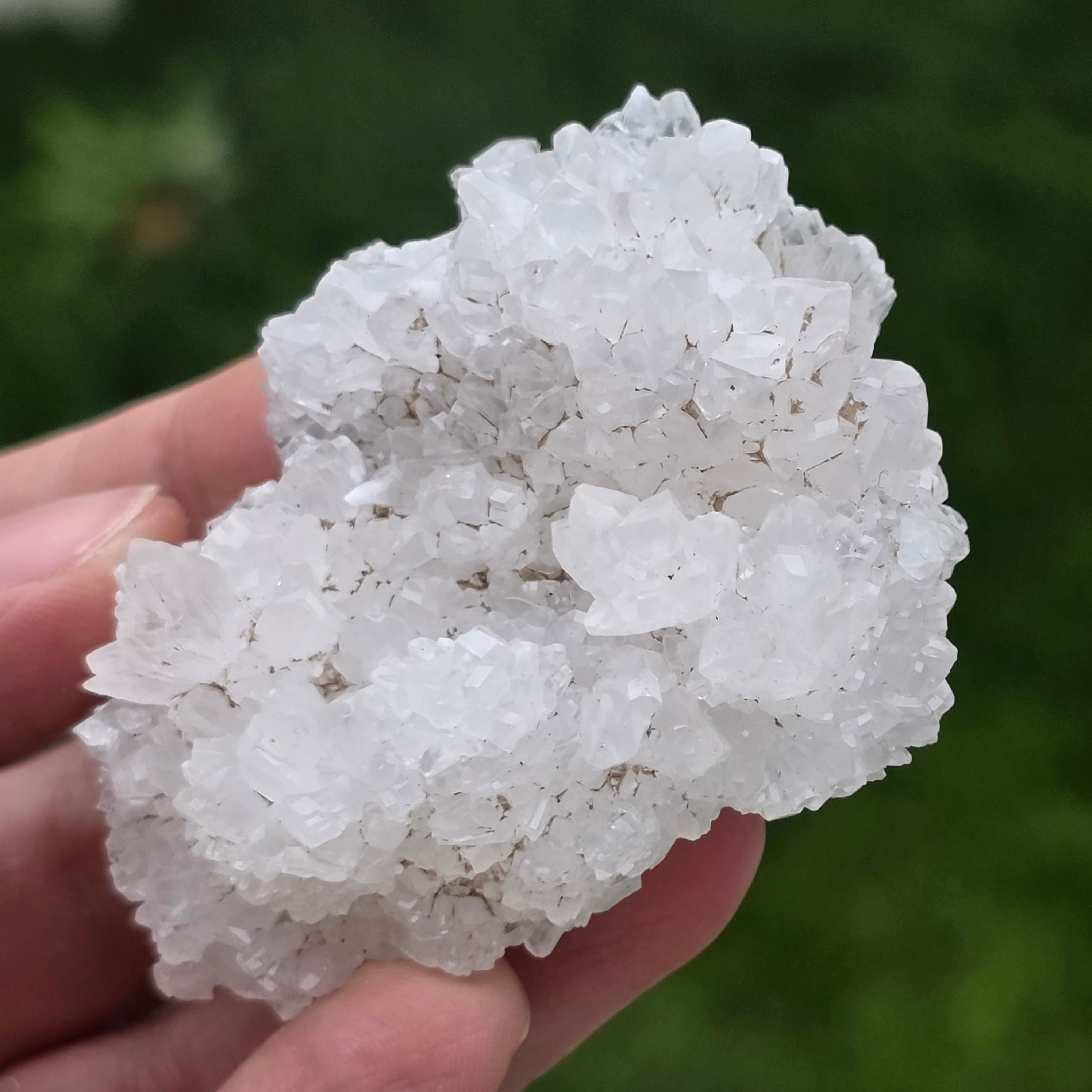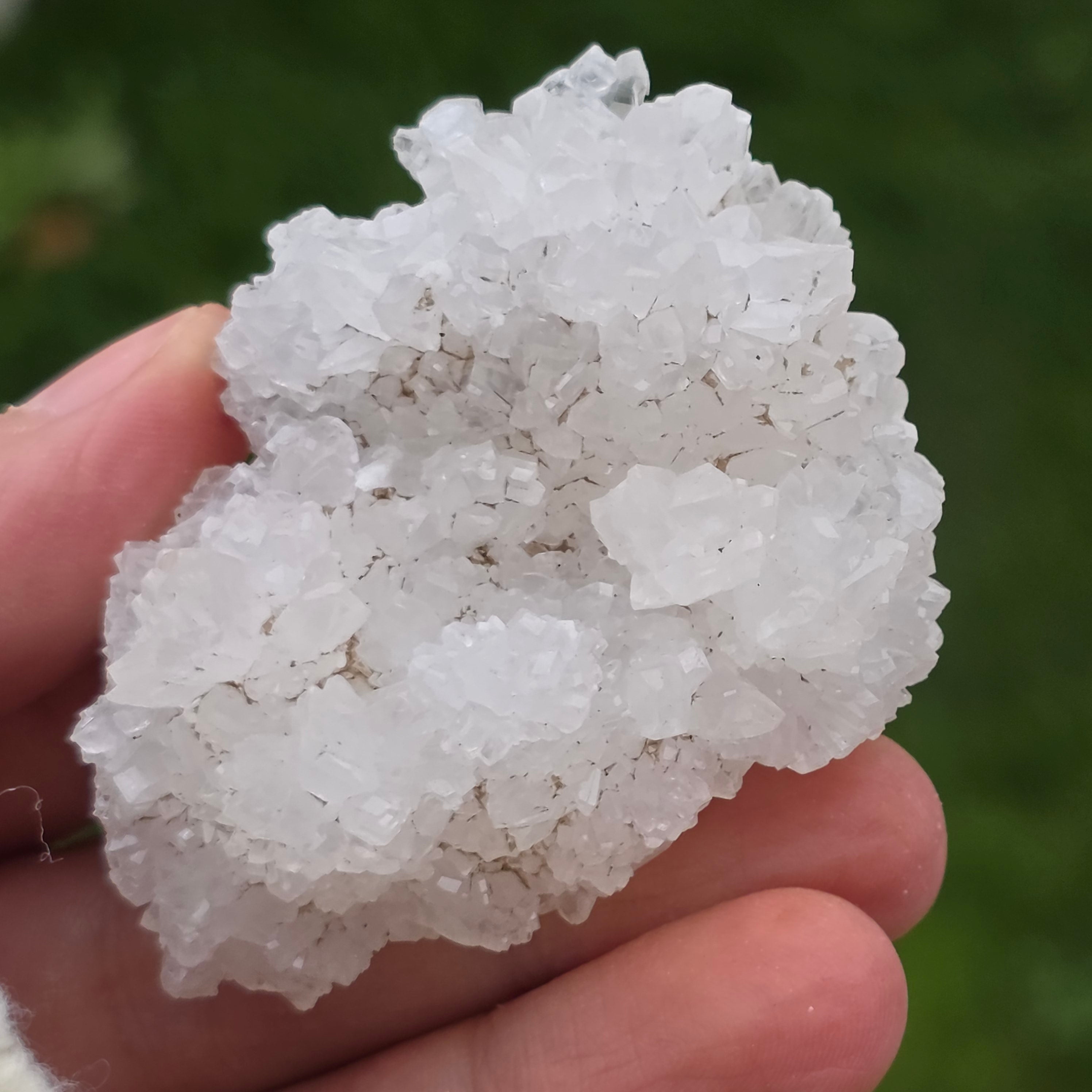 Cristalele sunt dispuse în structuri neregulate, rotunjite, cu suprafețe ușor sclipitoare, amintind de formațiuni întâlnite în interiorul peșterilor. Textura bogată și volumul bine definit conferă fiecărui exemplar un caracter autentic și expresiv, foarte apreciat în colecțiile de minerale și ca piesă decorativă naturală.
