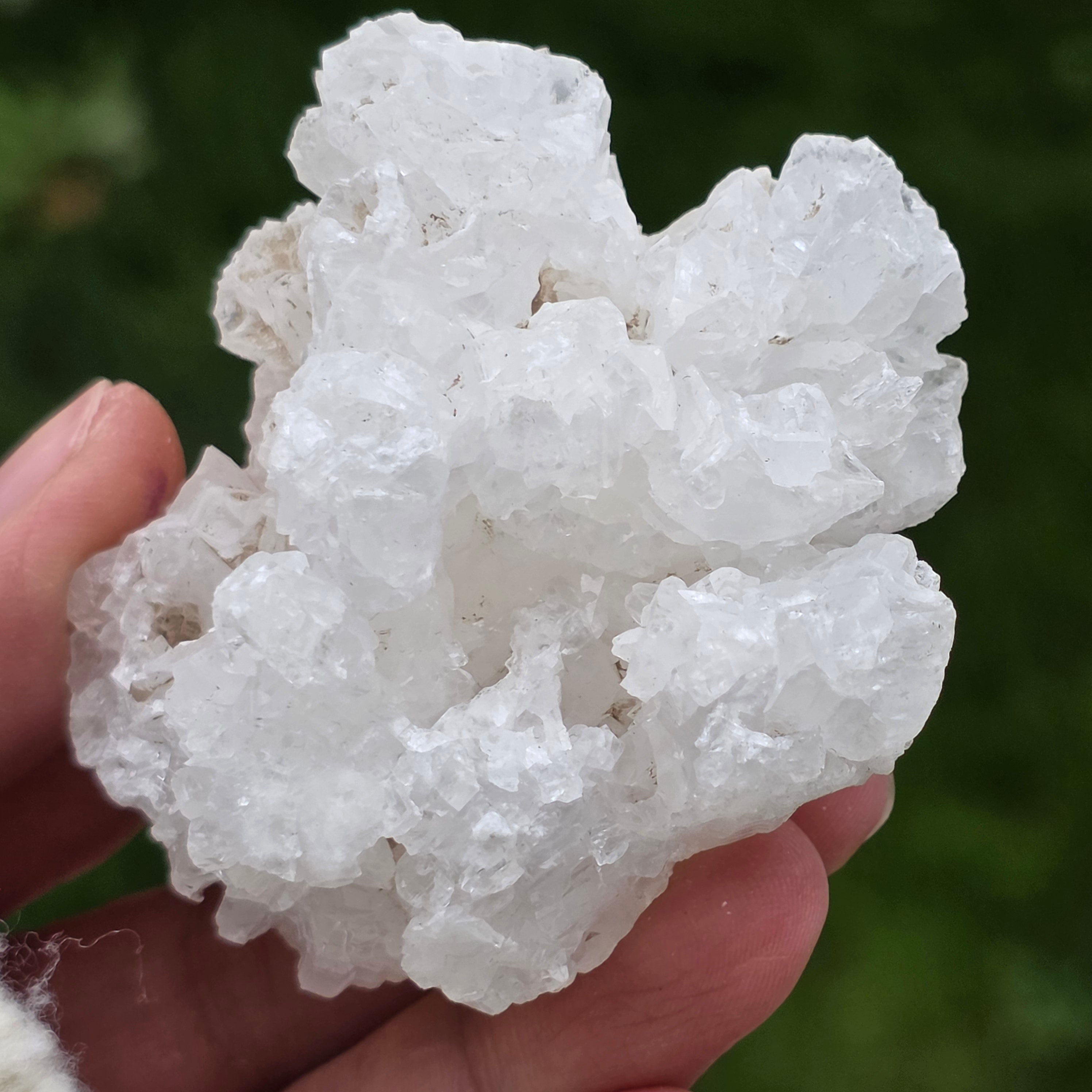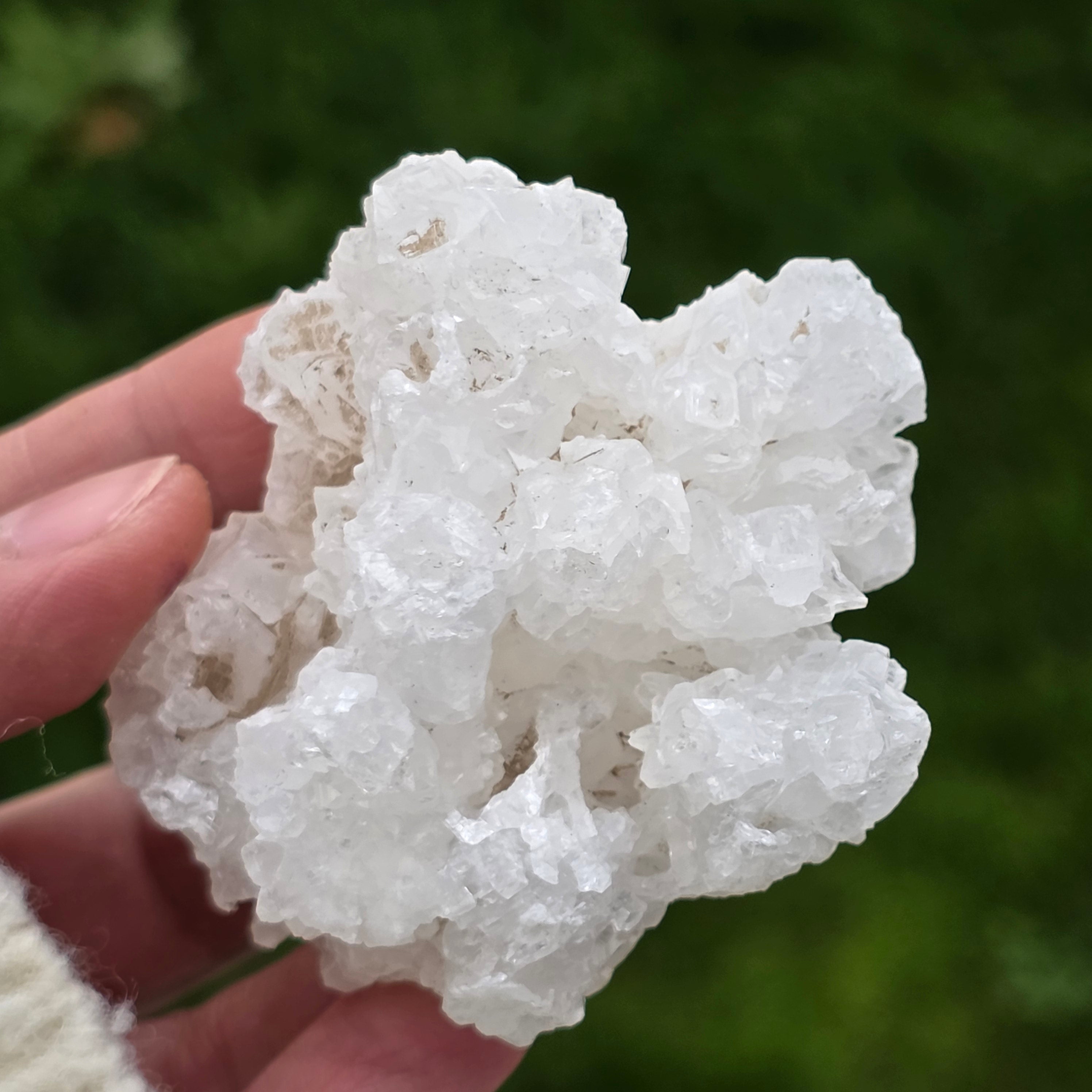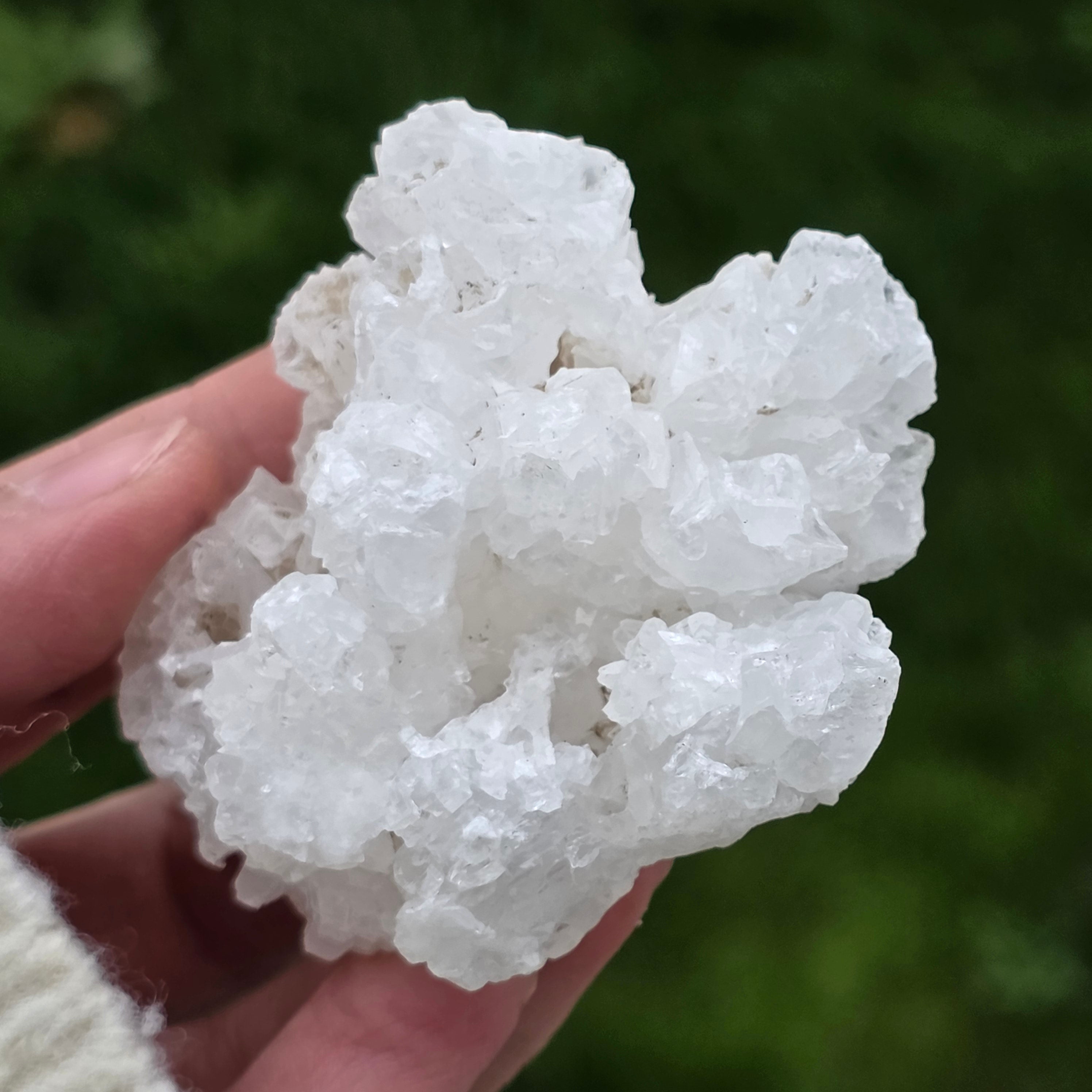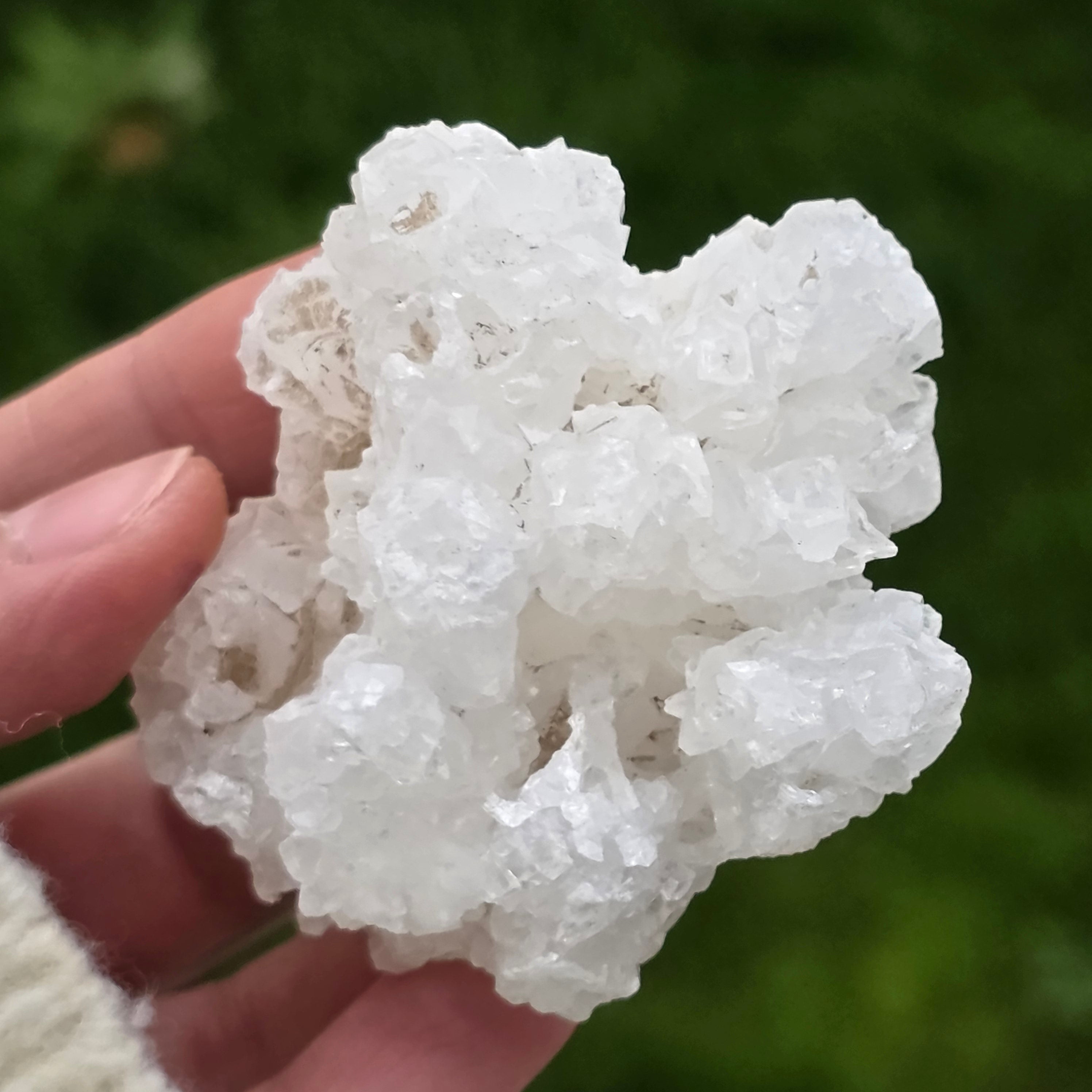 Cristalele sunt dispuse în structuri neregulate, rotunjite, cu suprafețe ușor sclipitoare, amintind de formațiuni întâlnite în interiorul peșterilor. Textura bogată și volumul bine definit conferă fiecărui exemplar un caracter autentic și expresiv, foarte apreciat în colecțiile de minerale și ca piesă decorativă naturală.