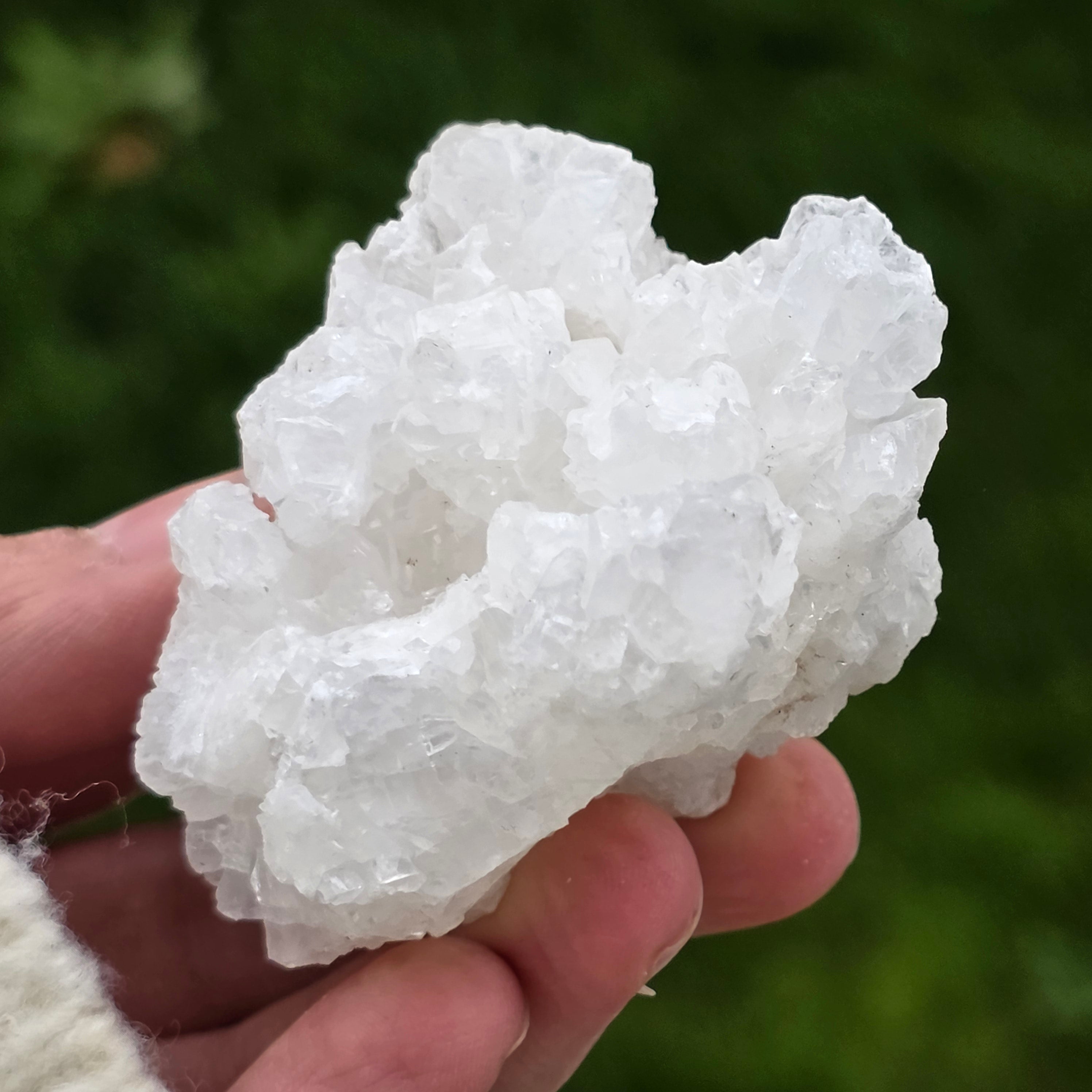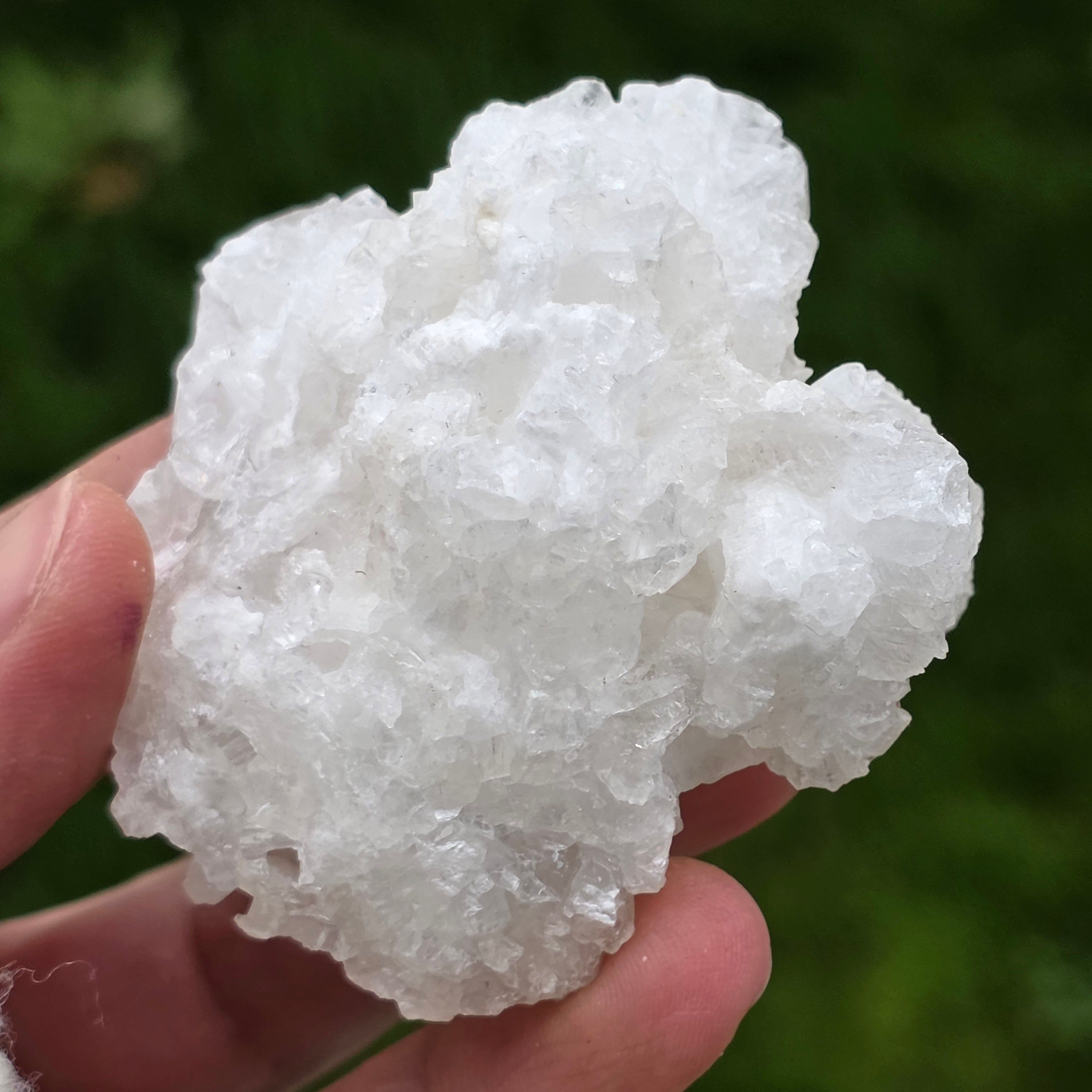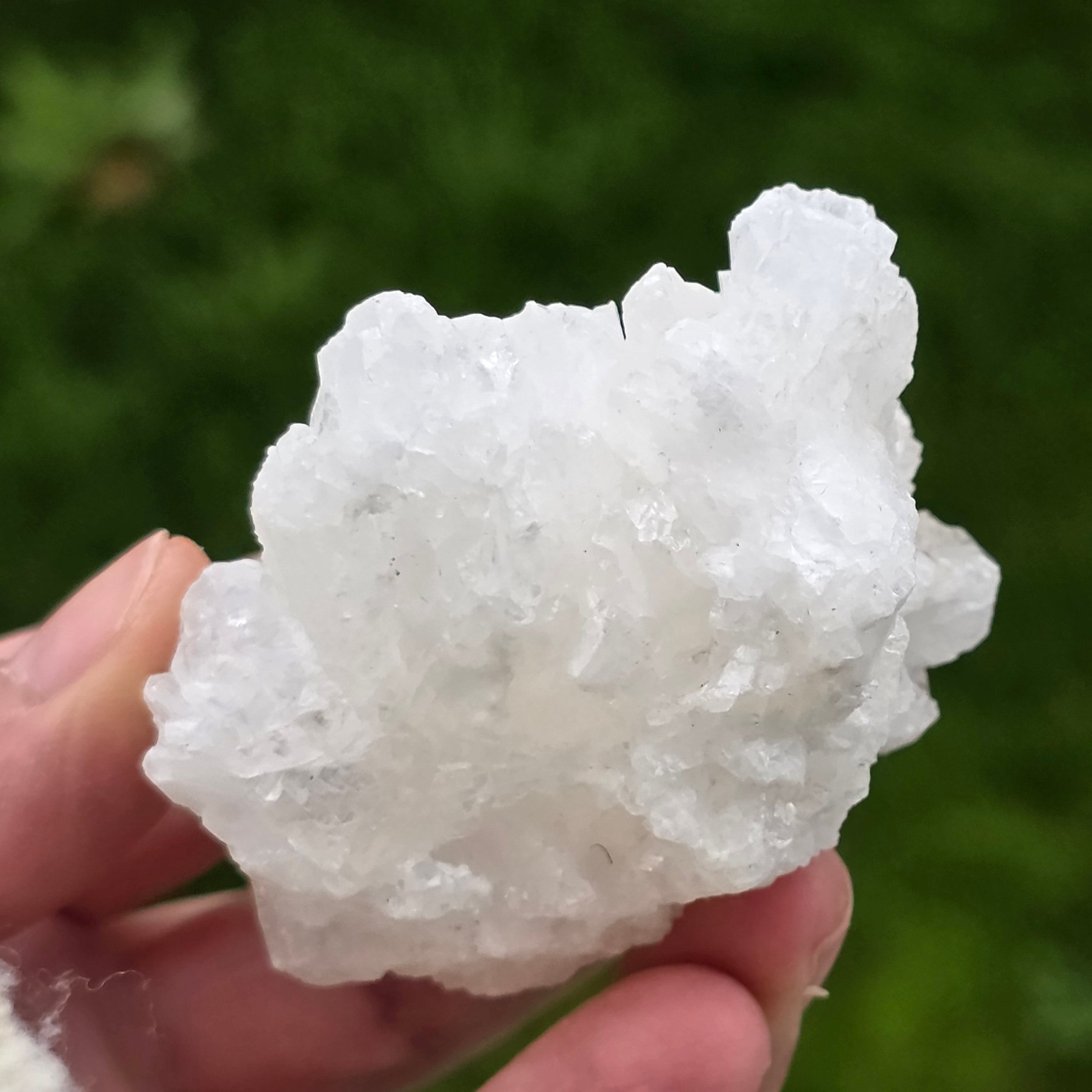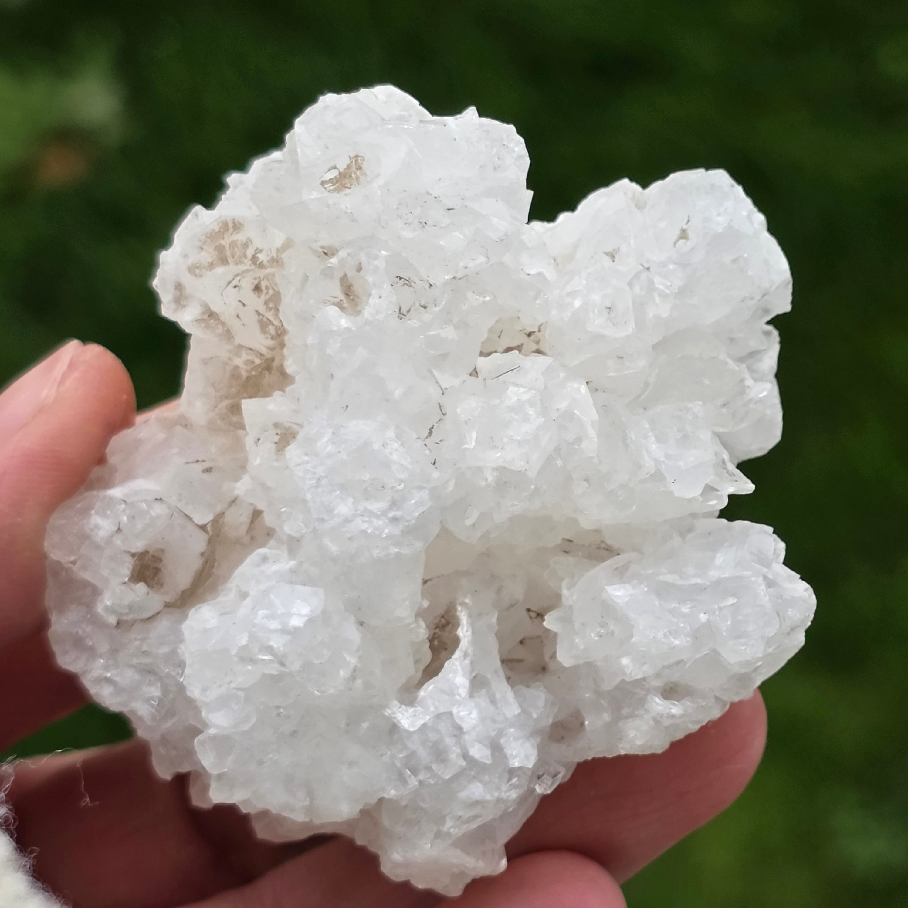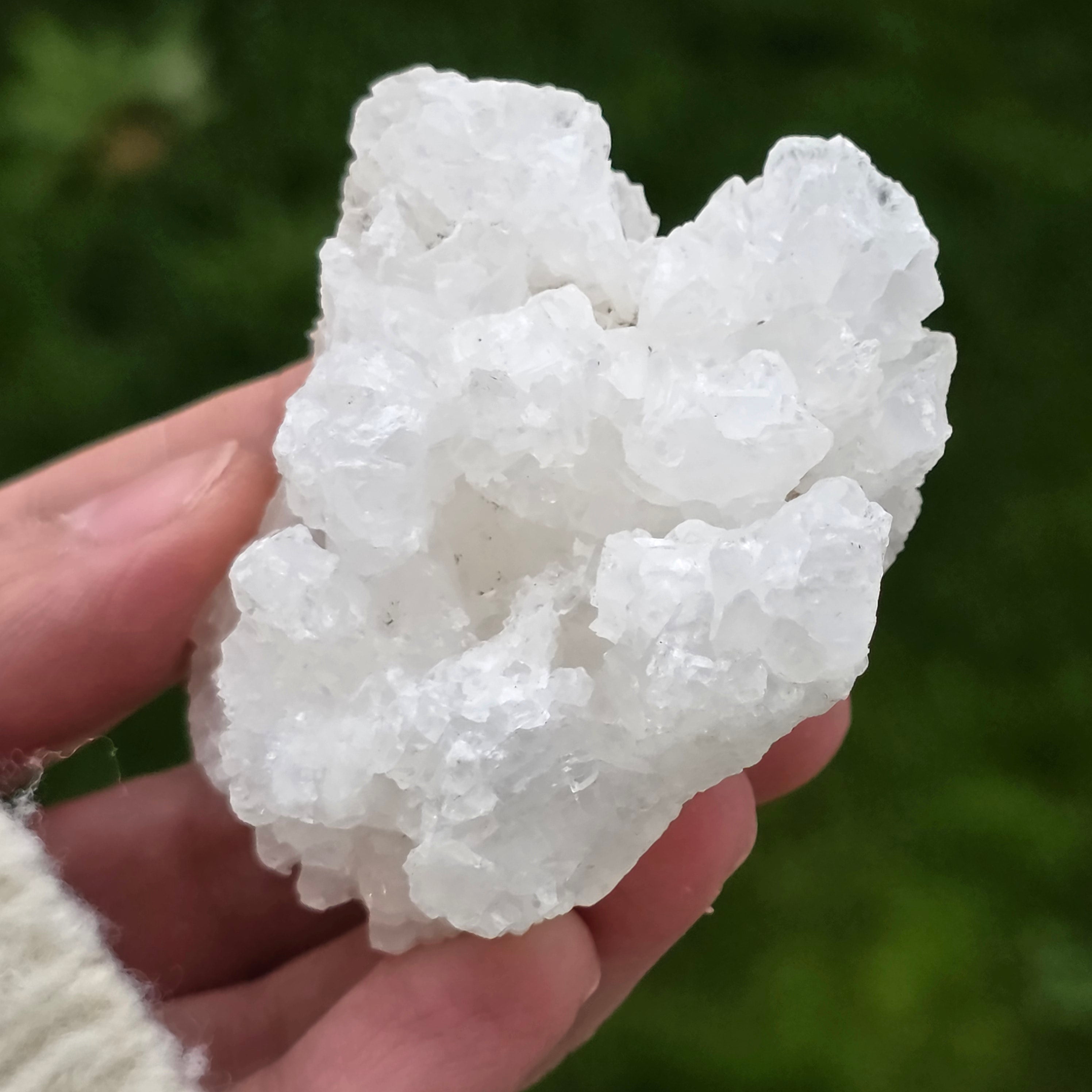 Cristalele sunt dispuse în structuri neregulate, rotunjite, cu suprafețe ușor sclipitoare, amintind de formațiuni întâlnite în interiorul peșterilor. Textura bogată și volumul bine definit conferă fiecărui exemplar un caracter autentic și expresiv, foarte apreciat în colecțiile de minerale și ca piesă decorativă naturală.