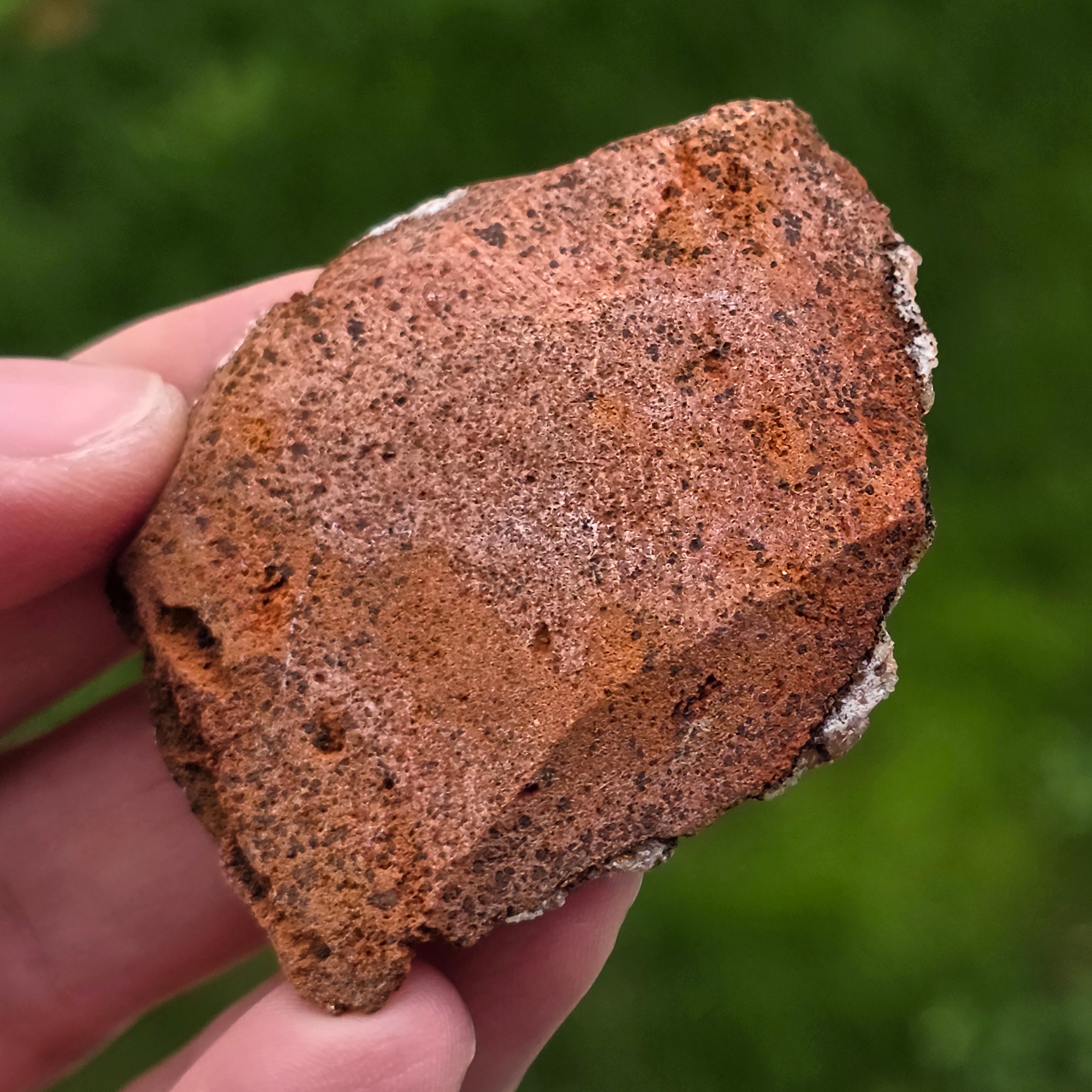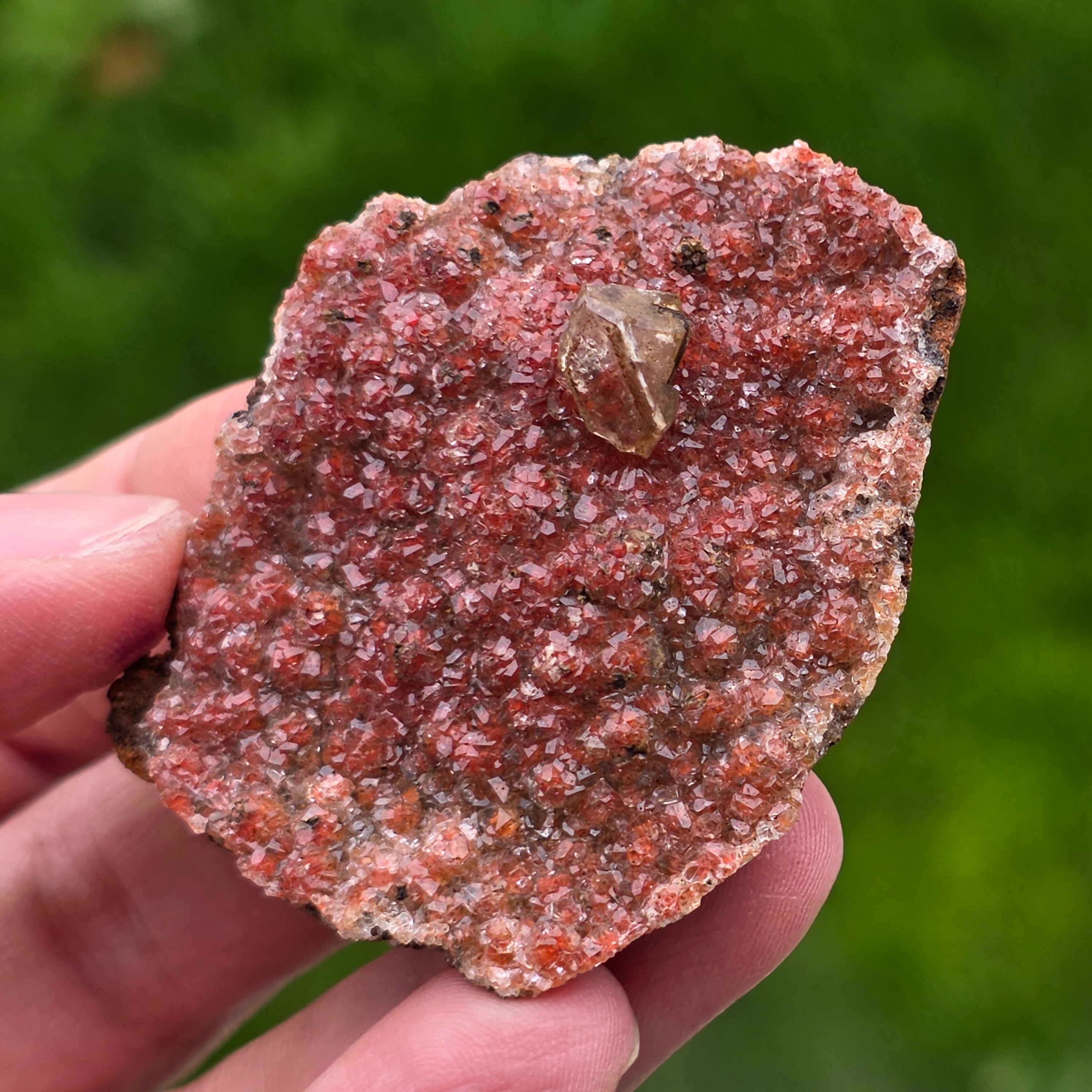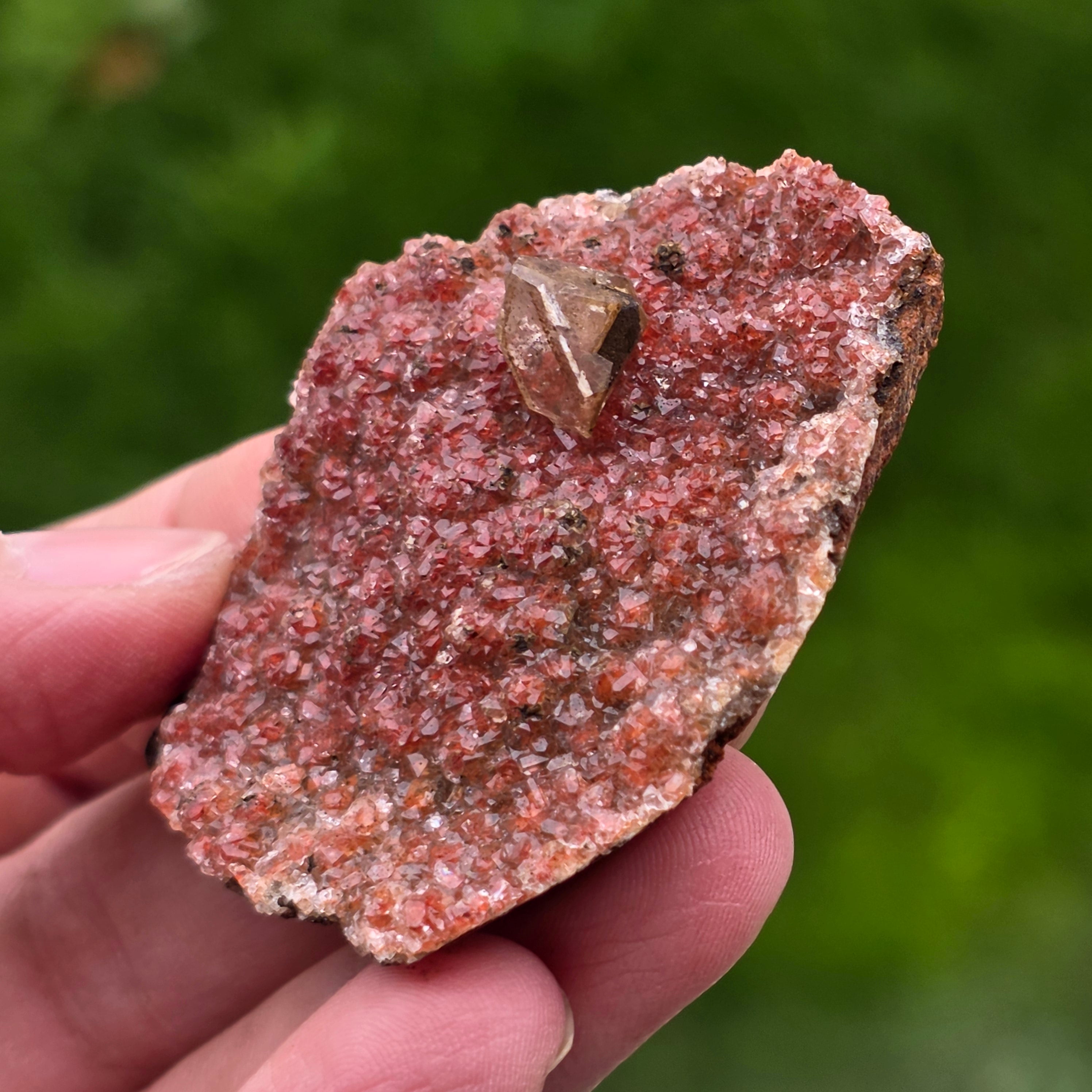 Cristalele de calcit prezintă habitul specific numit „diamond calcite”, caracterizat prin terminații bine definite și fețe strălucitoare, care reflectă lumina într-un mod subtil, dar expresiv. Dispunerea compactă a cristalelor creează o suprafață sclipitoare, cu textură bogată, fiecare piesă fiind diferită ca formă, intensitate a culorii și distribuție a cristalelor.