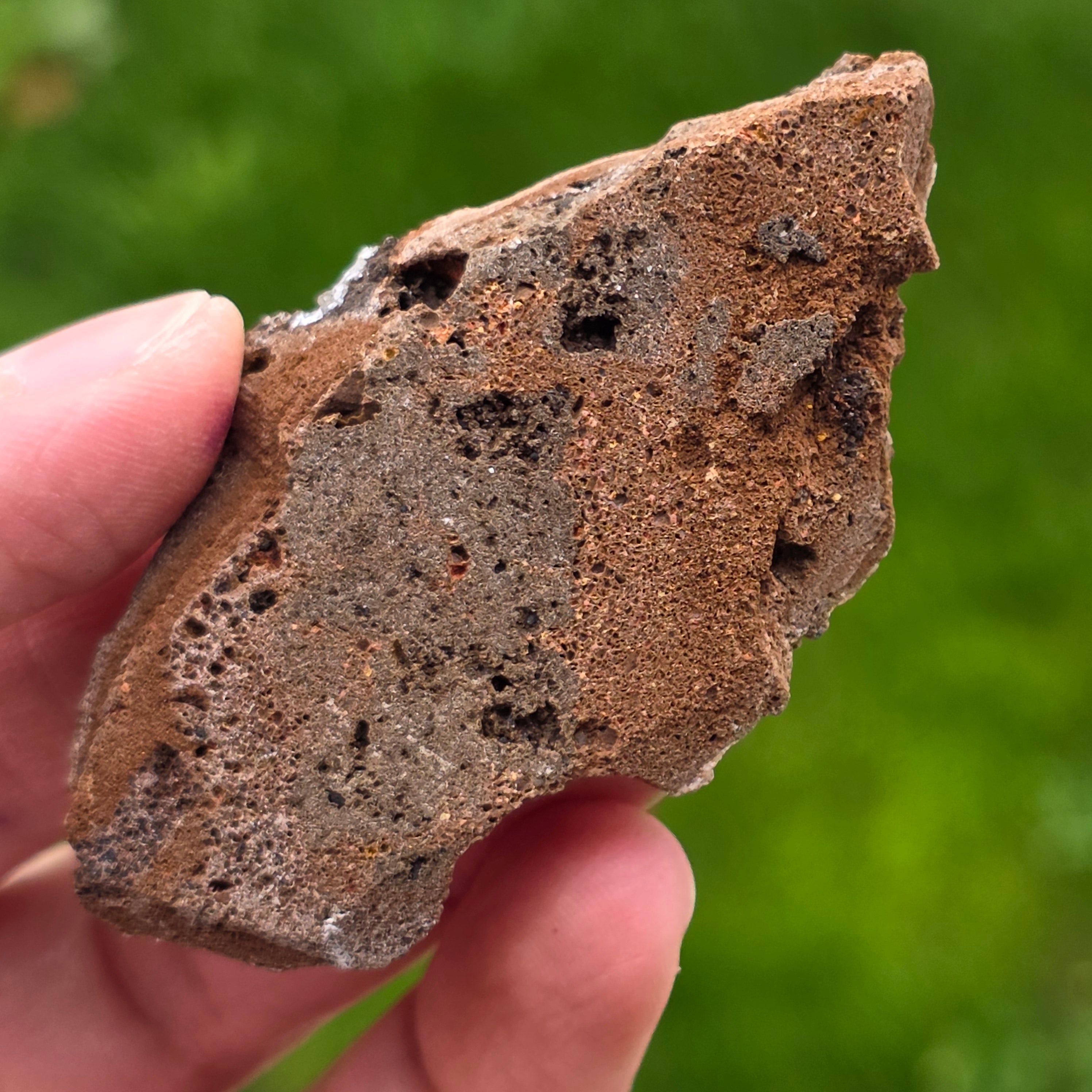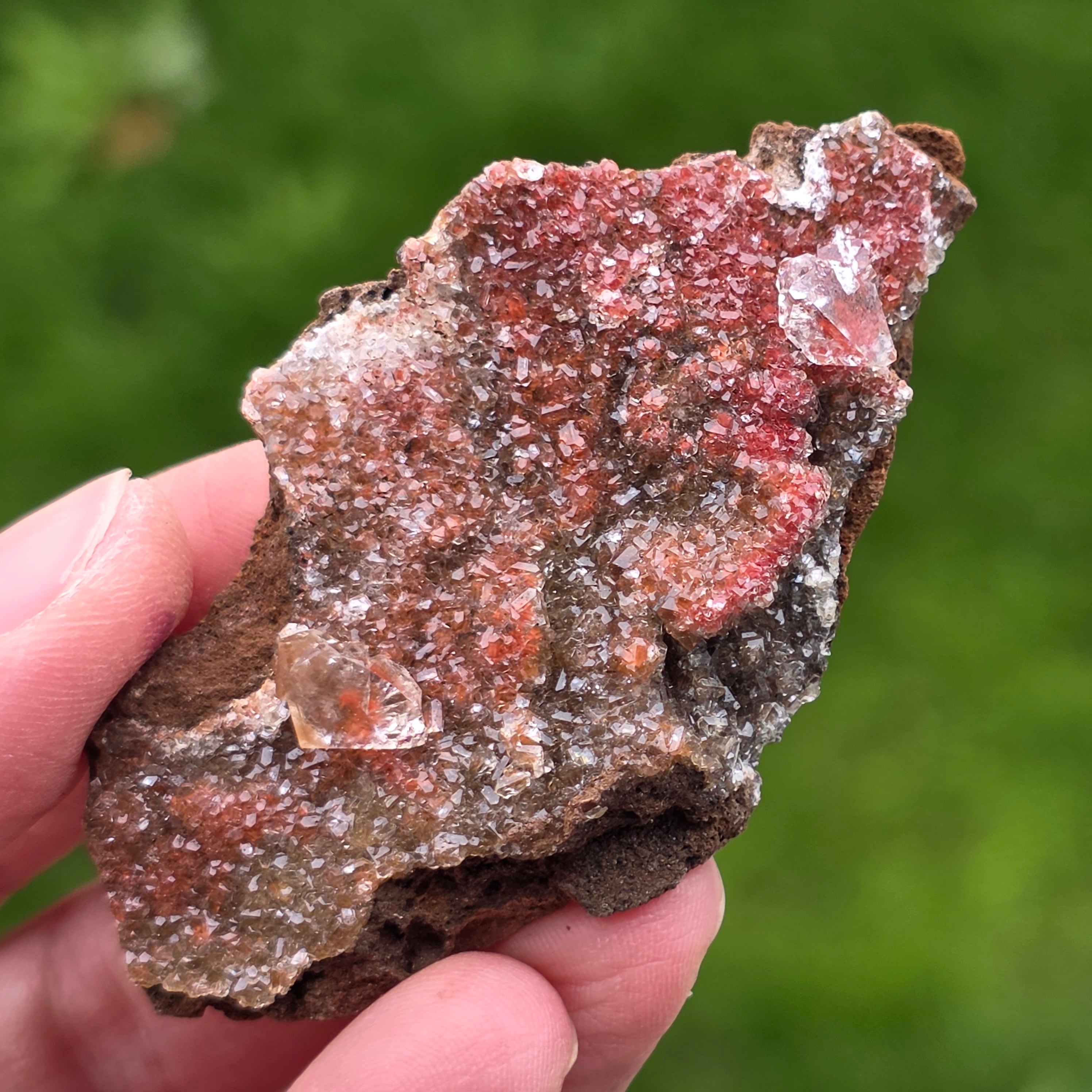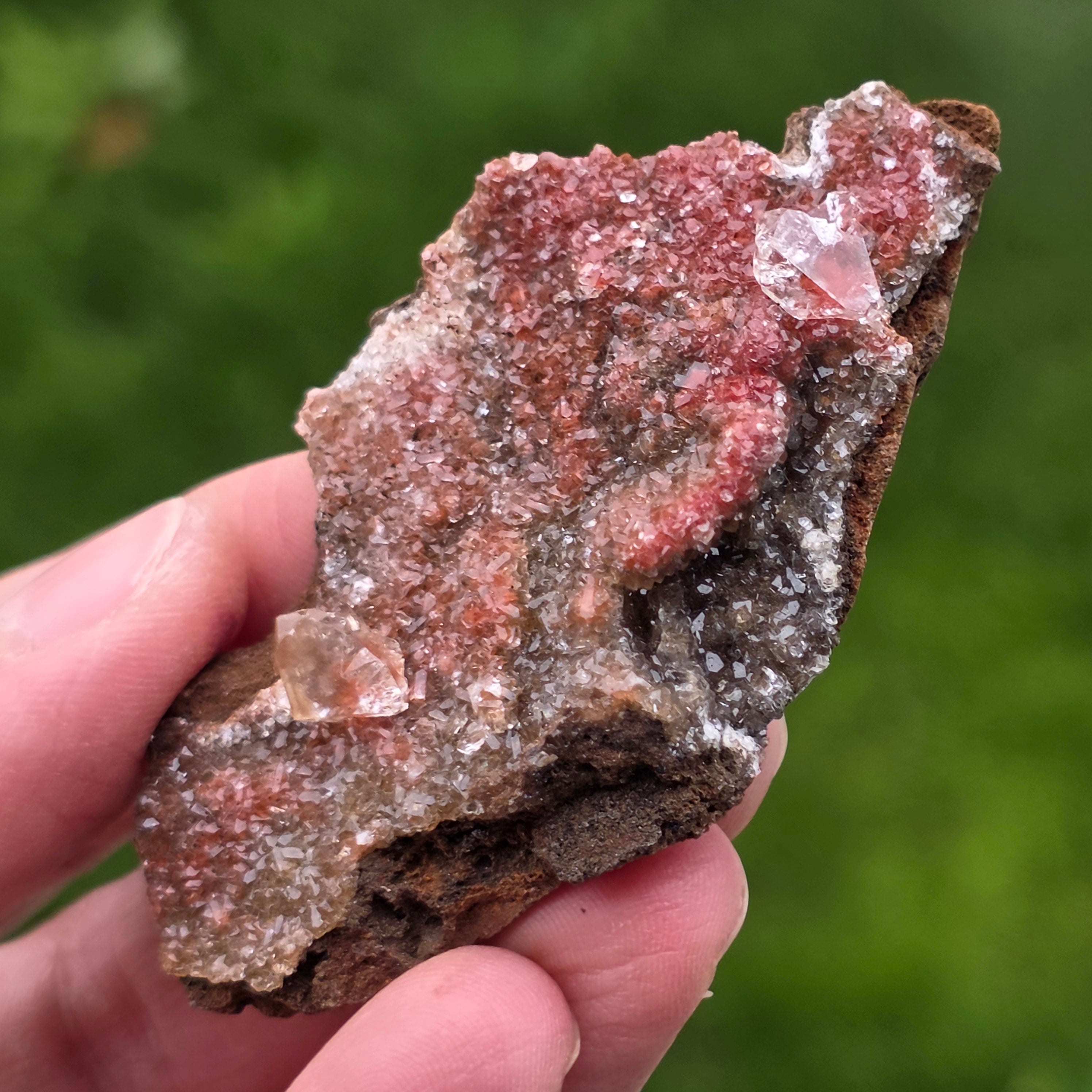 Cristalele de calcit prezintă habitul specific numit „diamond calcite”, caracterizat prin terminații bine definite și fețe strălucitoare, care reflectă lumina într-un mod subtil, dar expresiv. Dispunerea compactă a cristalelor creează o suprafață sclipitoare, cu textură bogată, fiecare piesă fiind diferită ca formă, intensitate a culorii și distribuție a cristalelor.