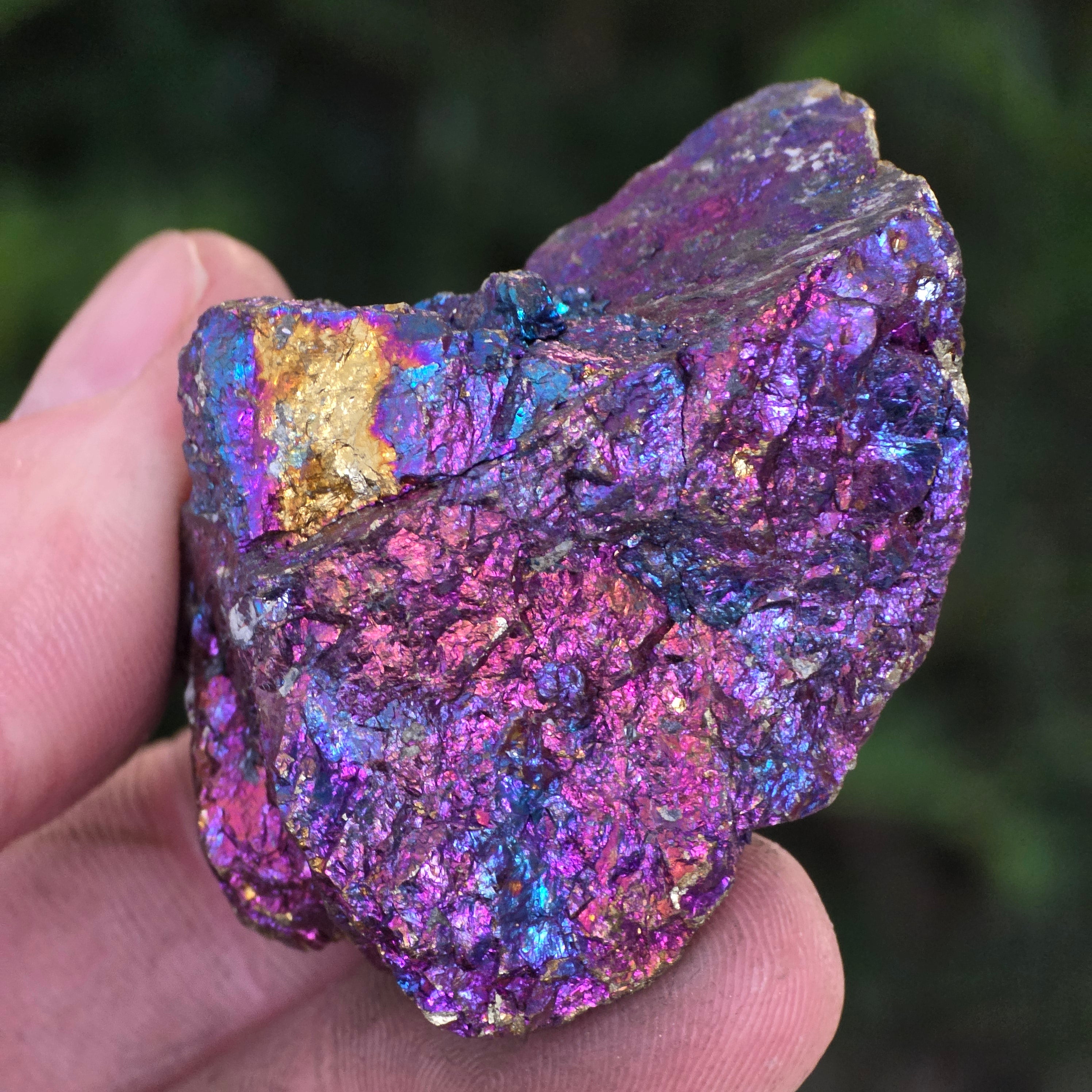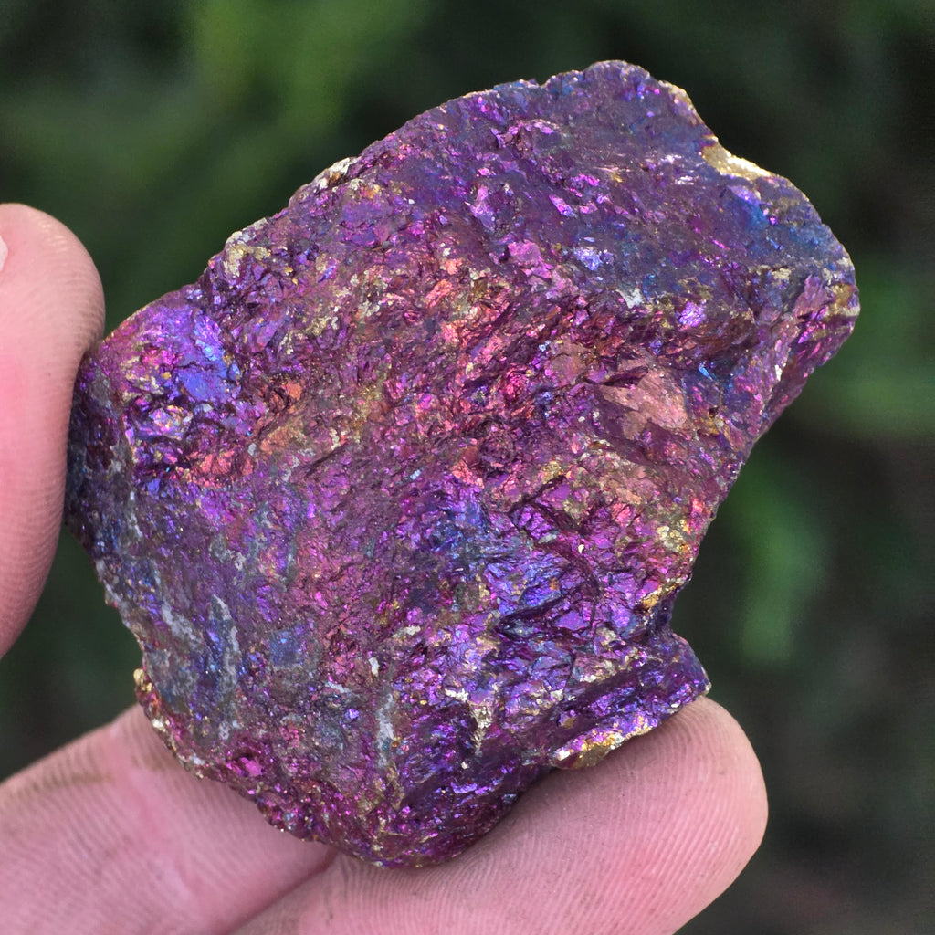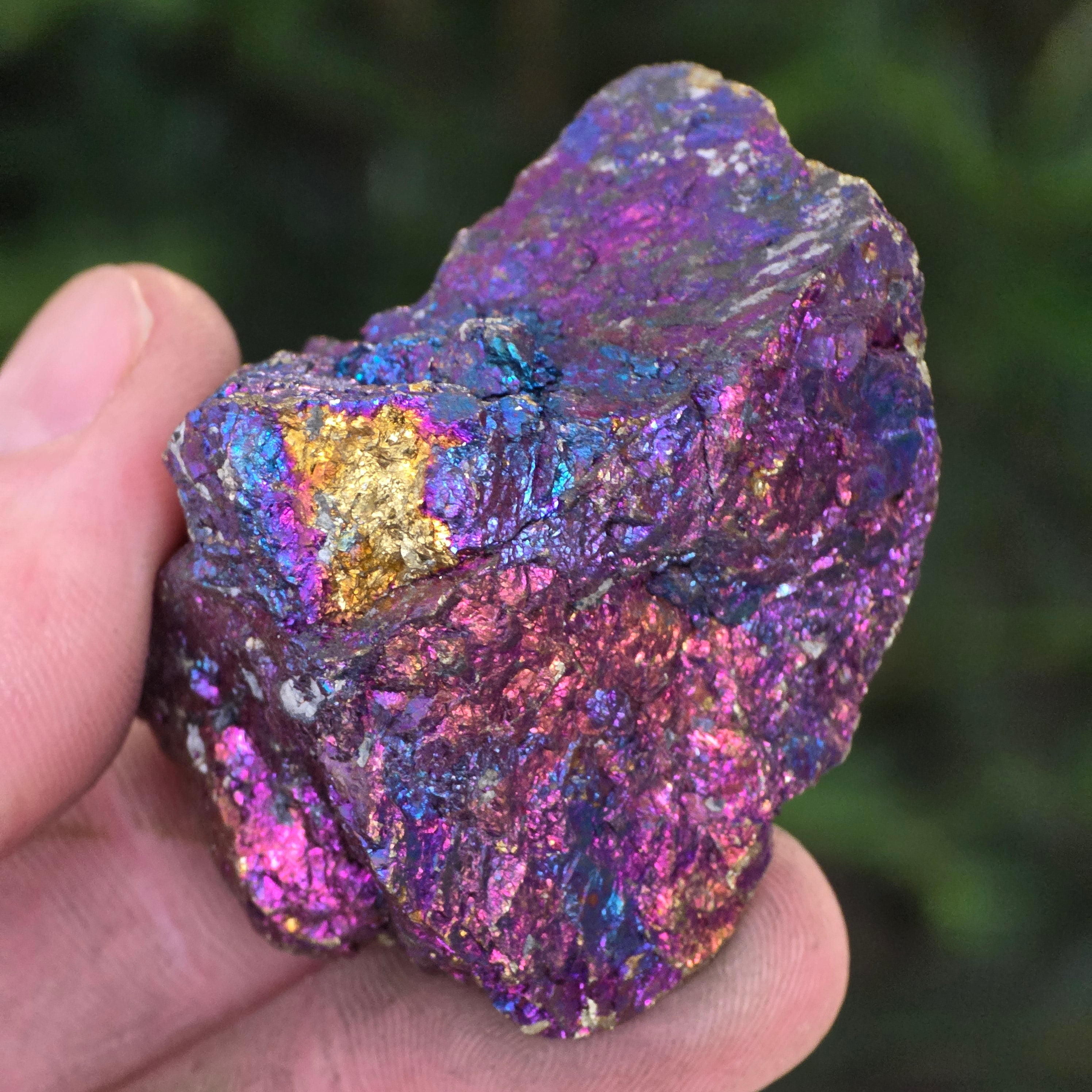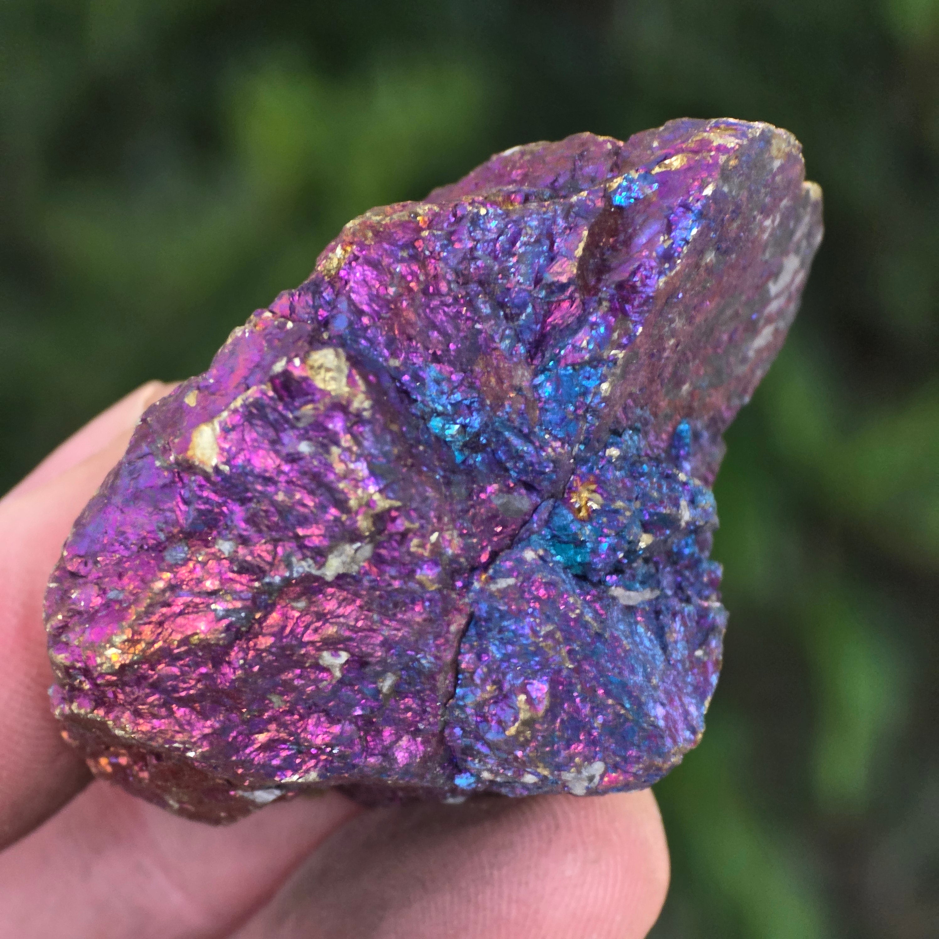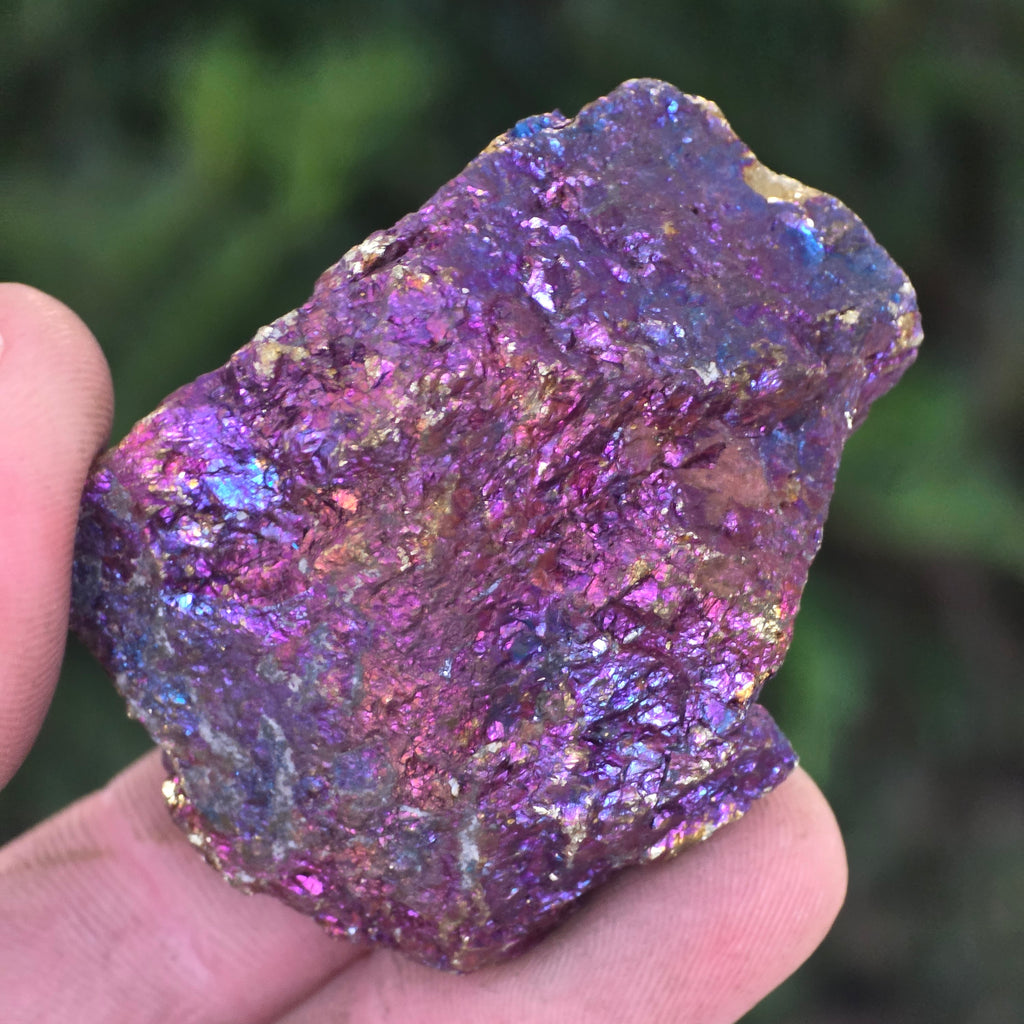 Calcopirita albastră și cea mov sunt asociate cu creșterea spirituală, intuiția și conectarea cu energiile superioare. Se crede că ajută la calmarea minții și stimularea creativității. Nuanțele sale irizate sunt legate simbolic de echilibru și armonie.