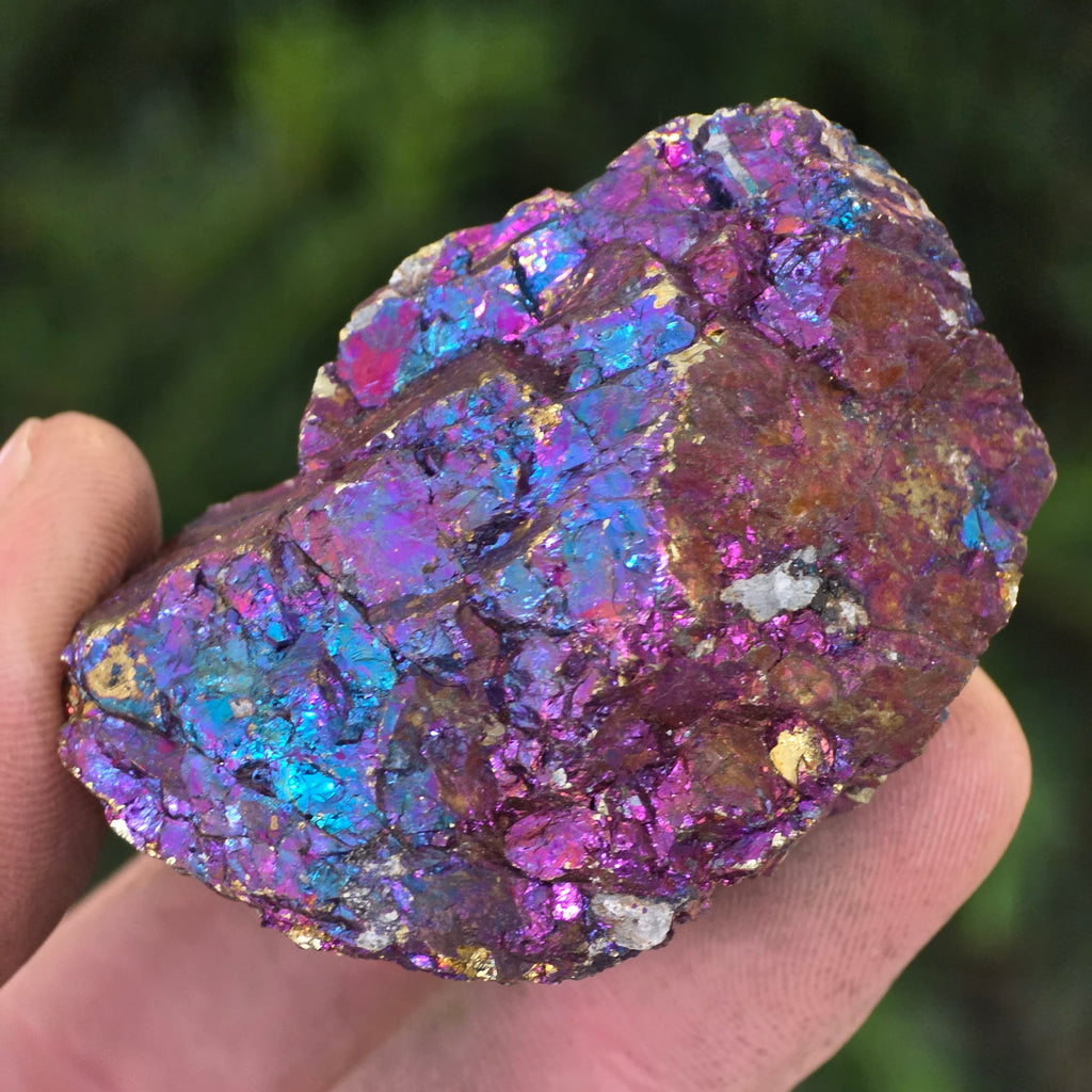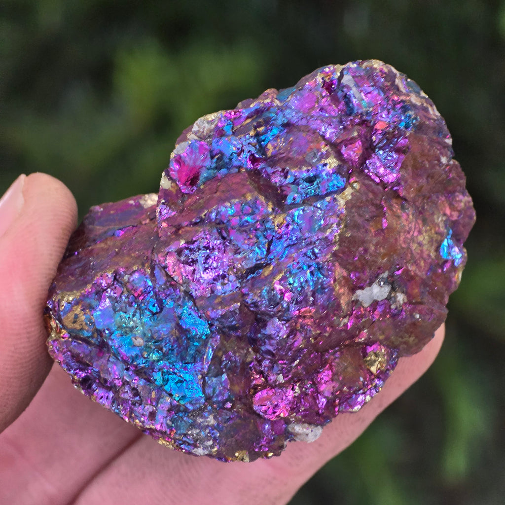 Calcopirita albastră și cea mov sunt asociate cu creșterea spirituală, intuiția și conectarea cu energiile superioare. Se crede că ajută la calmarea minții și stimularea creativității. Nuanțele sale irizate sunt legate simbolic de echilibru și armonie.