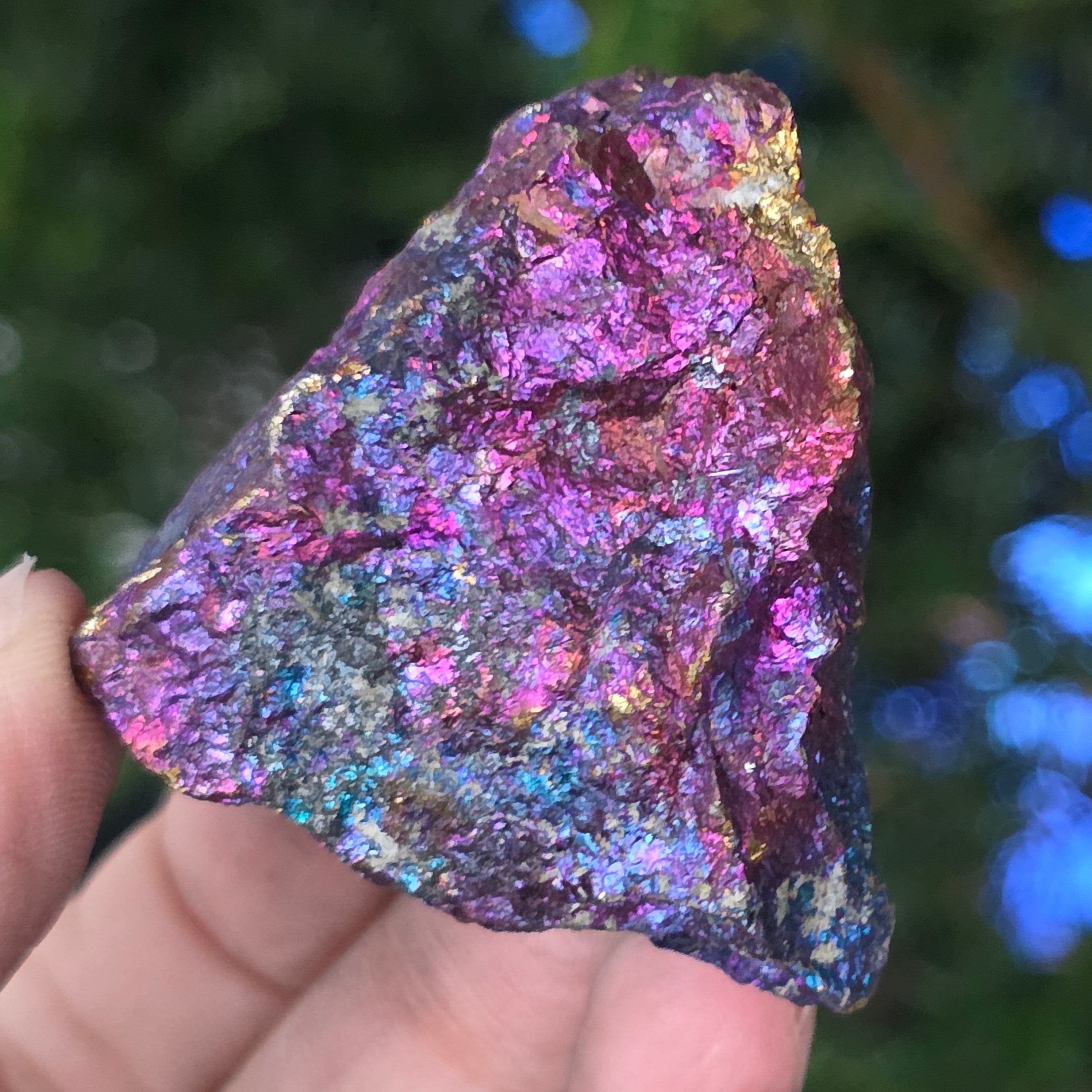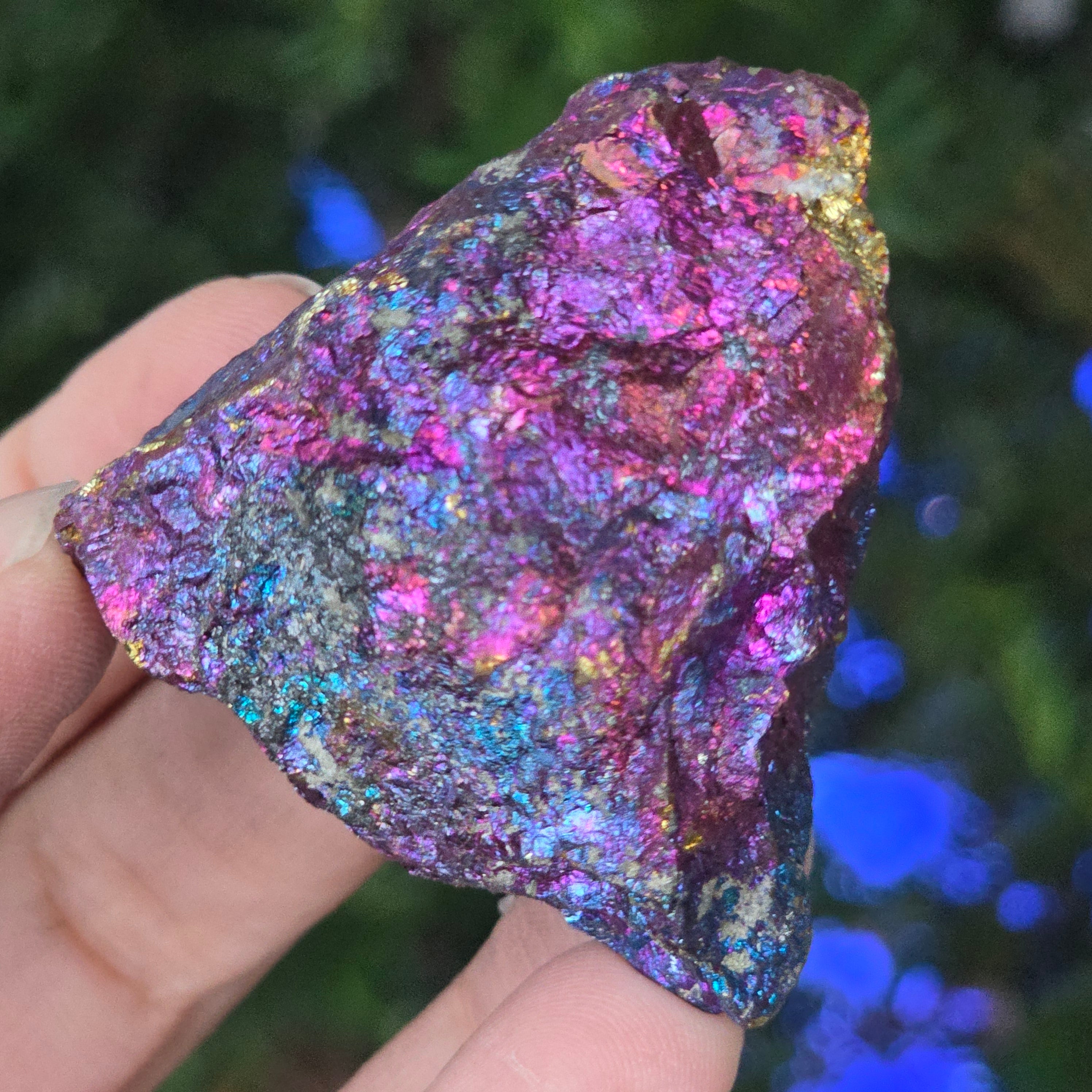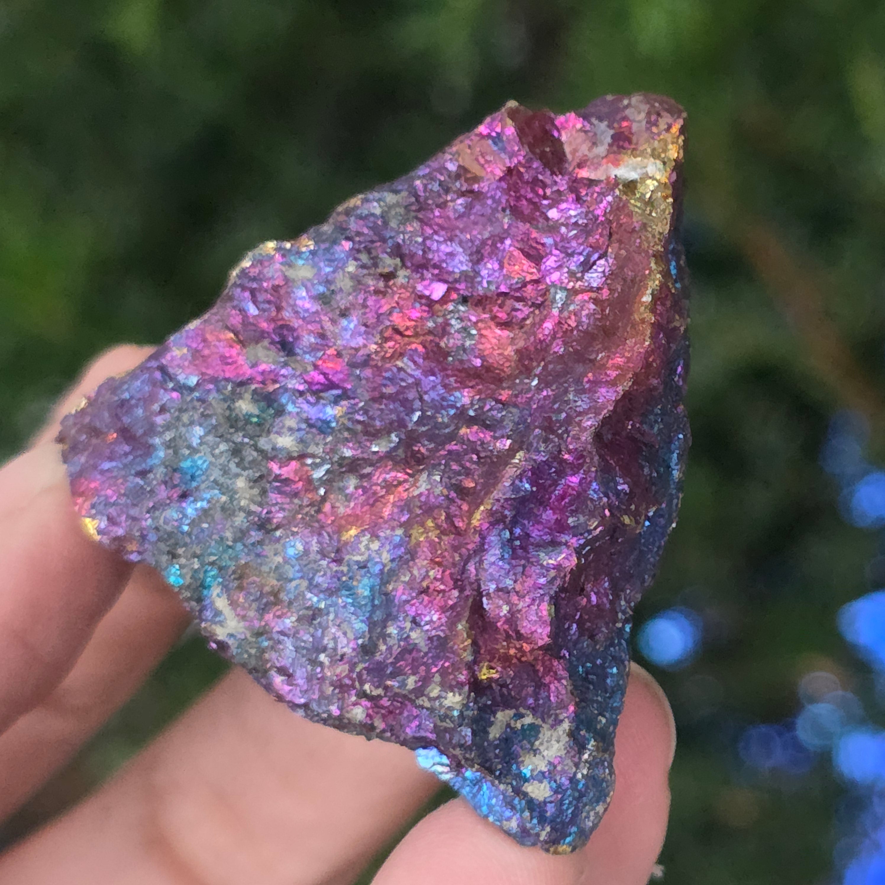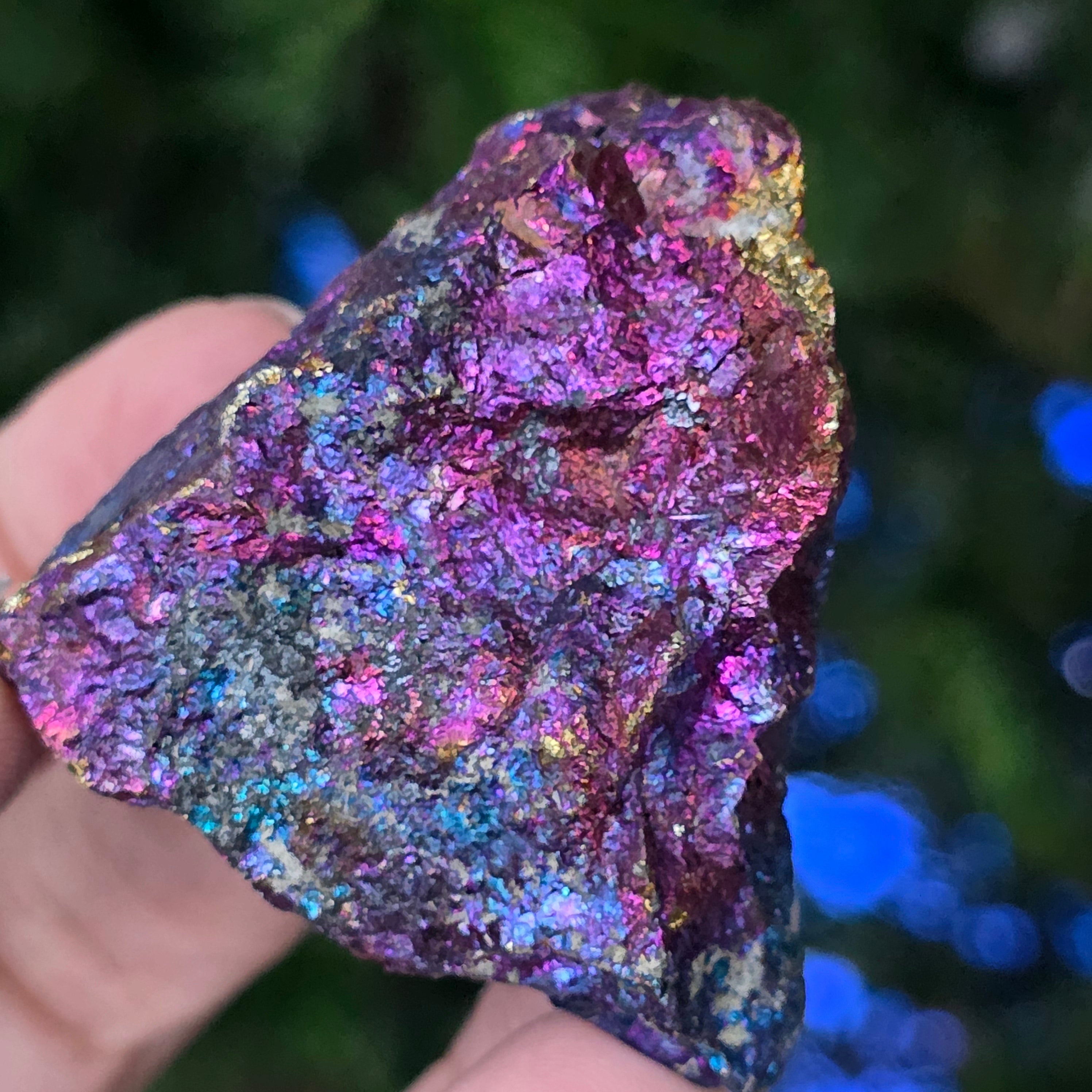 Calcopirita albastră și cea mov sunt asociate cu creșterea spirituală, intuiția și conectarea cu energiile superioare. Se crede că ajută la calmarea minții și stimularea creativității. Nuanțele sale irizate sunt legate simbolic de echilibru și armonie.