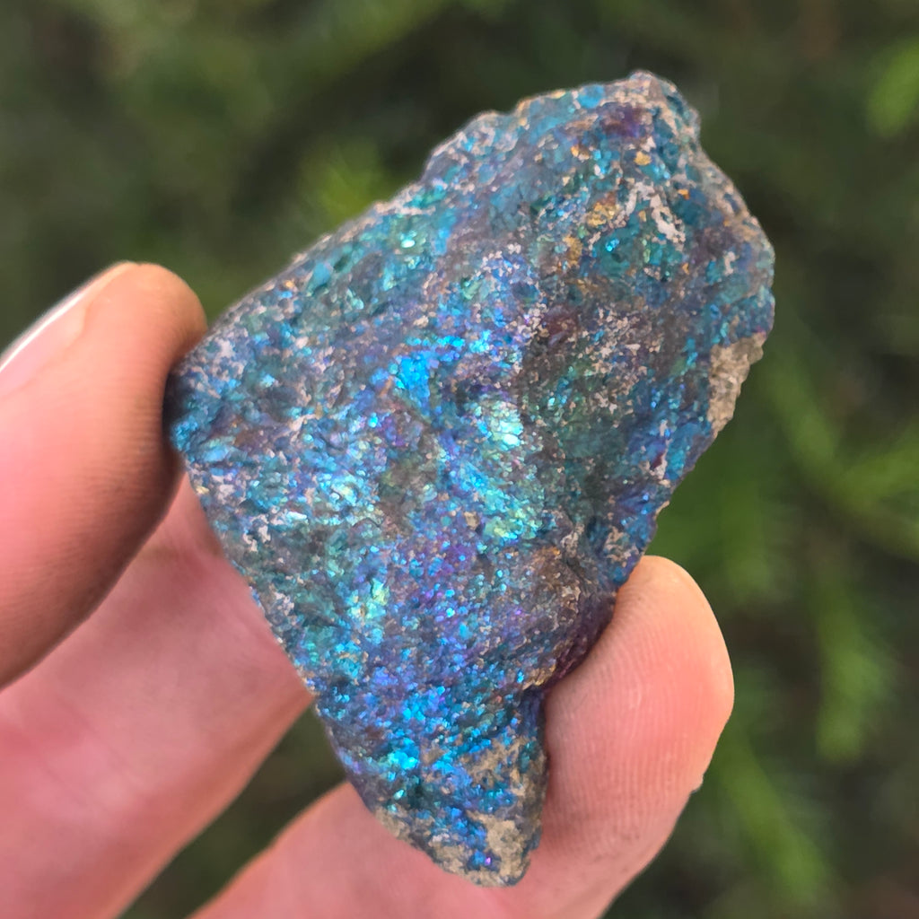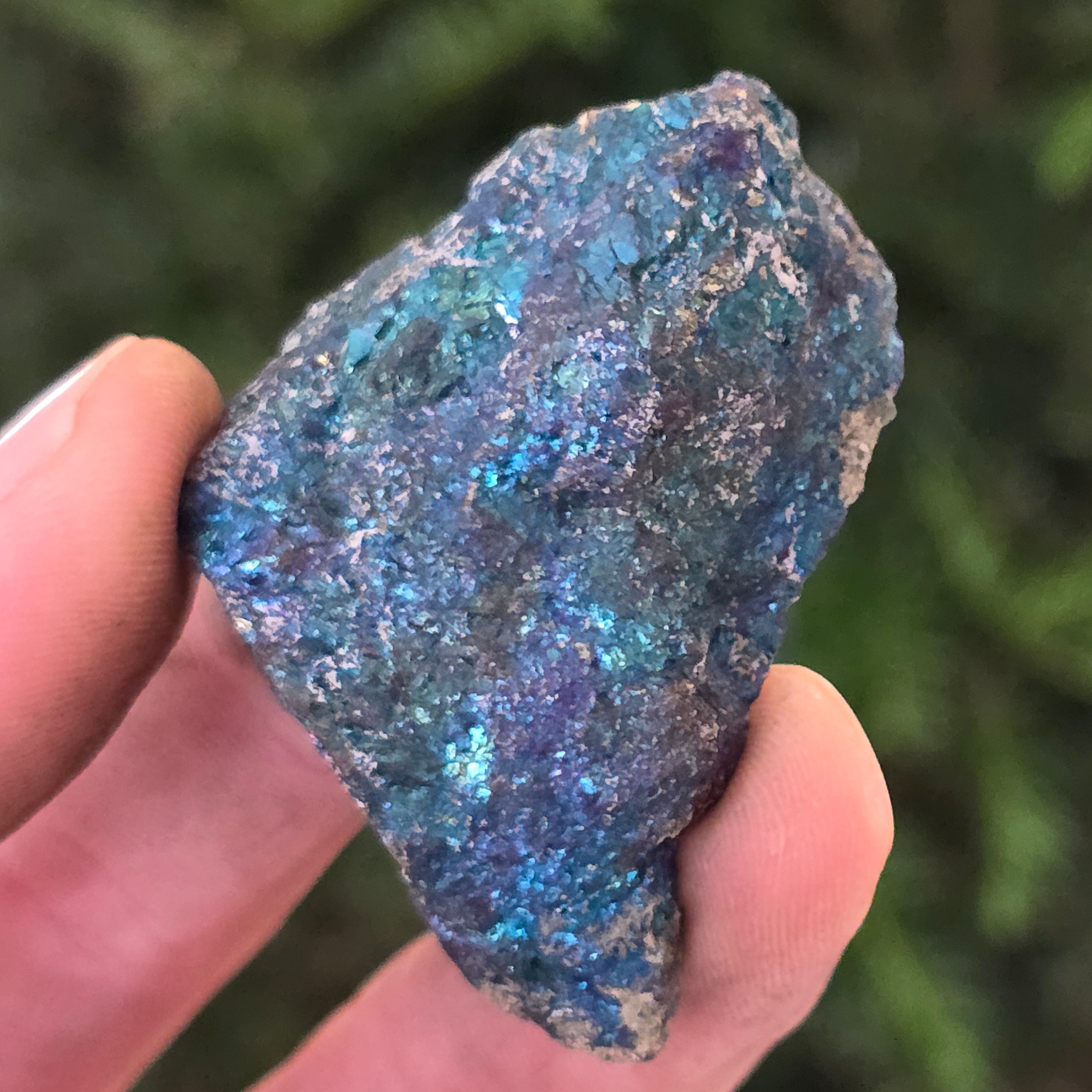 Calcopirita albastră, cunoscută și sub denumirea de calcopirită iridescentă, este un tip de calcopirită care prezintă nuanțe strălucitoare de albastru, mov, verde sau alte culori irizate. Această irizație este cauzată de un strat subțire de oxidare pe suprafața mineralului, un proces natural care apare când calcopirita este expusă la aer și umezeală pentru o perioadă îndelungată.