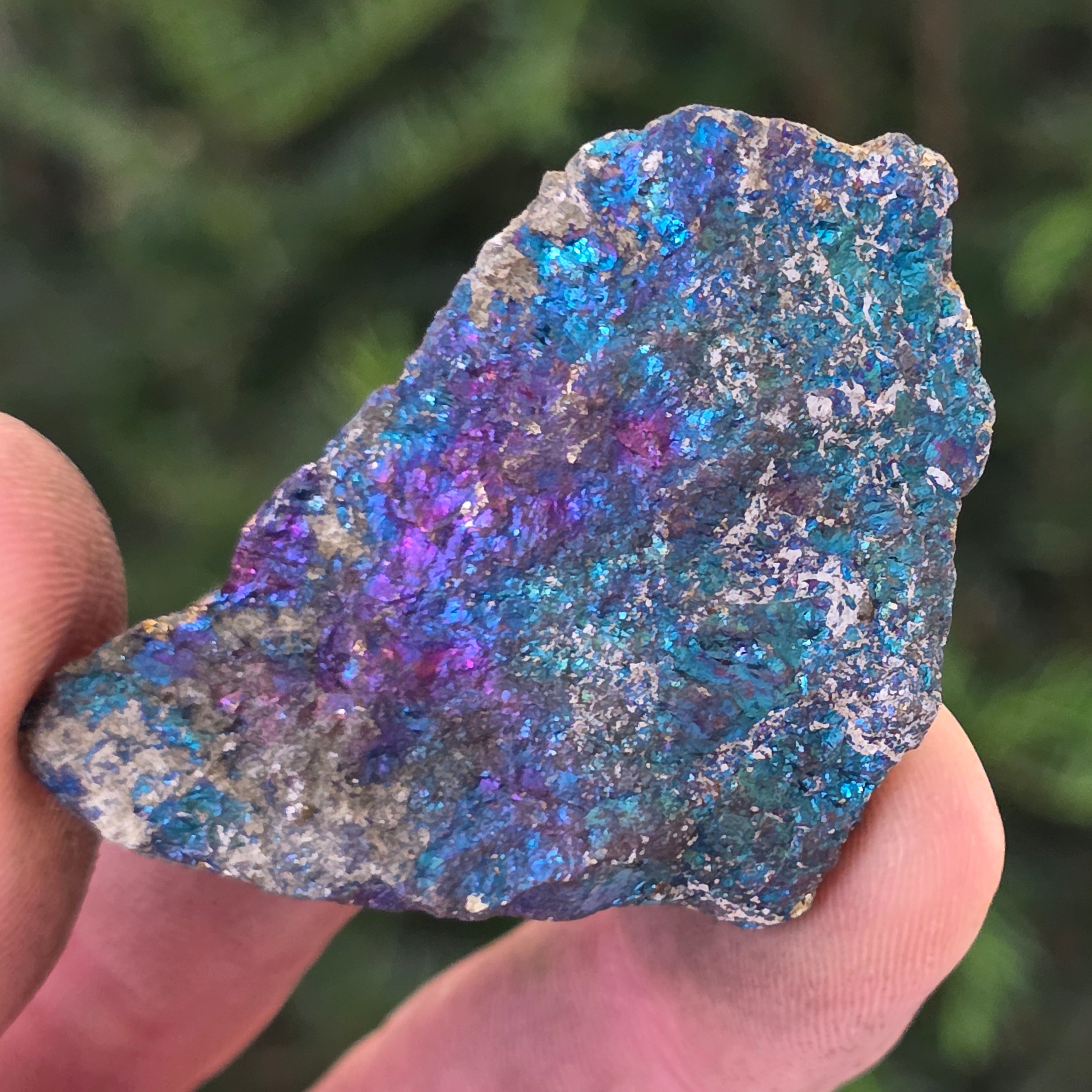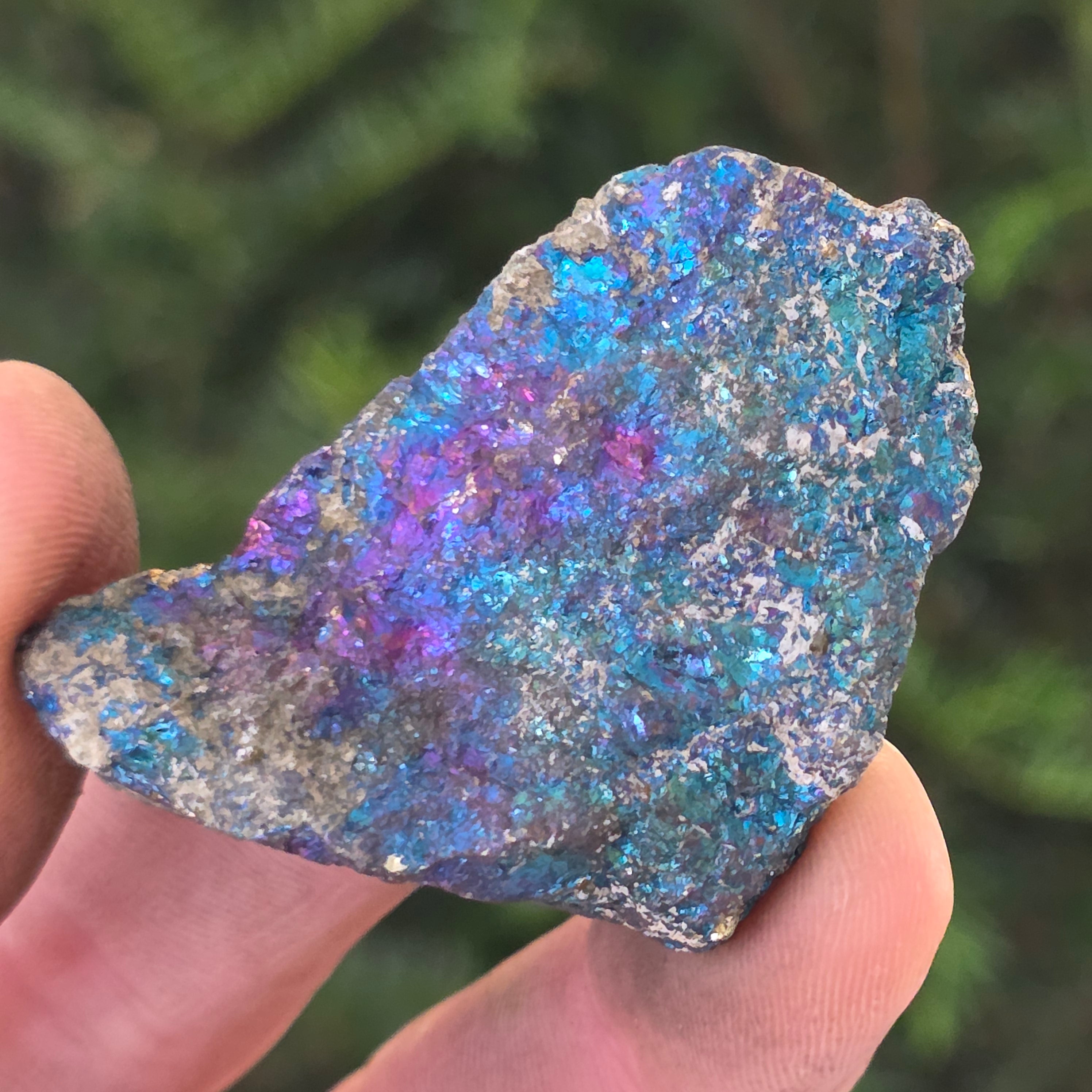Calcopirita albastră și cea mov sunt asociate cu creșterea spirituală, intuiția și conectarea cu energiile superioare. Se crede că ajută la calmarea minții și stimularea creativității. Nuanțele sale irizate sunt legate simbolic de echilibru și armonie.