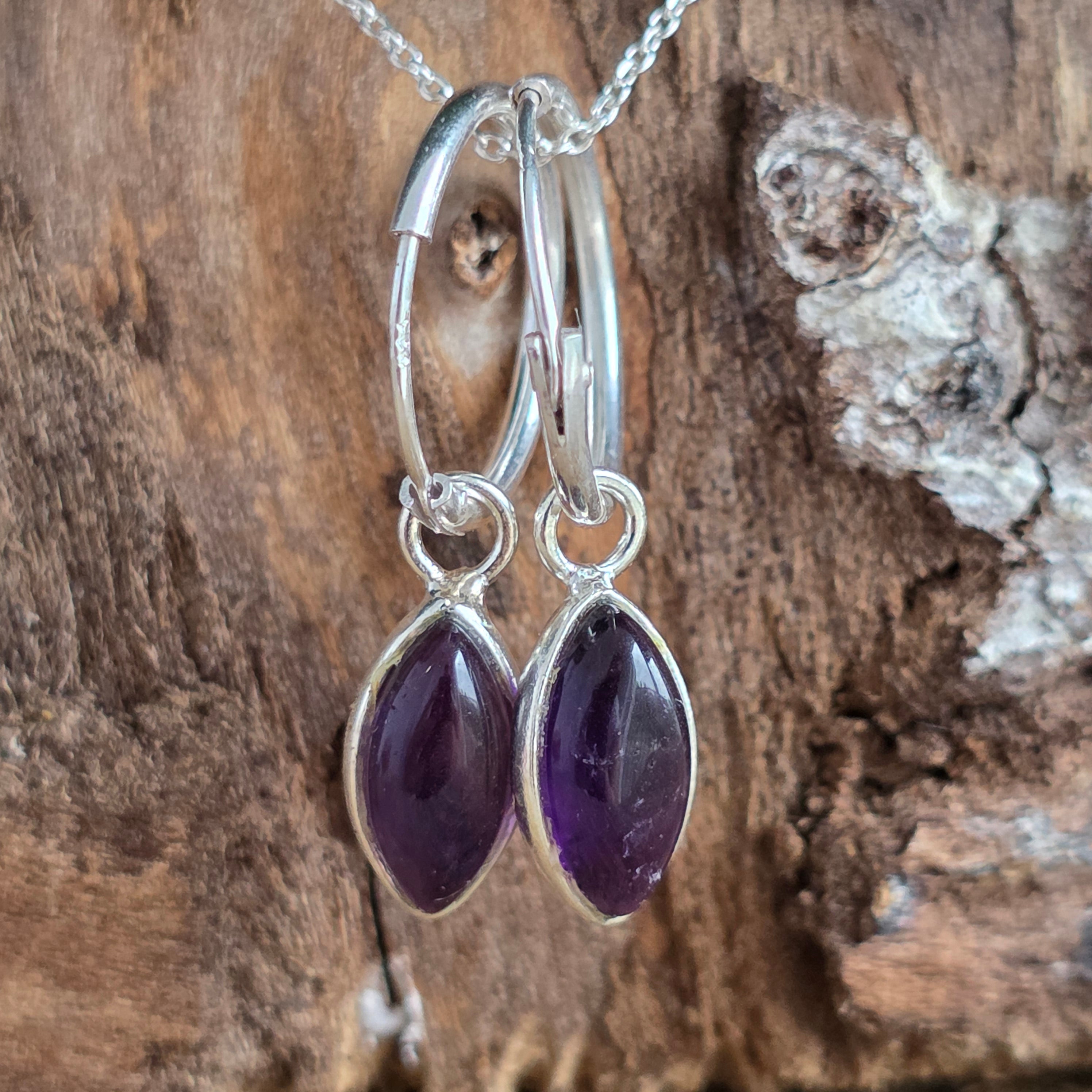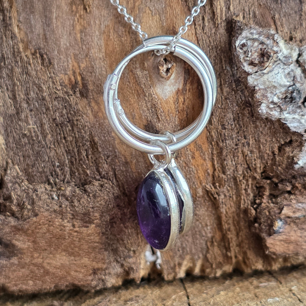 Acești cercei din argint 925 aduc o notă de rafinament modern, prin combinația dintre simplitatea cercurilor fine și intensitatea hipnotică a pietrei de ametist natural.