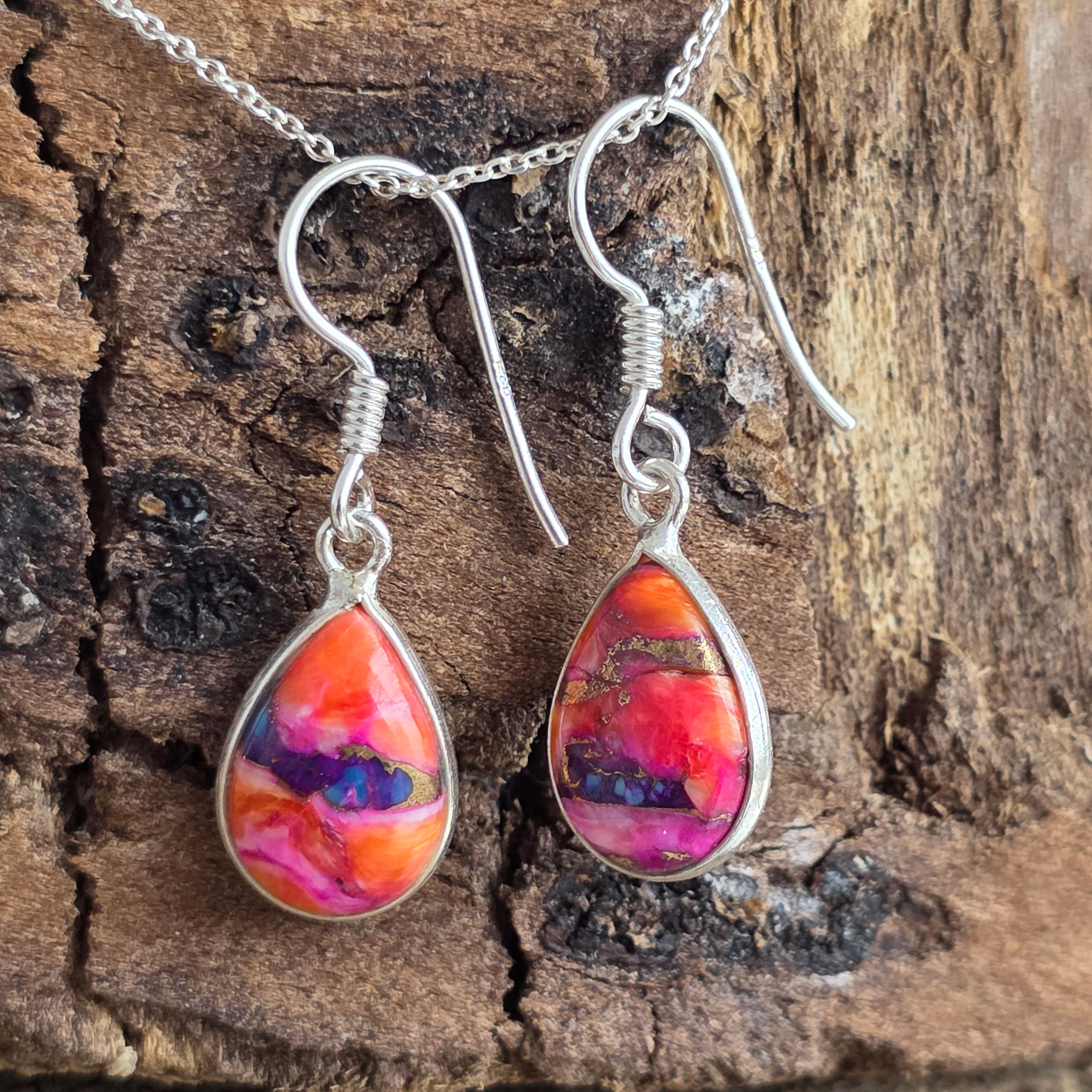 Acești cercei din argint 925 aduc o explozie de culoare și energie pozitivă, datorită pietrelor de Pink Dahlia Copper Turquoise, un amestec spectaculos de nuanțe roz-magenta, portocalii și albastre, străbătute de vene fine de cupru natural.