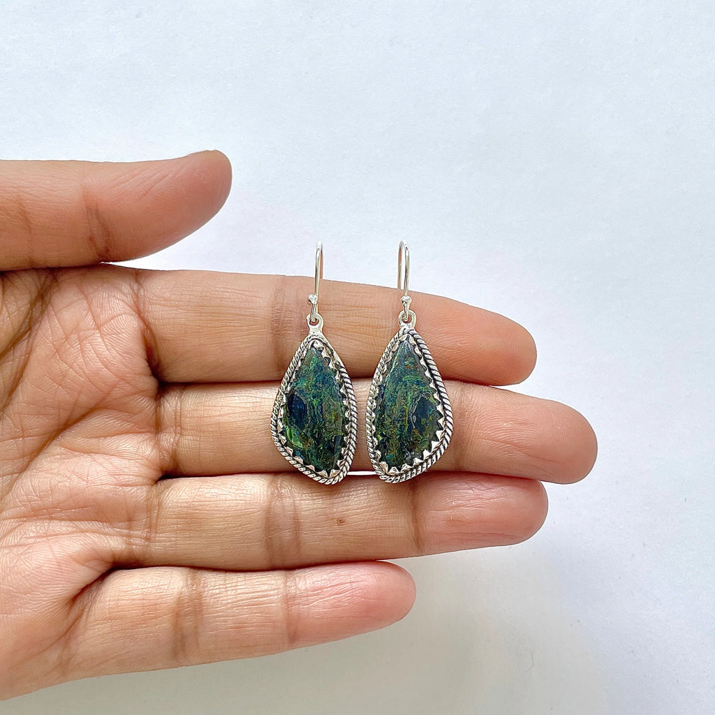 Azurit-malachitul este considerat o piatră a vindecării și a conexiunii spirituale cu energia planetei. El susține intuiția, echilibrul emoțional și deschiderea către înțelepciunea interioară. Purtând acești cercei, vei simți că porți cu tine o fărâmă din respirația sacră a Pământului.