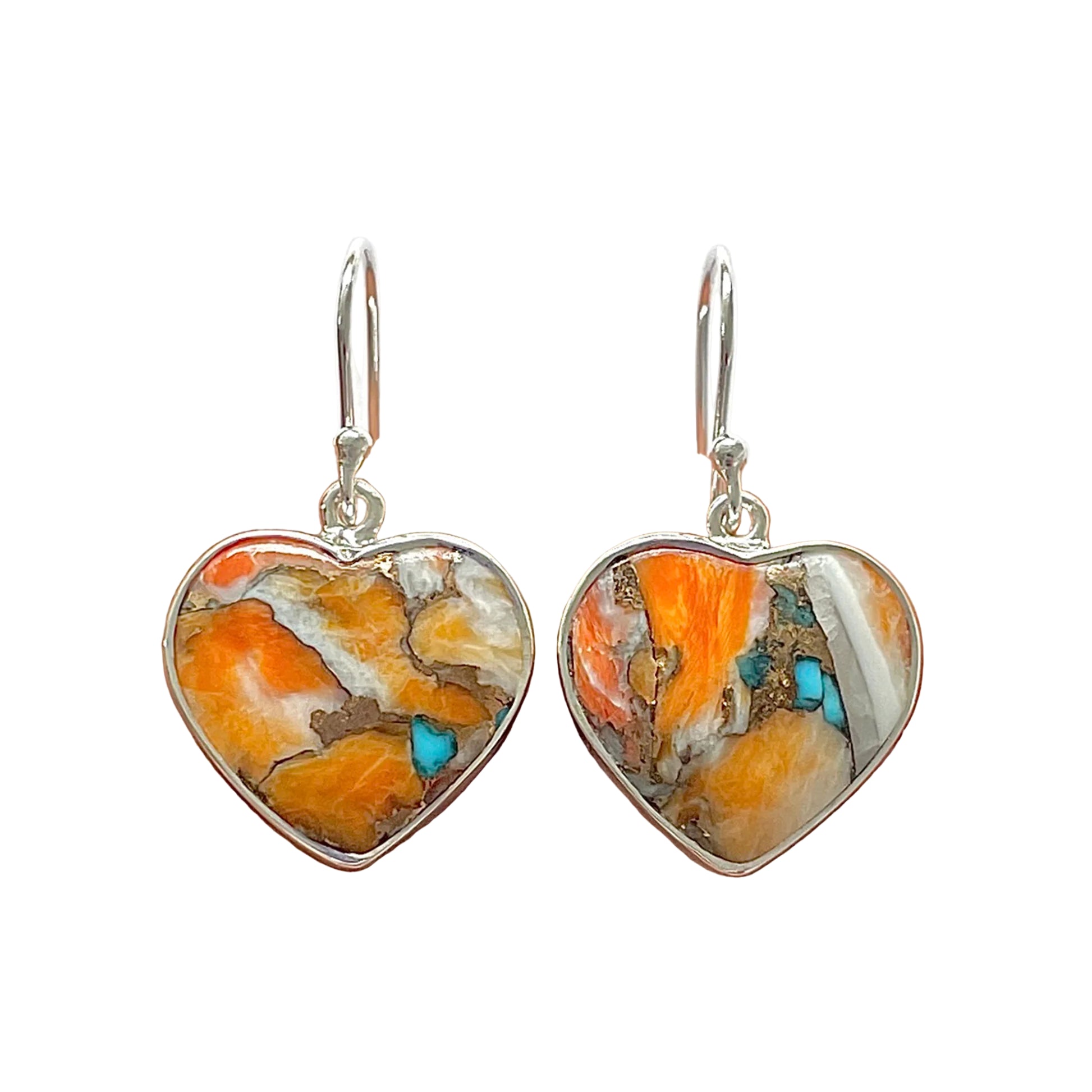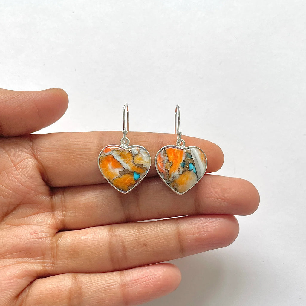 Acești cercei inimă din argint 925 cu Spiny Oyster Turquoise captivează privirea prin explozia de culori calde, unde portocaliul intens al scoicii spiny oyster se împletește cu alb sidefat, nuanțe pământii și accente turcoaz. Fiecare pereche este unică, asemenea unei picturi naturale, imposibil de reprodus.