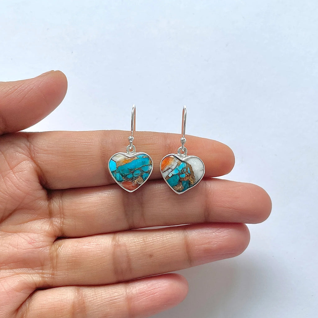 Acești cercei inimă din argint 925 cu Spiny Oyster Turquoise aduc la viață frumusețea oceanului și a apusurilor de foc. Piatra naturală combină turcoaz intens, fragmente albe sidefate și accente portocalii vibrante, creând un tablou mineral plin de contrast și armonie. Fiecare pereche este unicat, sculptată de natură și finisată manual pentru a evidenția autenticitatea.