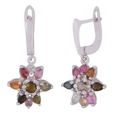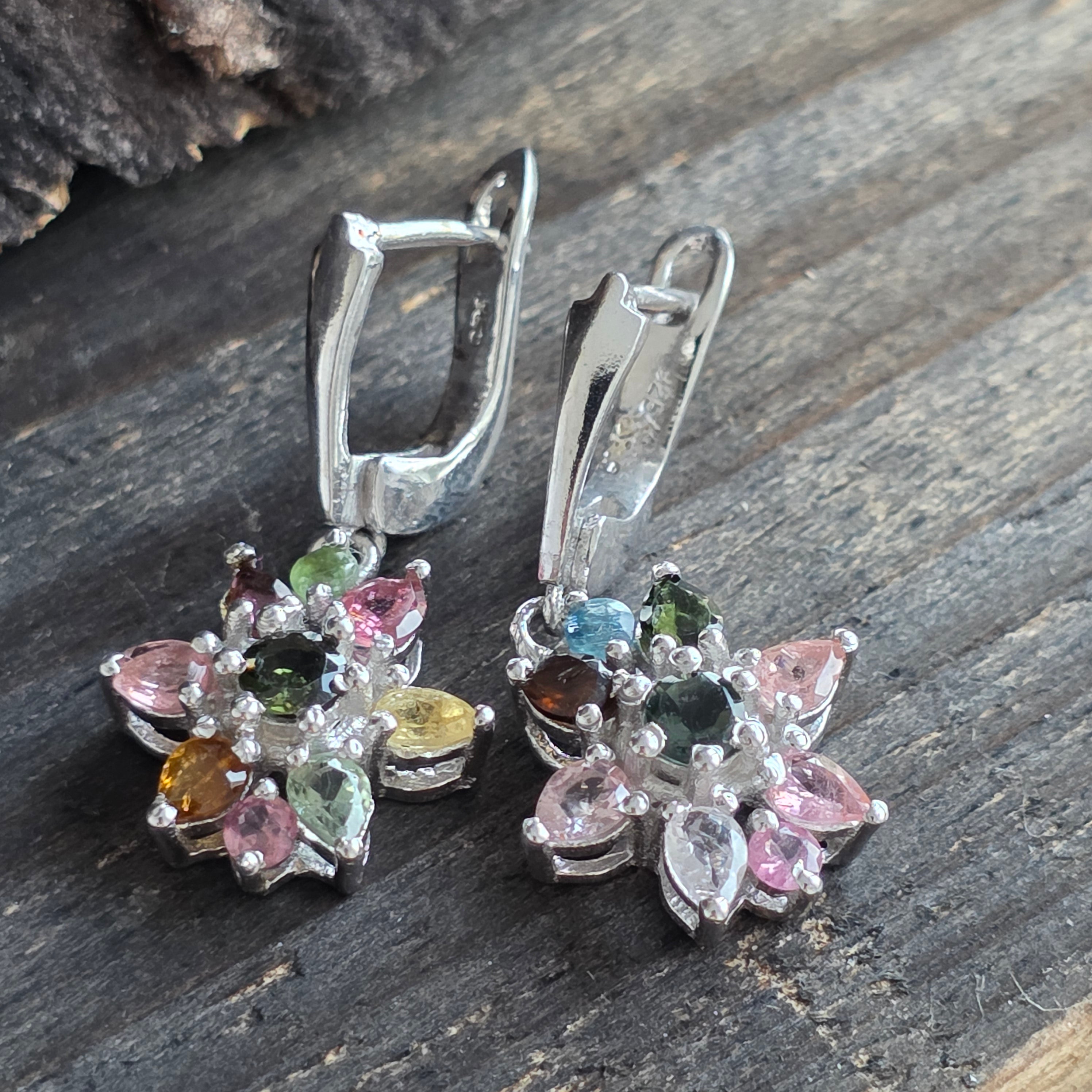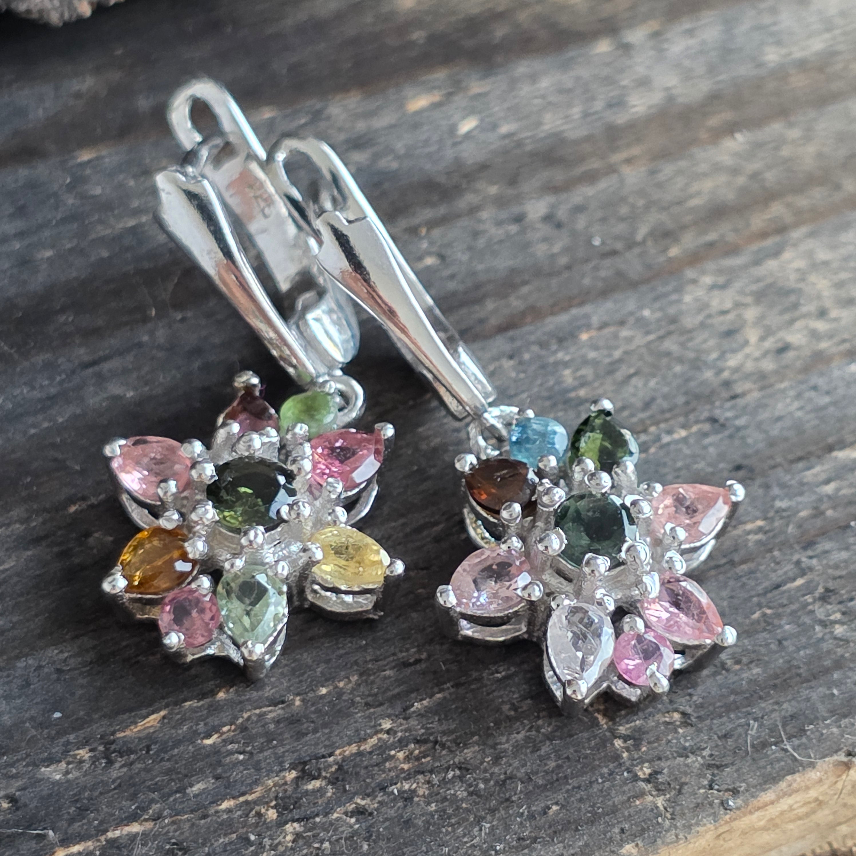 Acești cercei sunt realizați din argint solid 925, placat cu rodiu pentru un luciu de durată și protecție împotriva oxidării. Designul lor delicat, în formă de ciorchine floral, reunește turmaline multicolore atent șlefuite în forme ovale și rotunde, creând un joc armonios de nuanțe – de la roz și verde, până la galben și tonuri calde pământii.
