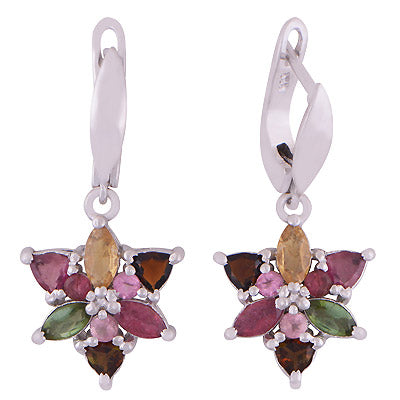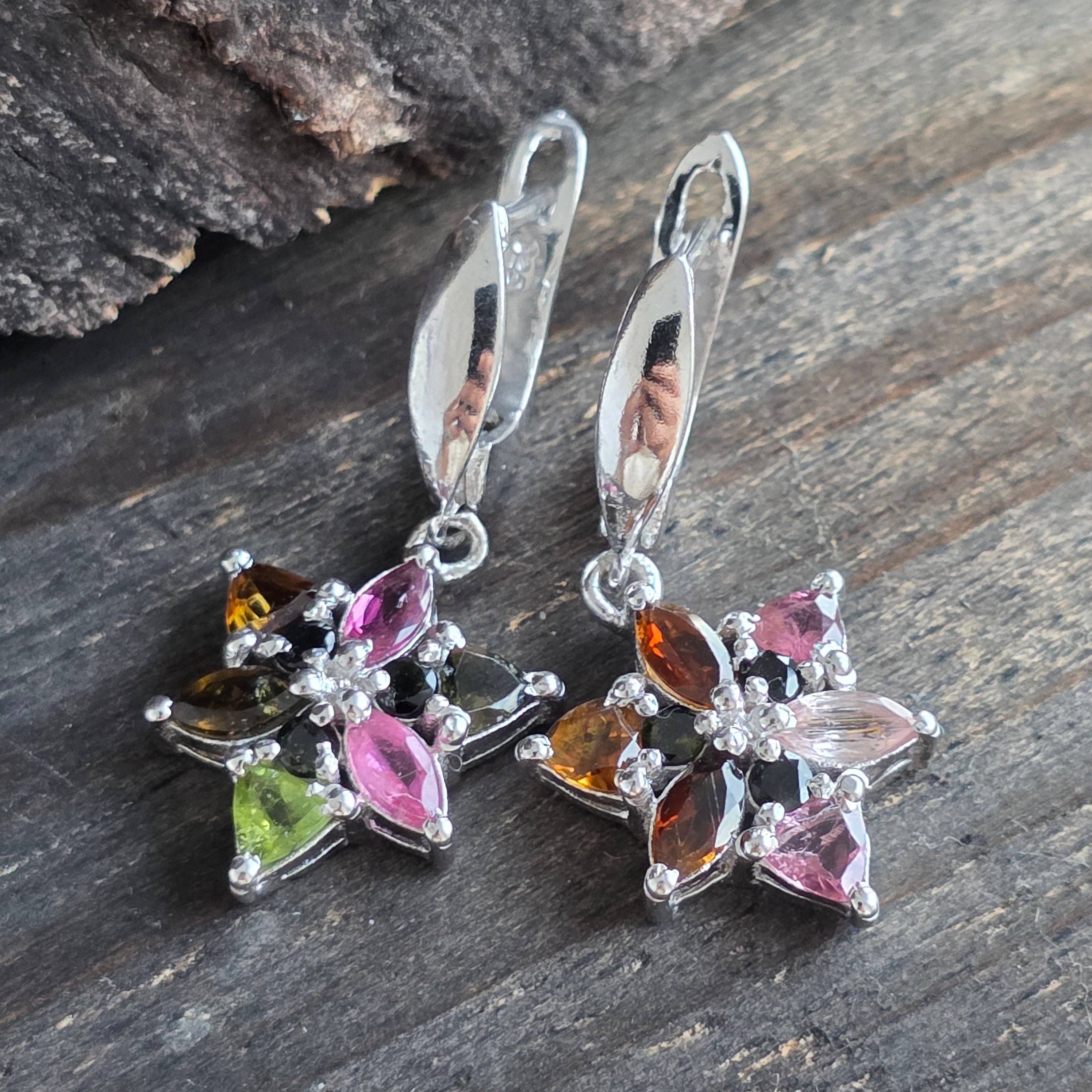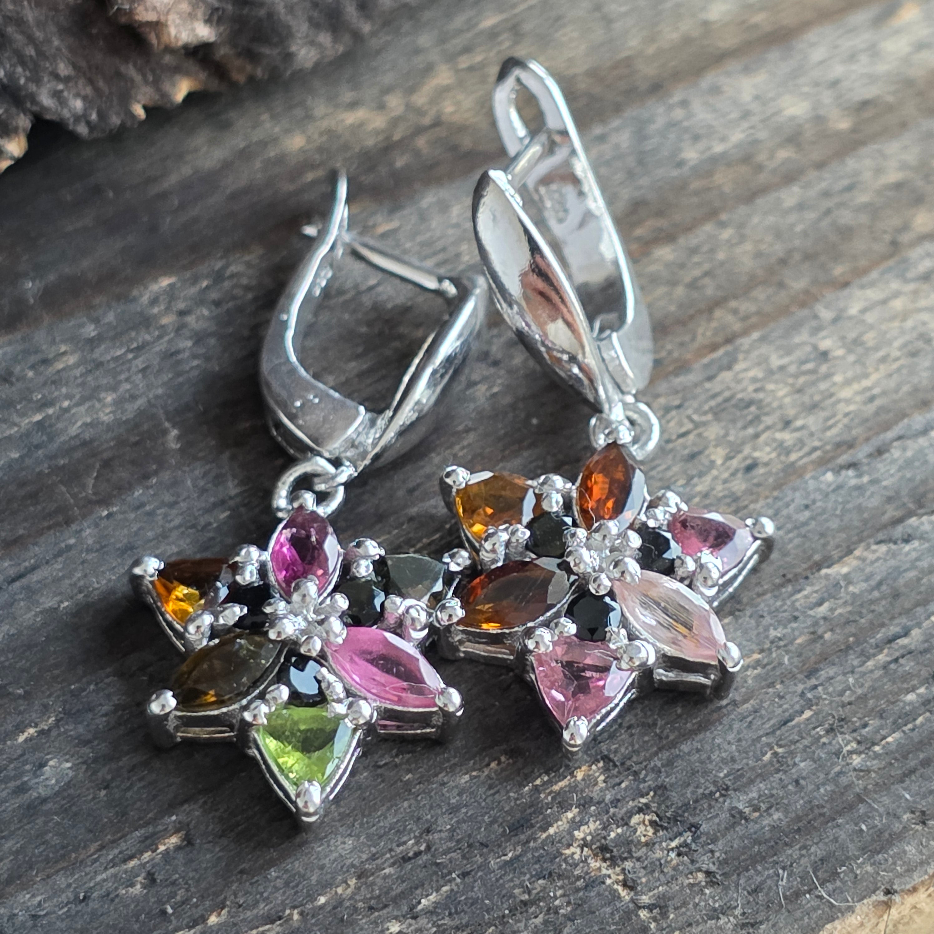 Acești cercei sunt realizați din argint solid 925, placat cu rodiu pentru un luciu de durată și protecție împotriva oxidării. Designul lor delicat, în formă de ciorchine floral, reunește turmaline multicolore atent șlefuite în forme ovale și rotunde, creând un joc armonios de nuanțe – de la roz și verde, până la galben și tonuri calde pământii.