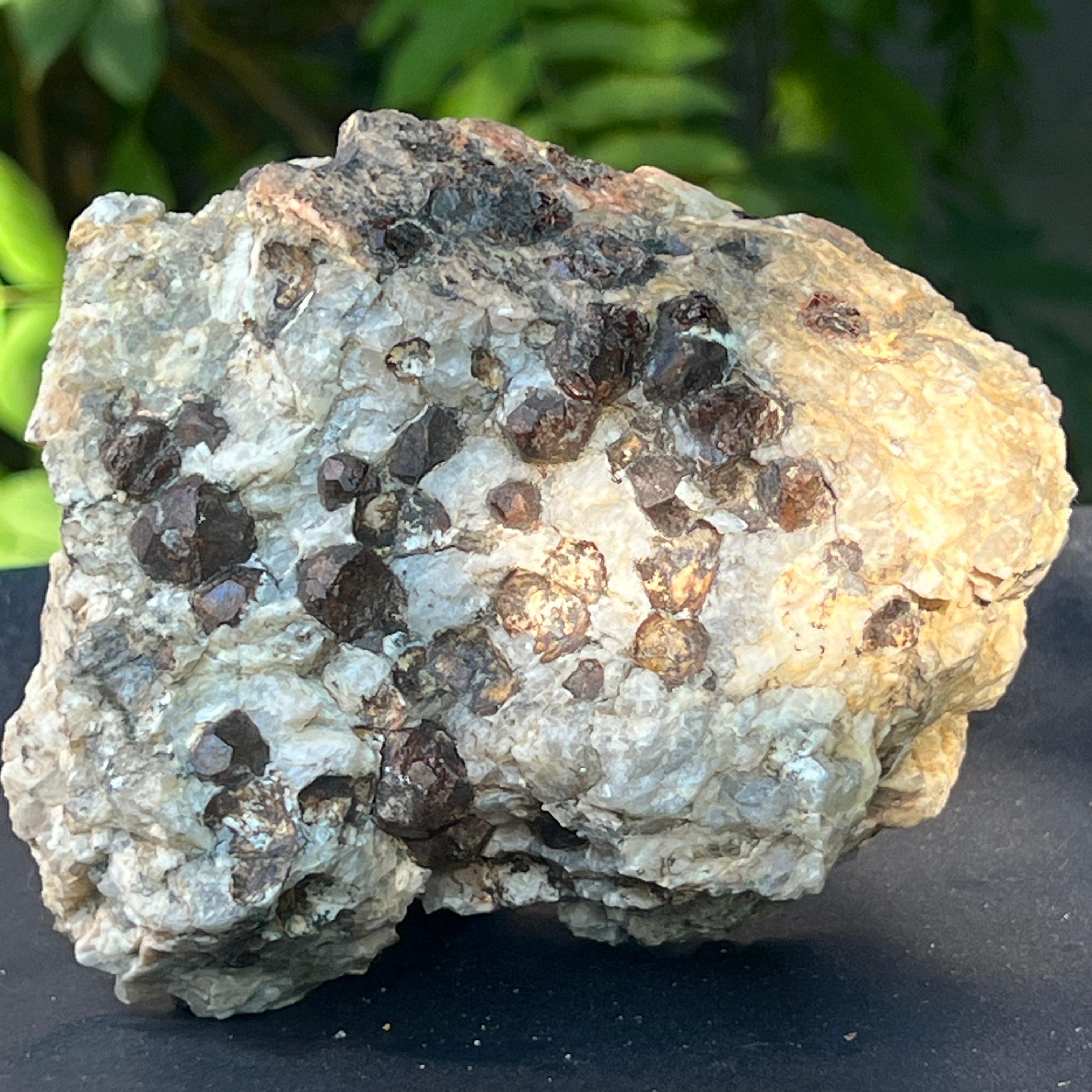 Cristalele de granat almandin, de culoare brun-roșcată, apar în mod natural încastrate în matricea de cuarț și feldspat, dezvăluind procesul geologic prin care s-au născut. Sub presiunea și căldura adâncurilor, aceste minerale s-au conturat ca martori ai transformărilor pământului. Matricea luminoasă scoate în evidență contrastul dintre roca-mamă și strălucirea profundă a granatelor.