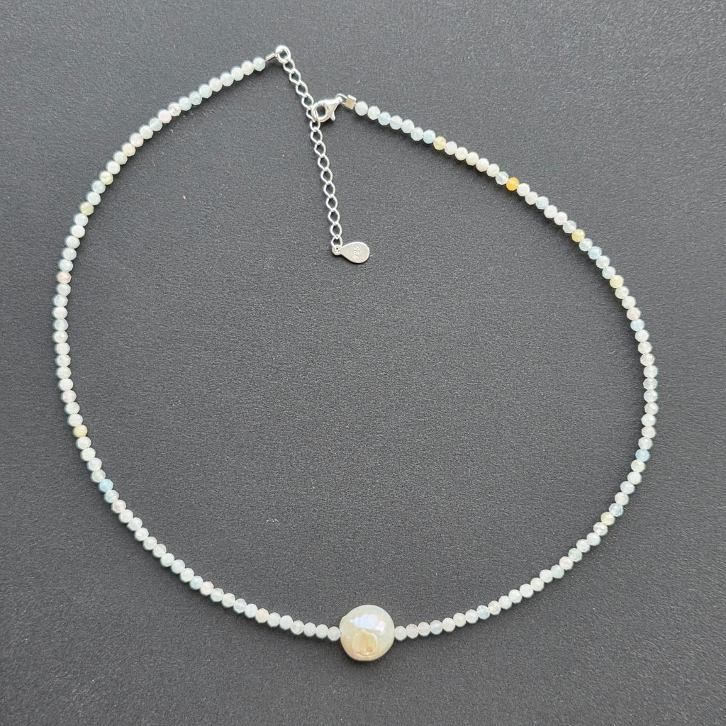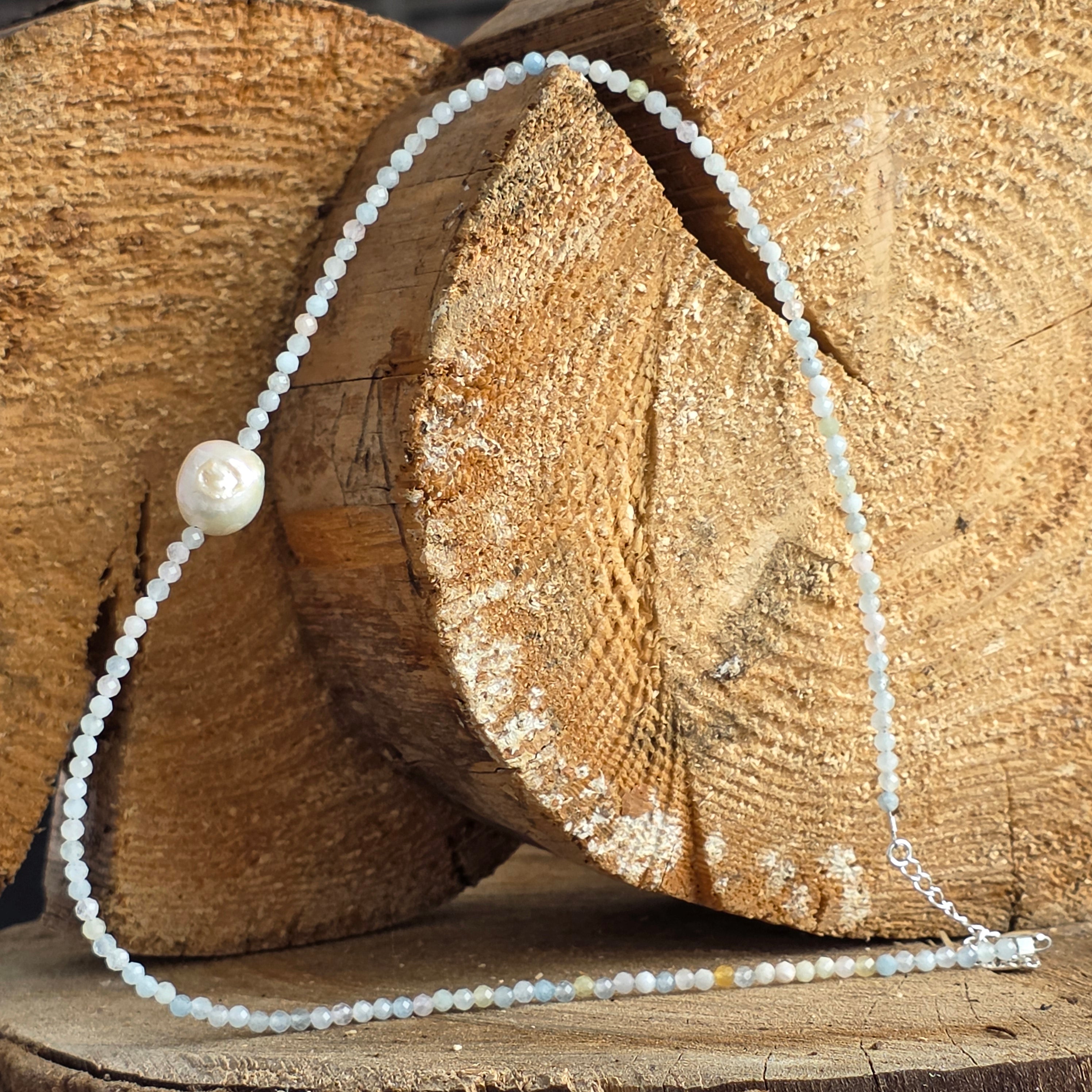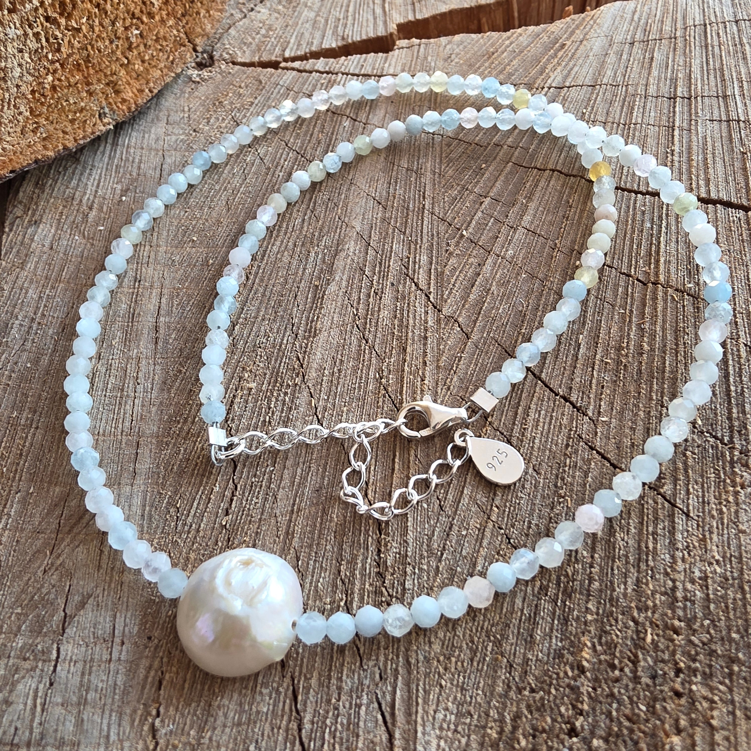 Acvamarinul este piatra clarității emoționale, a comunicării sincere și a încrederii în propriul adevăr. Se spune că liniștește inima, alungă anxietatea și aduce curaj blând. Perlele completează această vibrație prin grația lor atemporală – simboluri ale intuiției, blândeții și armoniei.