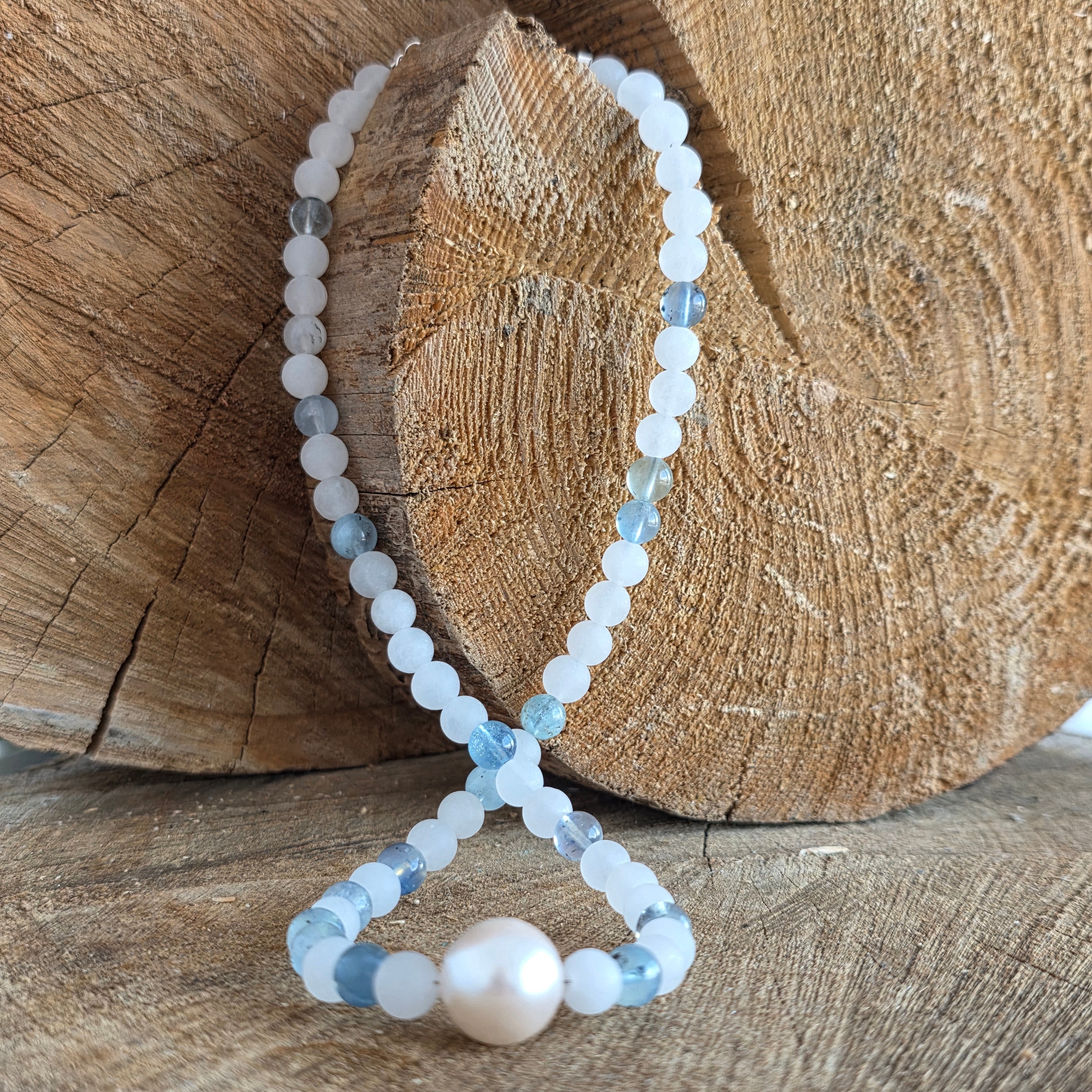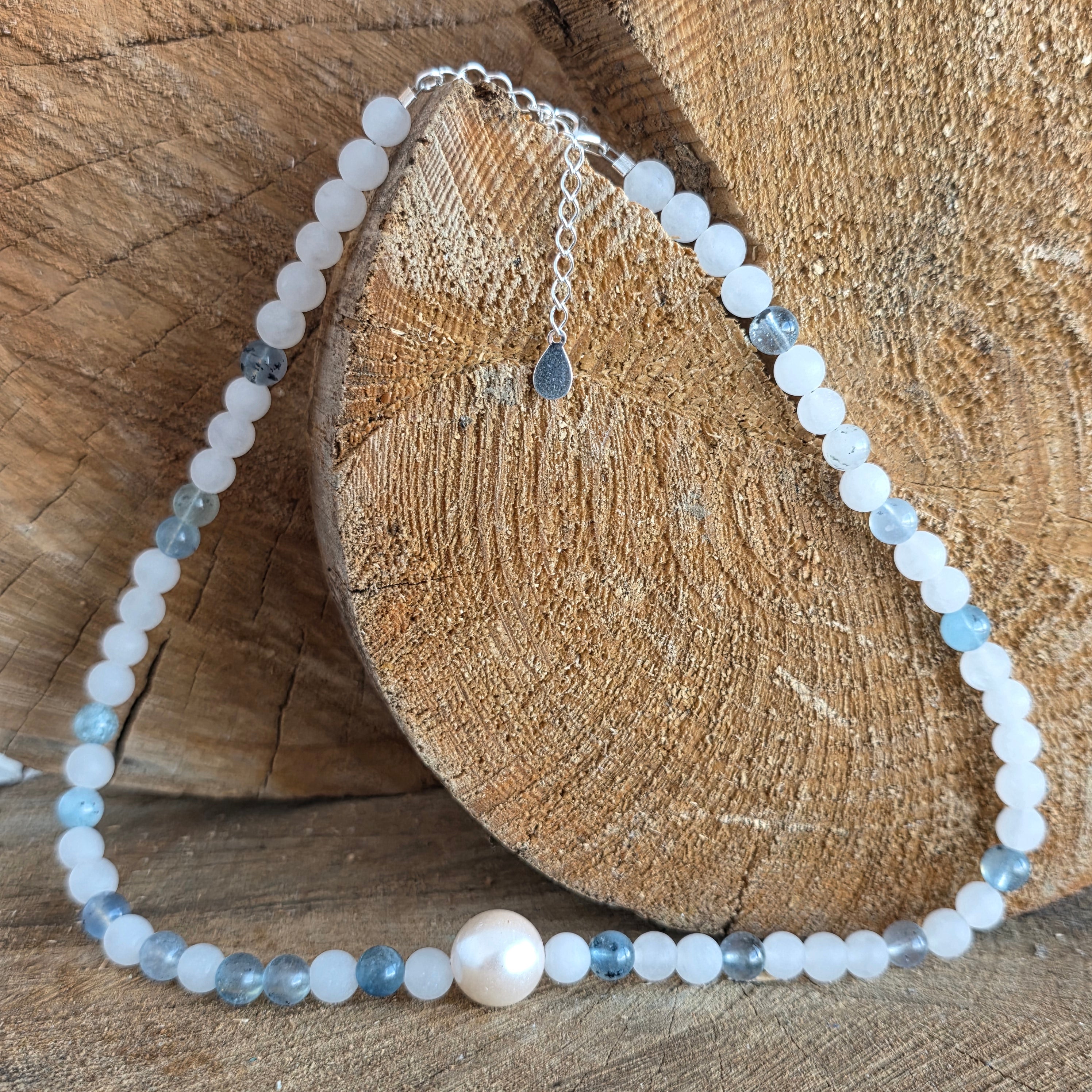 Elementul central este o perlă naturală cu diametrul de aproximativ 1 cm, care adaugă colierului un accent clasic și elegant. Contrastul subtil dintre strălucirea perlei, transparența acvamarinului și finisajul mat al jadului creează o compoziție armonioasă, ușor de purtat în orice context.