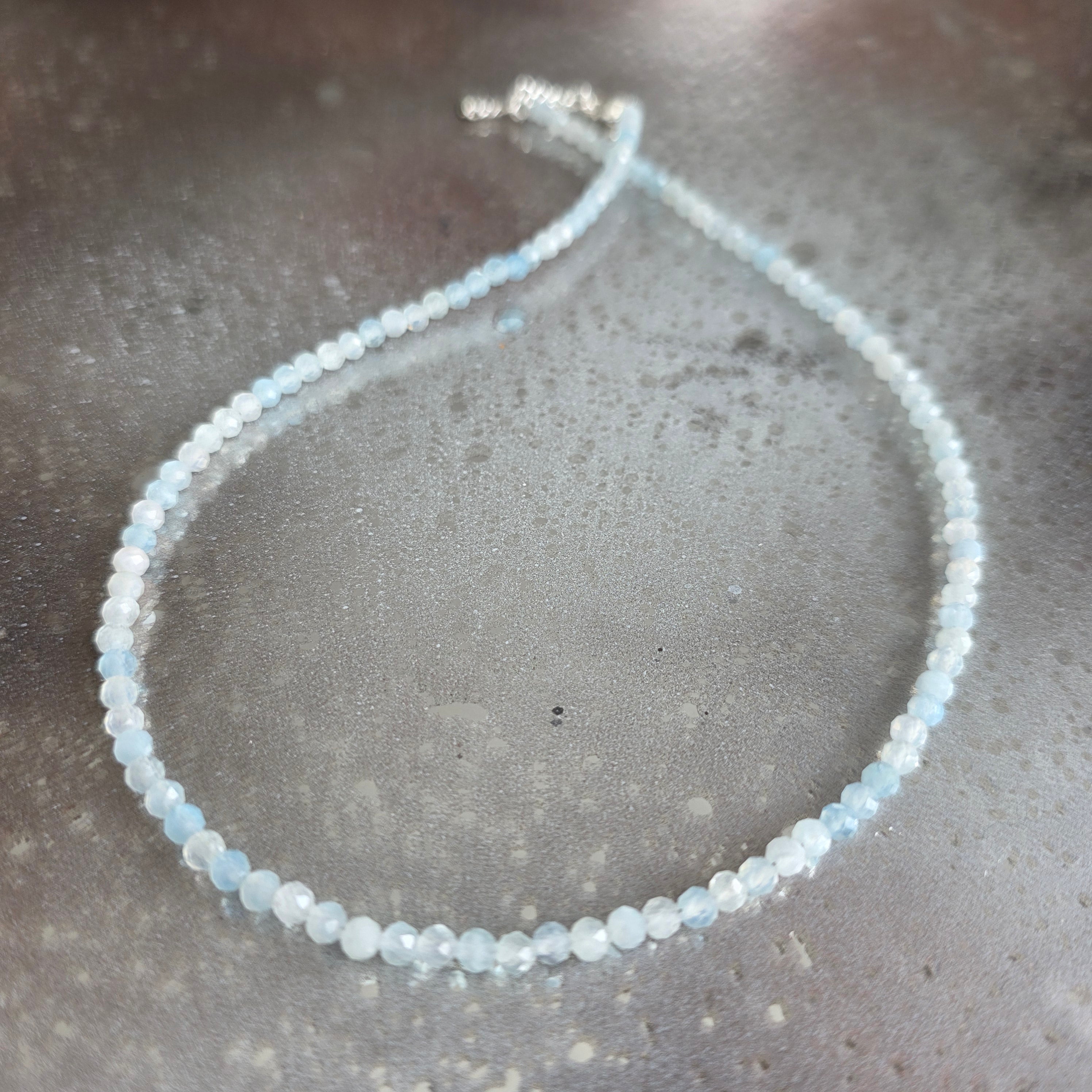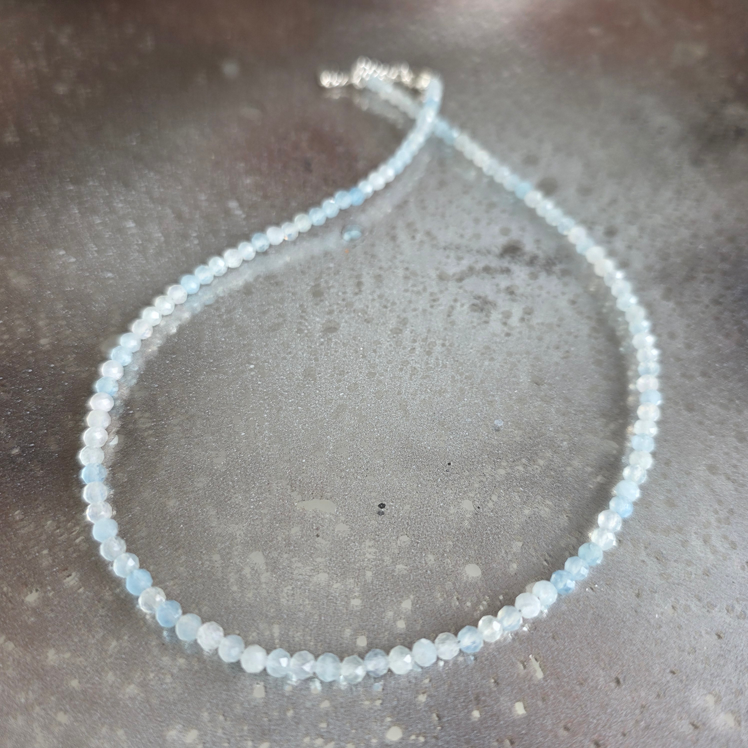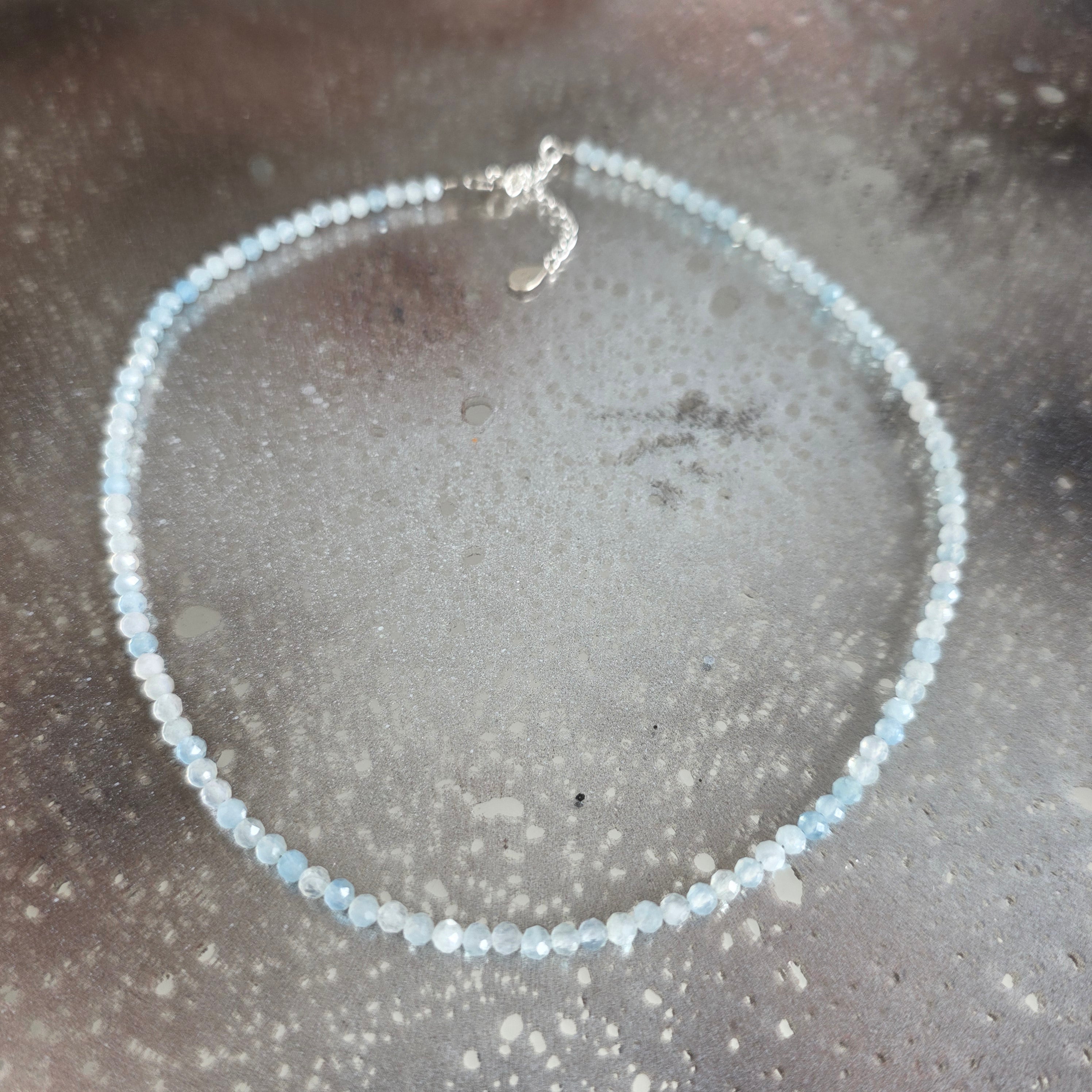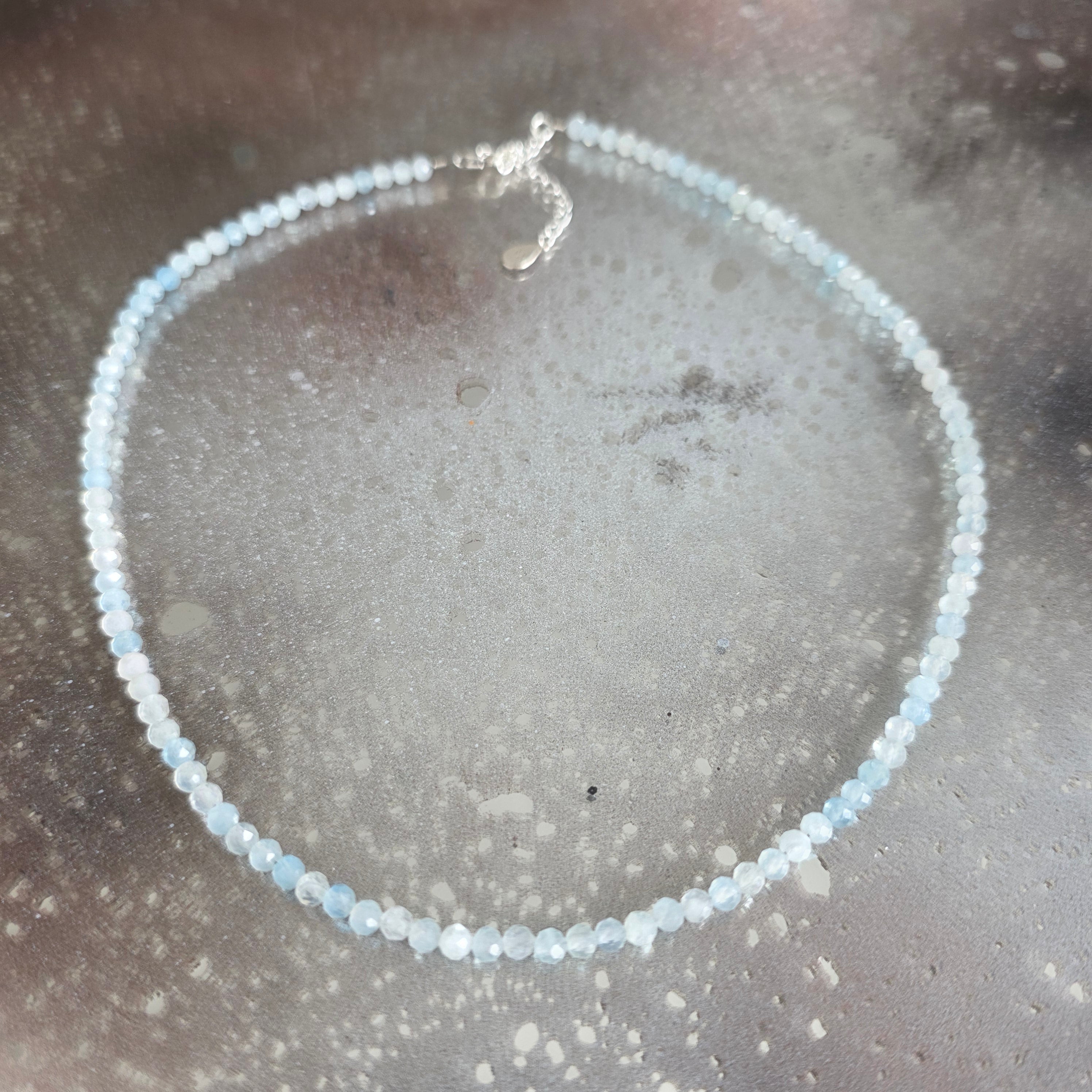 Mărgelele fațetate de acvamarin, de 4 mm, captează lumina în reflexii blânde și acvatice, ca și cum fiecare sferă ar conține o picătură de cer albastru sau o amintire de val.