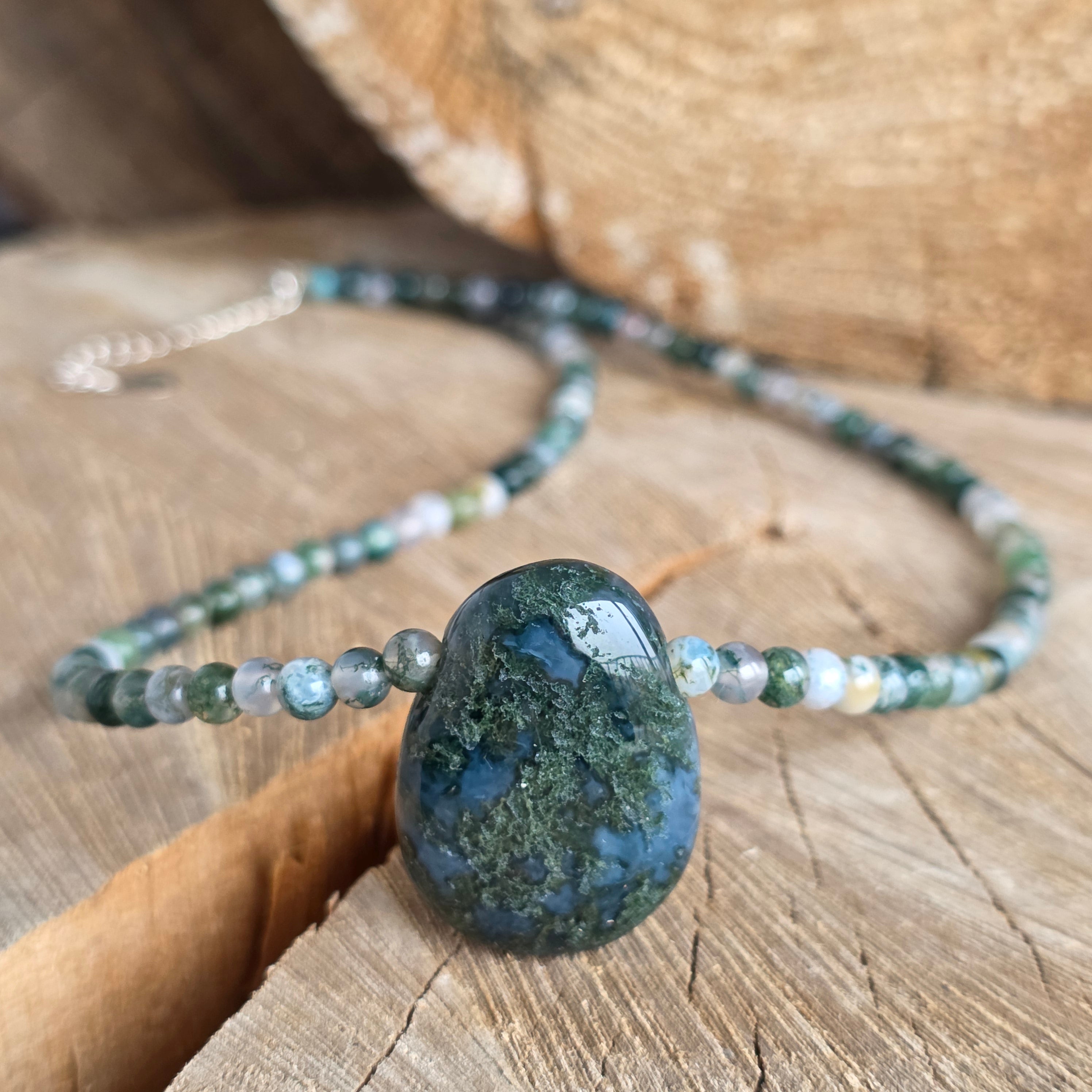 Un colier ca o pădure în miniatură, purtată la gât – verde, organic, plin de viață și mister. Mărgelele de agat muschi de 4 mm dezvăluie peisaje în miniatură: forme translucide, străbătute de vene verzui care amintesc de mușchi, frunze și rădăcini care pulsează în adânc.