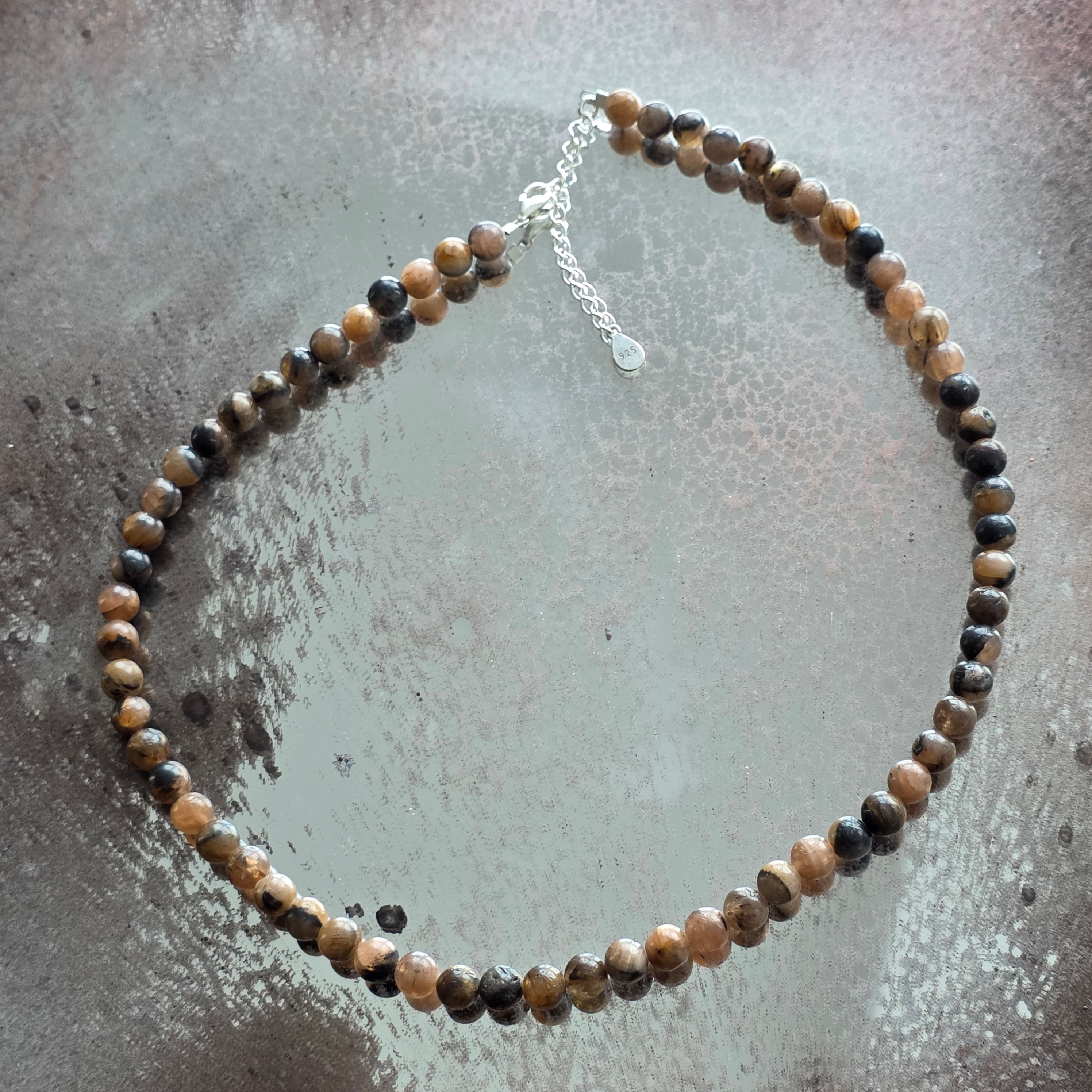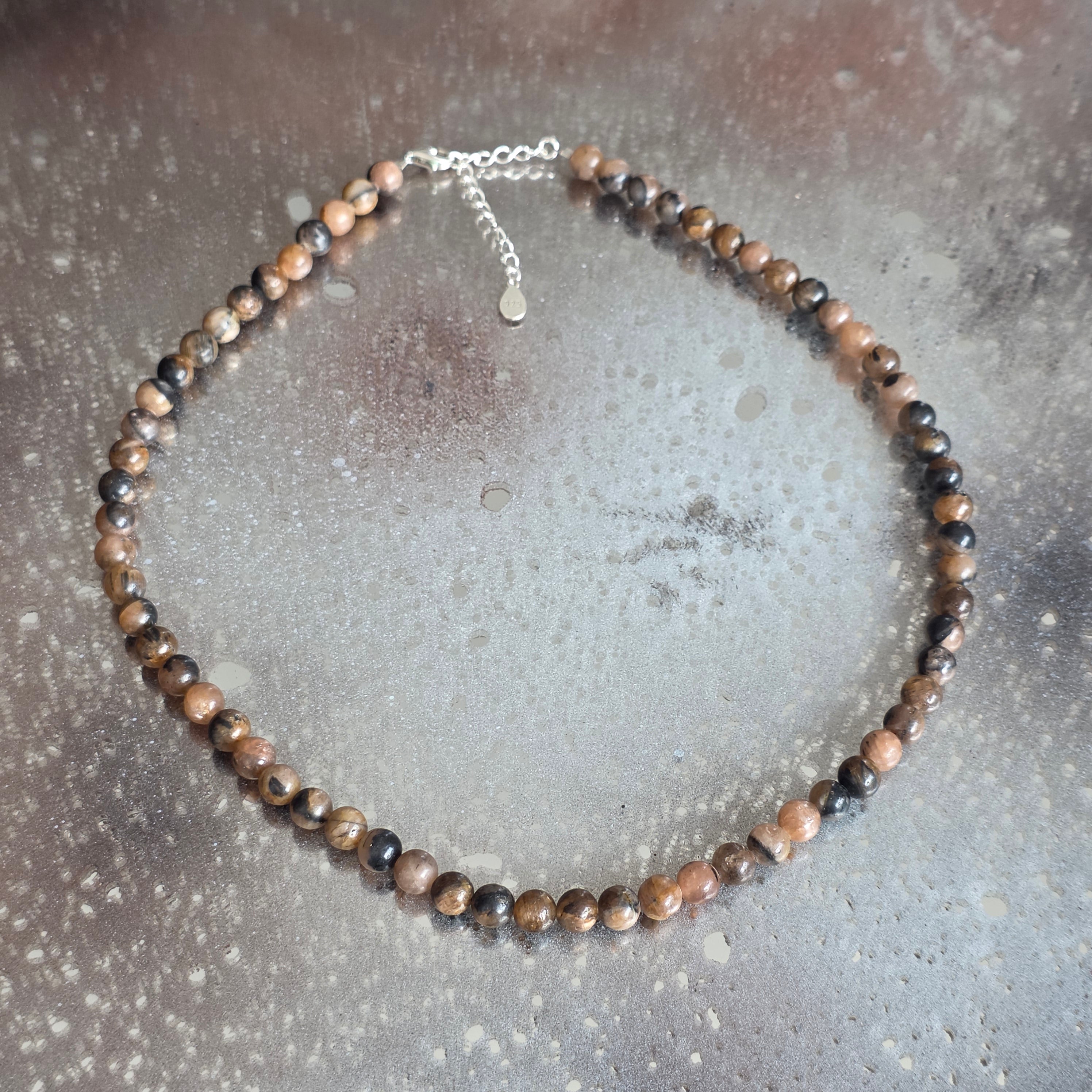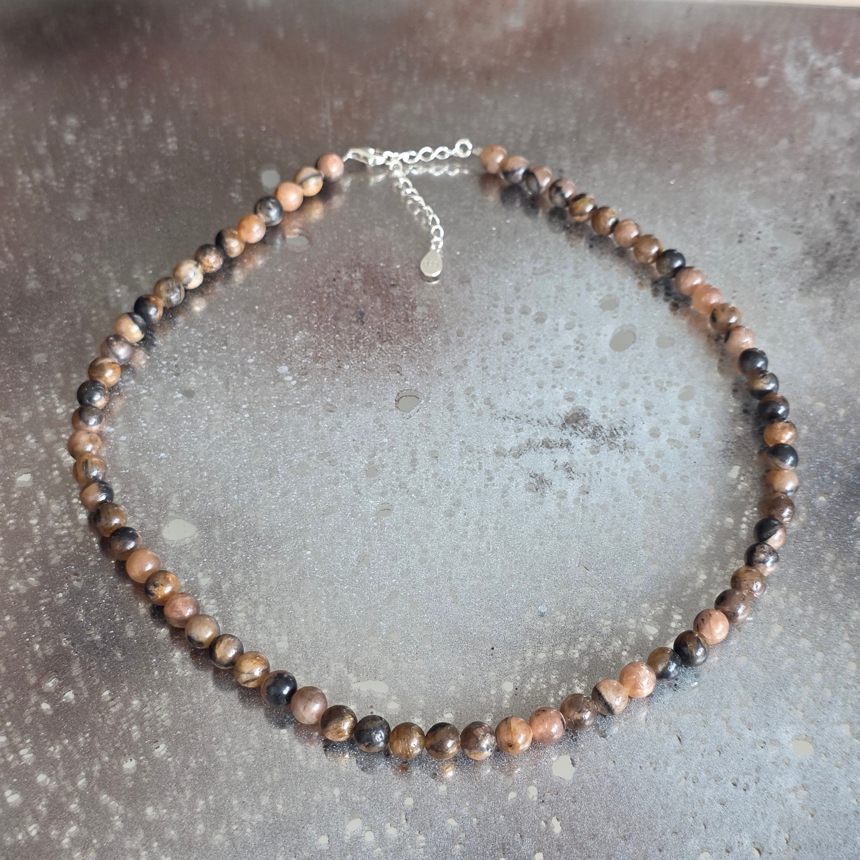 Un colier care poartă în sine amprenta sacrului și a misterului. Chiastolitul, cunoscut și ca „piatra crucii”, dezvăluie în structura sa naturală un simbol ancestral al protecției și al legăturii cu divinul. Mărgelele de 6 mm împletesc tonuri calde de maro, gri și ocru, fiecare purtând crucea ascunsă în miezul pietrei, ca o pecete a echilibrului dintre lumină și întuneric.