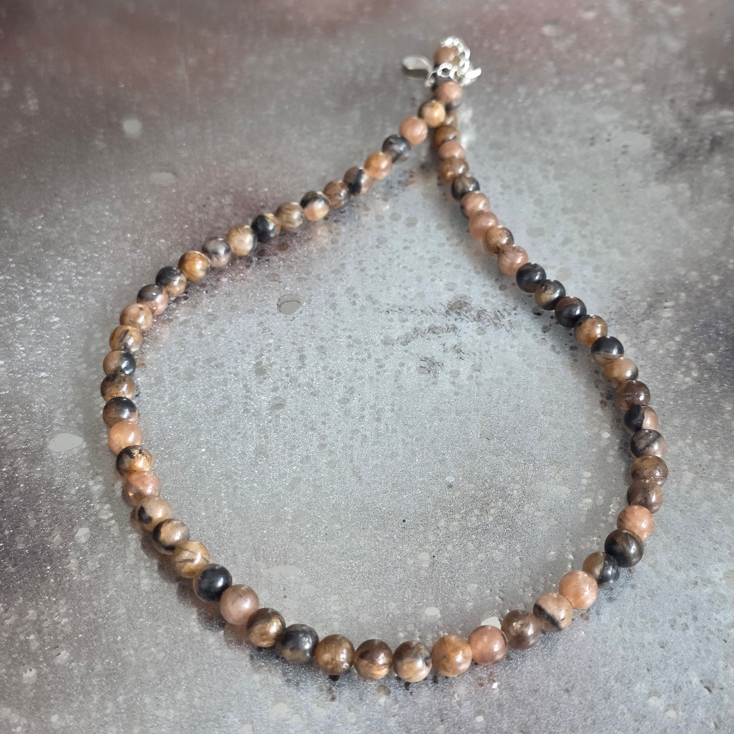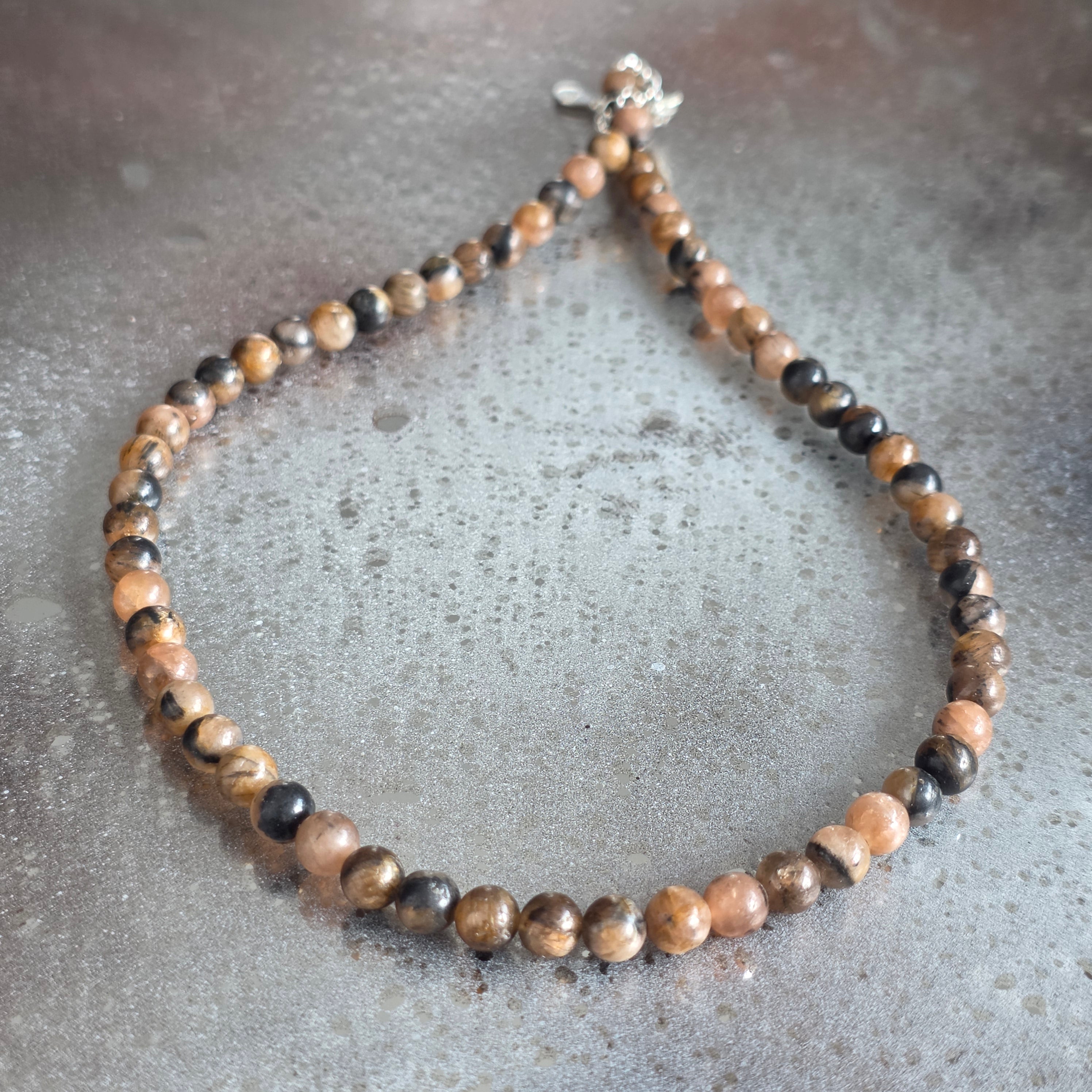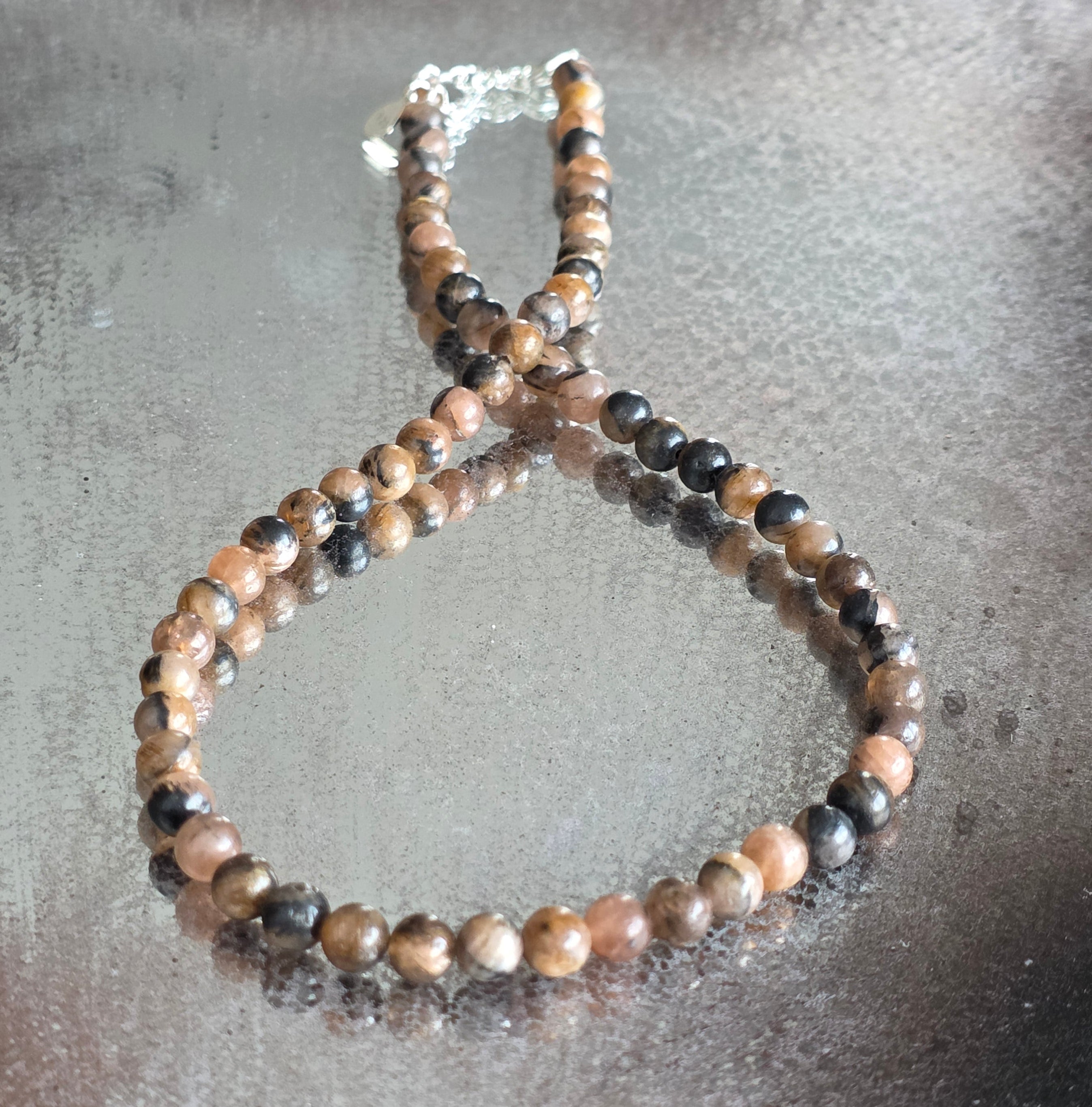 Un colier care poartă în sine amprenta sacrului și a misterului. Chiastolitul, cunoscut și ca „piatra crucii”, dezvăluie în structura sa naturală un simbol ancestral al protecției și al legăturii cu divinul. Mărgelele de 6 mm împletesc tonuri calde de maro, gri și ocru, fiecare purtând crucea ascunsă în miezul pietrei, ca o pecete a echilibrului dintre lumină și întuneric.